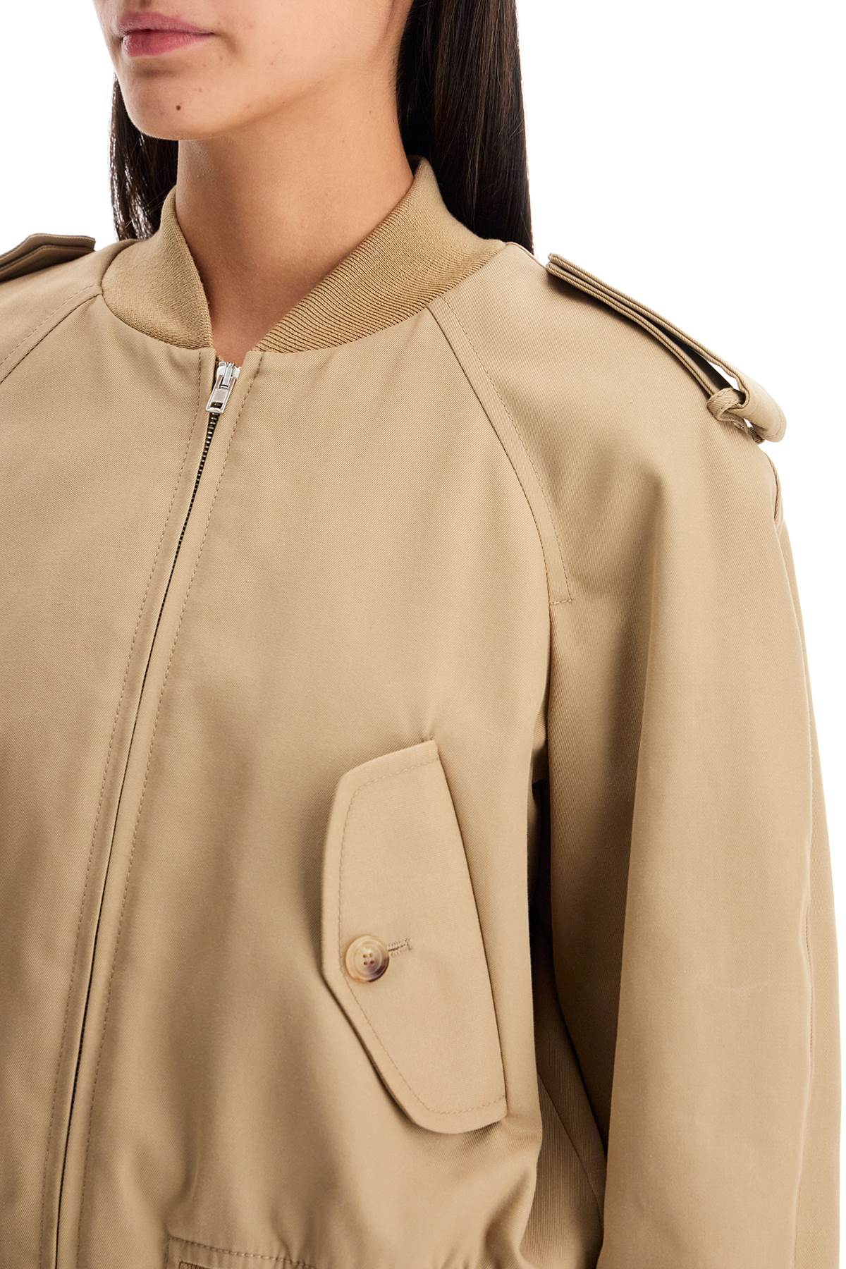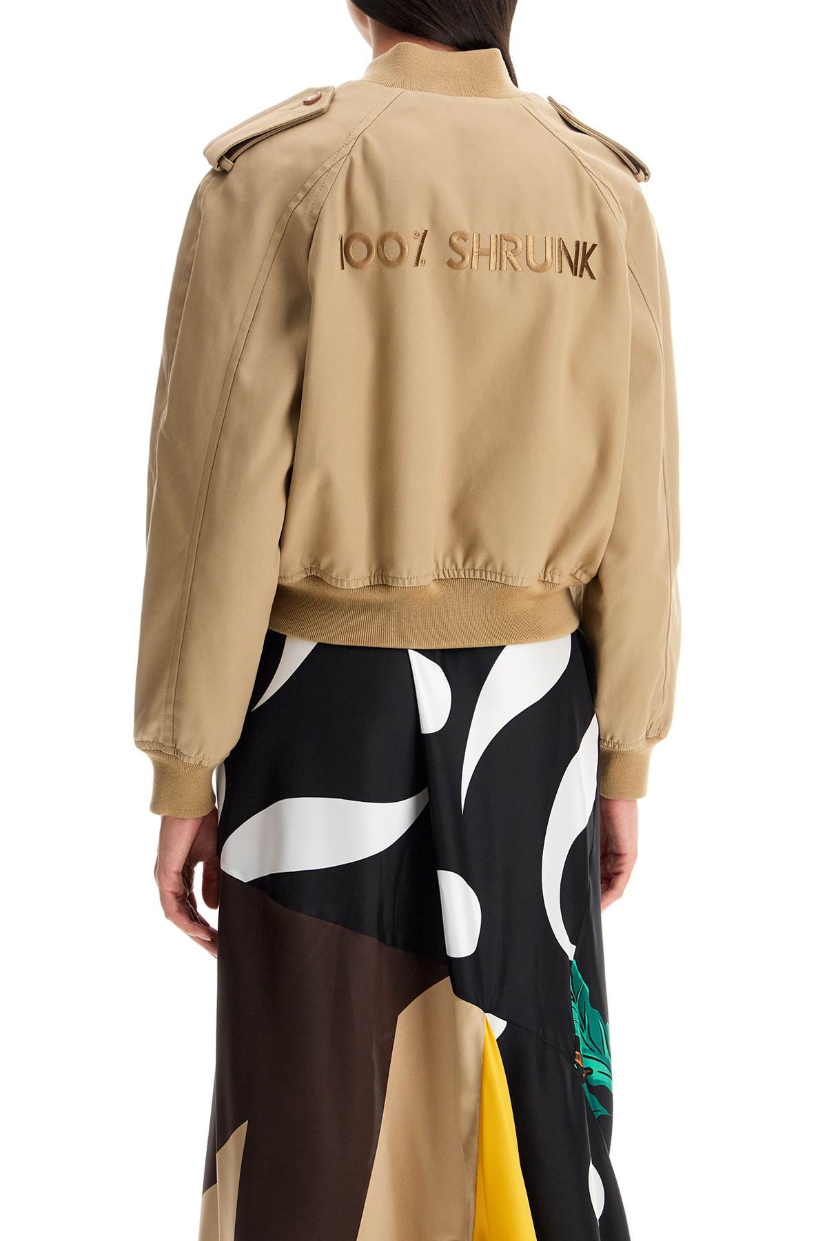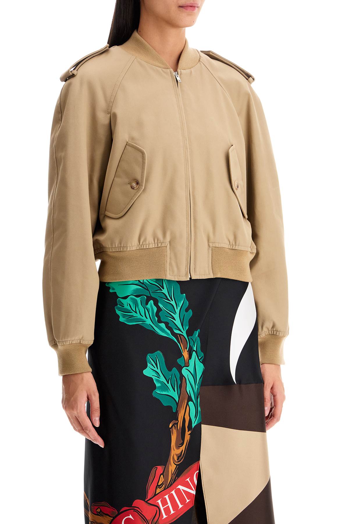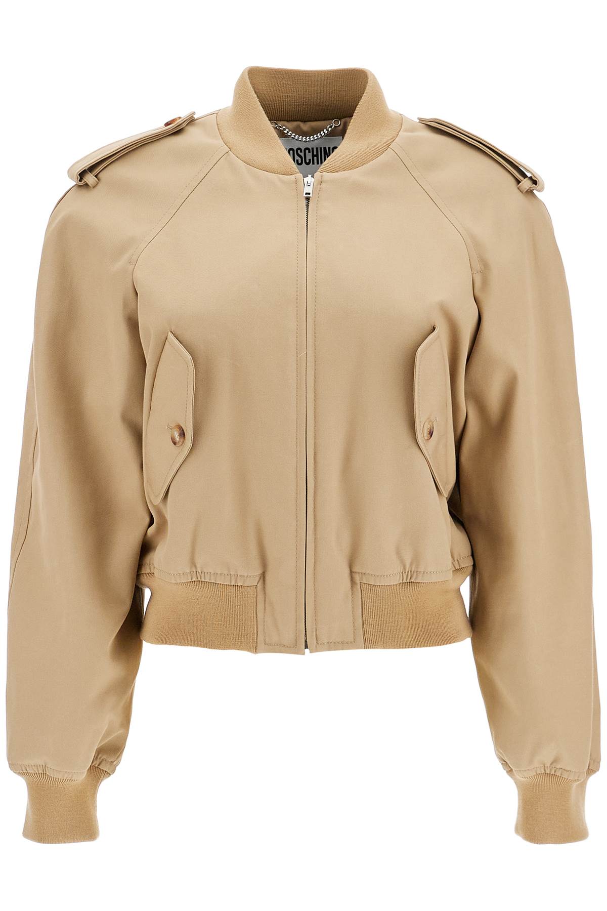 Featuring a trench coat-inspired look, this Moschino bomber jacket is made of cotton blend gabardine with raglan sleeves adorned with epaulettes on the shoulders. It also has a zip closure, side pockets with buttoned flaps, and ribbed edges. On the back, the garment is decorated with tonal lettering embroidery. Printed lining, regular fit. The model is 177 cm tall and wears size IT 40.