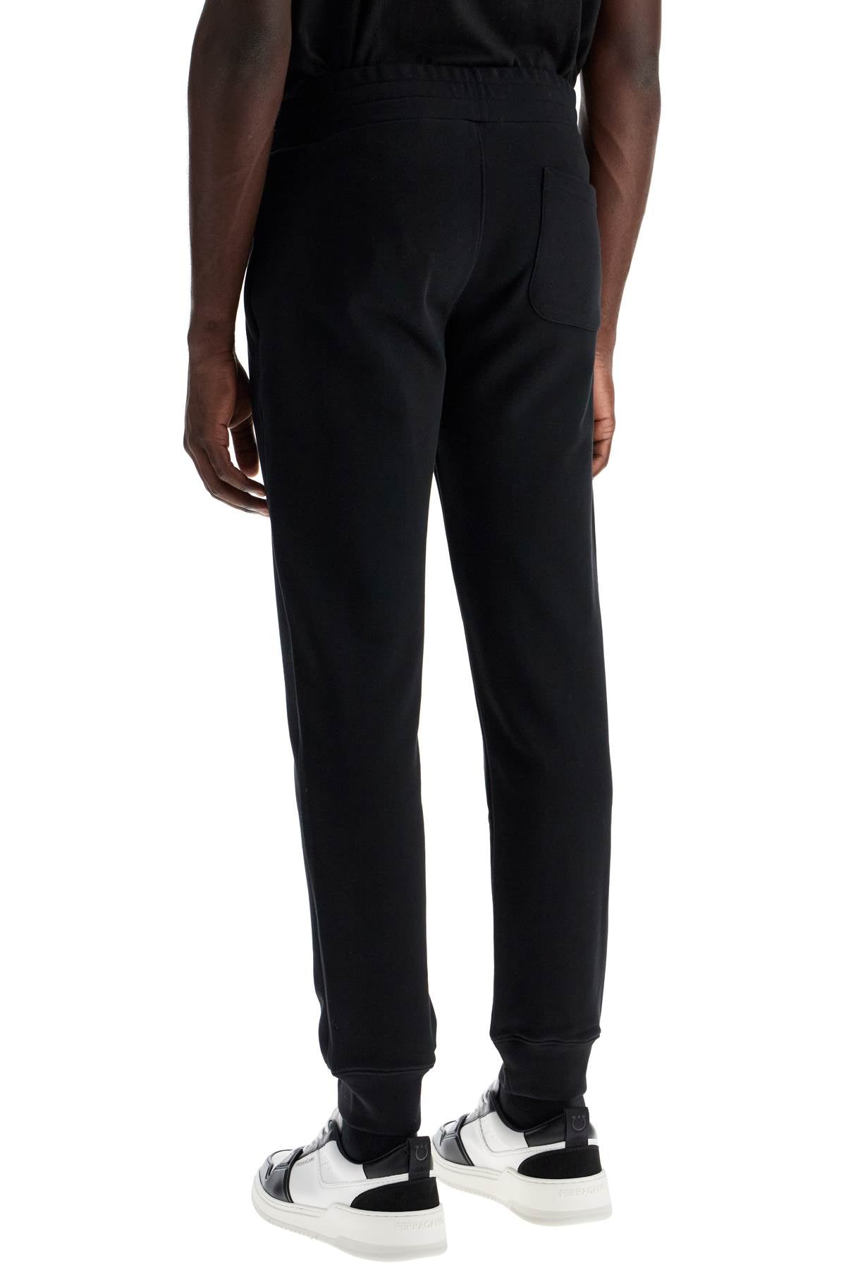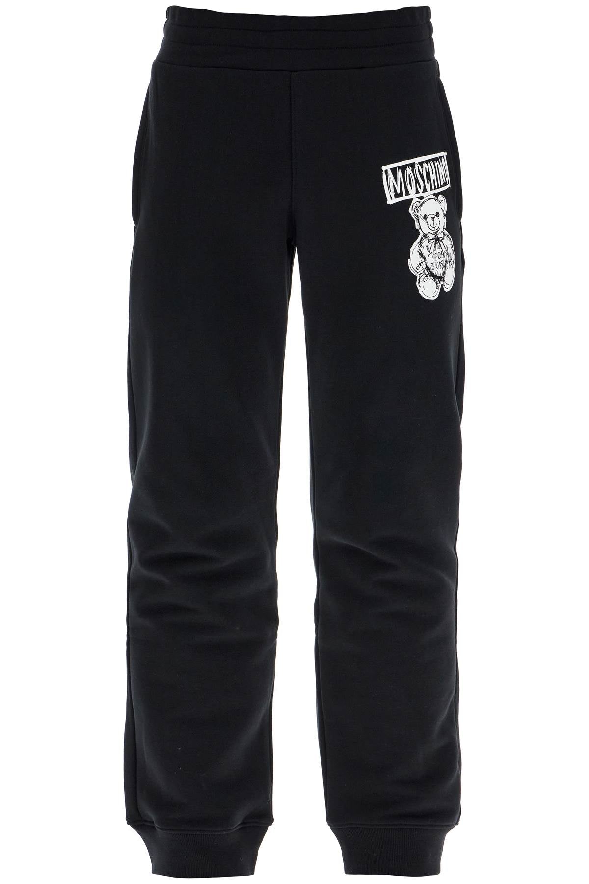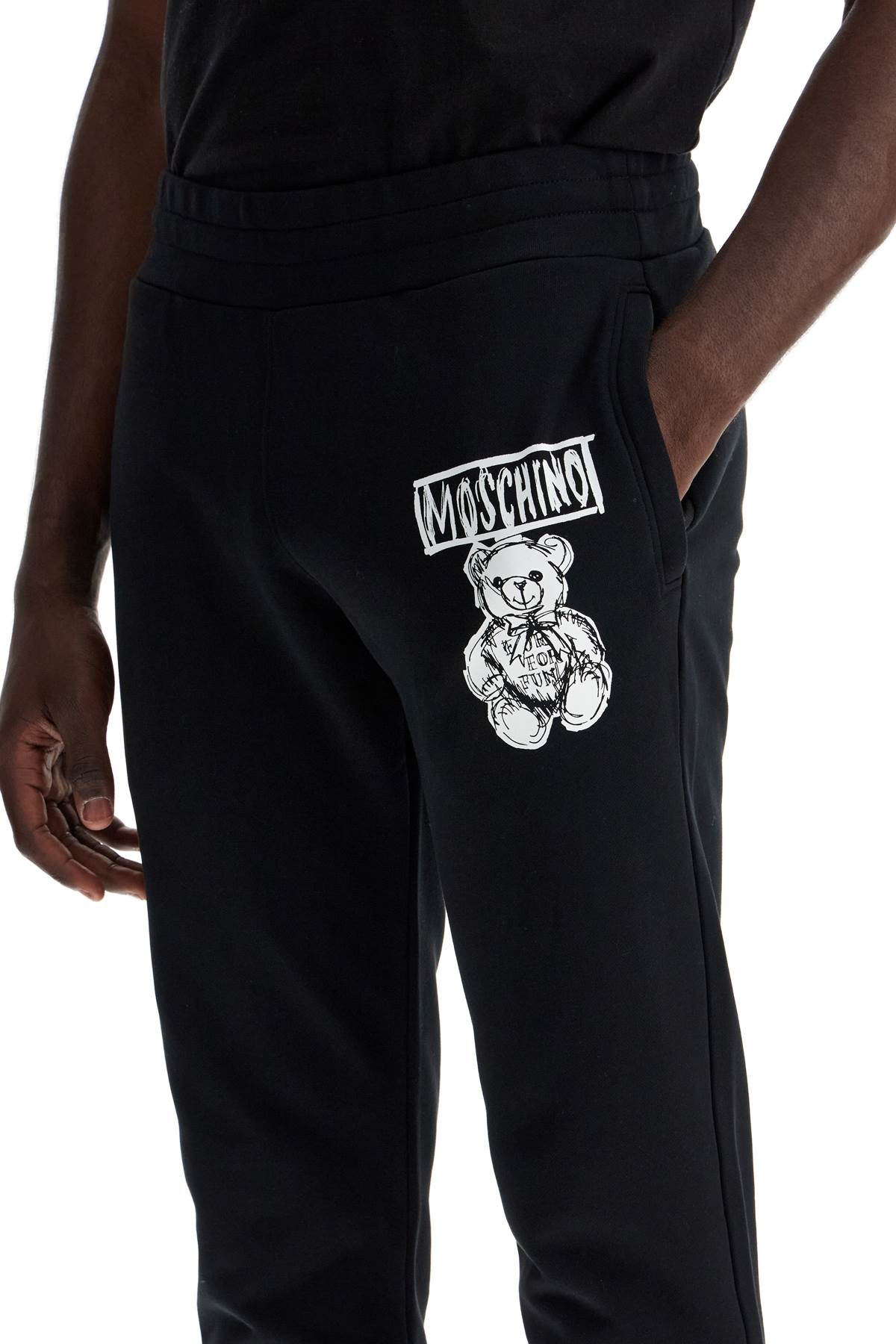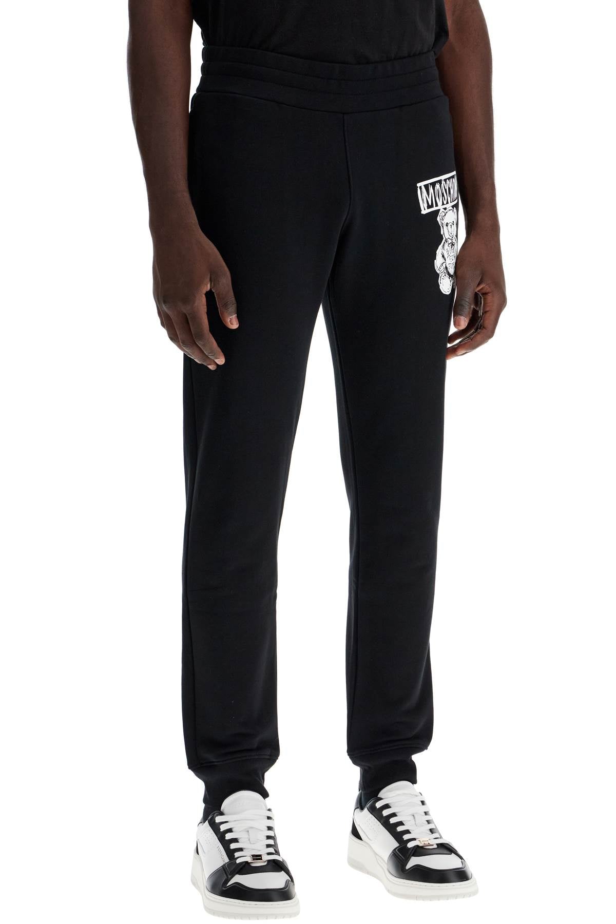 These jogger pants are made of brushed cotton jersey and feature a Moschino Teddy Bear print with a hand-drawn effect. The waist is adjustable with an internal drawstring, and there are zippered pockets in the side seams as well as a patch pocket on the back. The model is 187 cm tall and wears an Italian size 48.