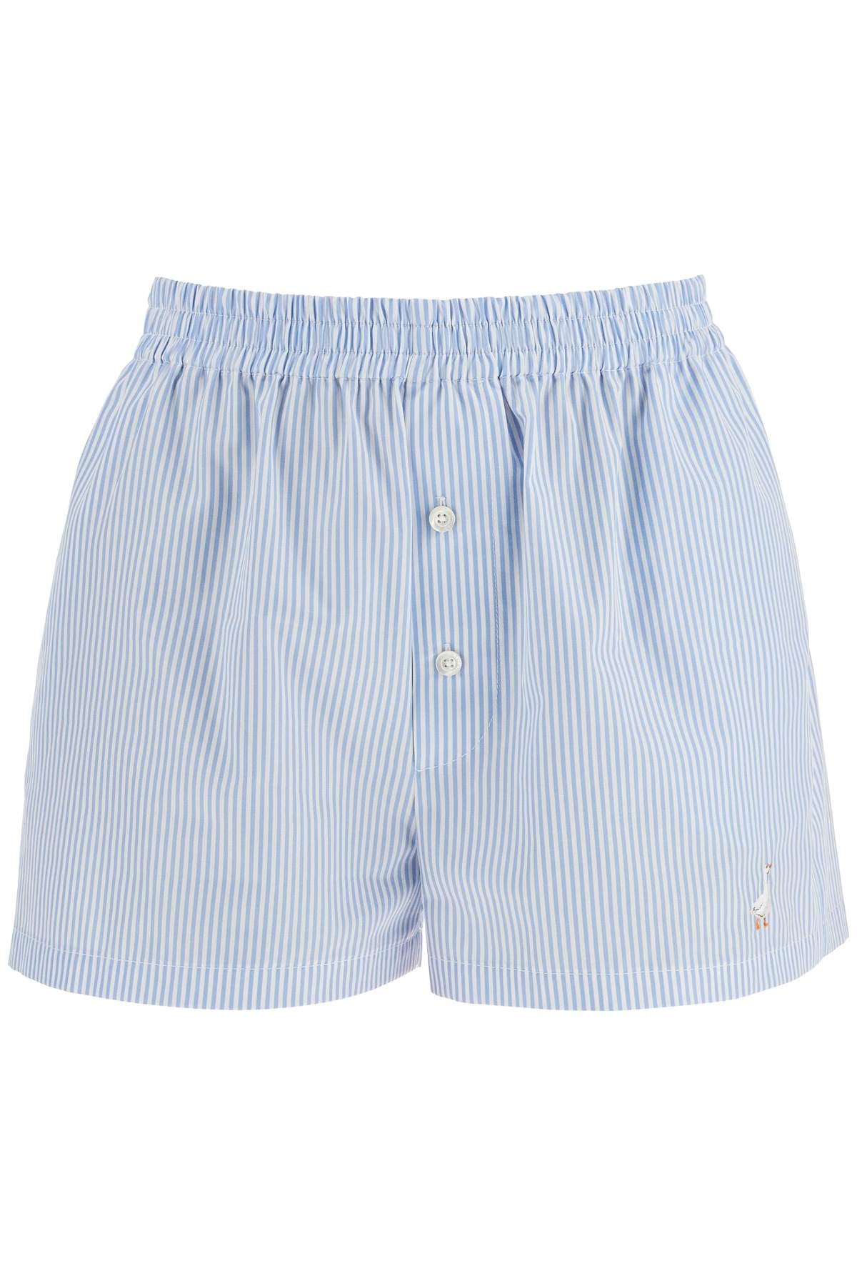 Moschino women's pants in light blue stripes for Spring Summer 2025. Made of cotton with high waist and loose fit. Italian elegance and comfort for every occasion. Made in Italy with embroidered logo.