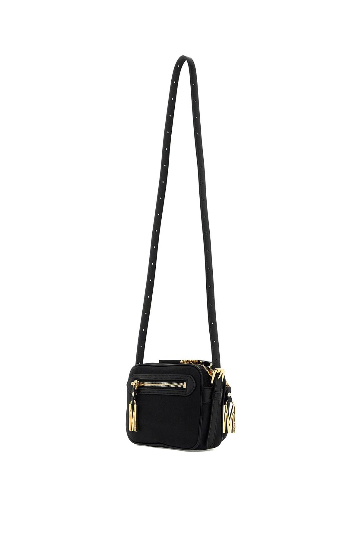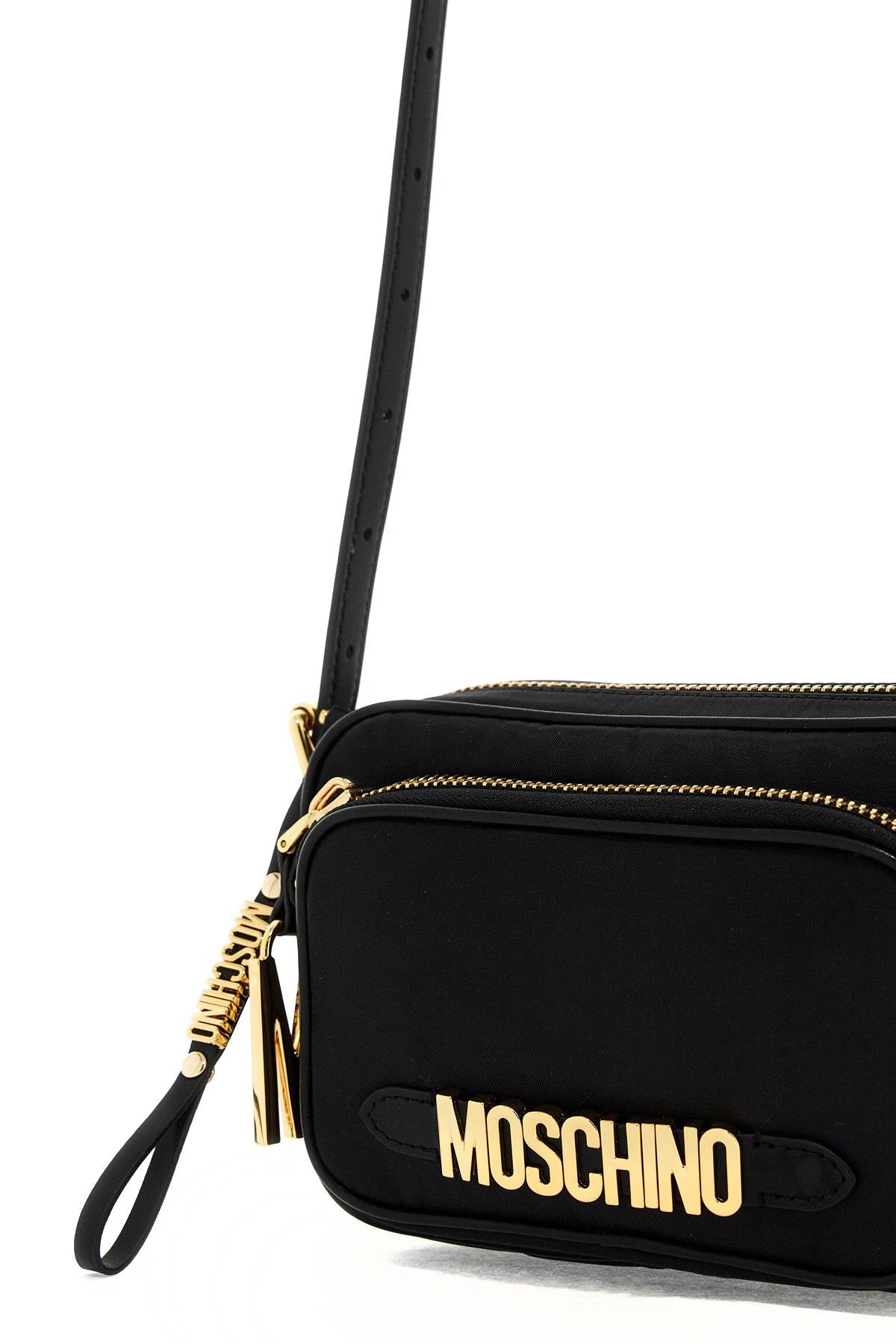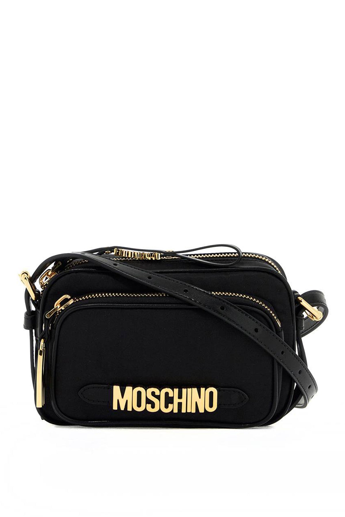 This Moschino mini crossbody bag is made of nylon and features a gold metal logo on the front pocket and zipper pulls. It has leather trim, a main compartment lined in fabric with a card slot, an additional back pocket with a zip closure, and an adjustable and removable leather shoulder strap. The hardware is finished in gold metal. Size and Fit - Bag Length = 19 cm, Bag Height = 13 cm, Bag Weight = 5 cm,