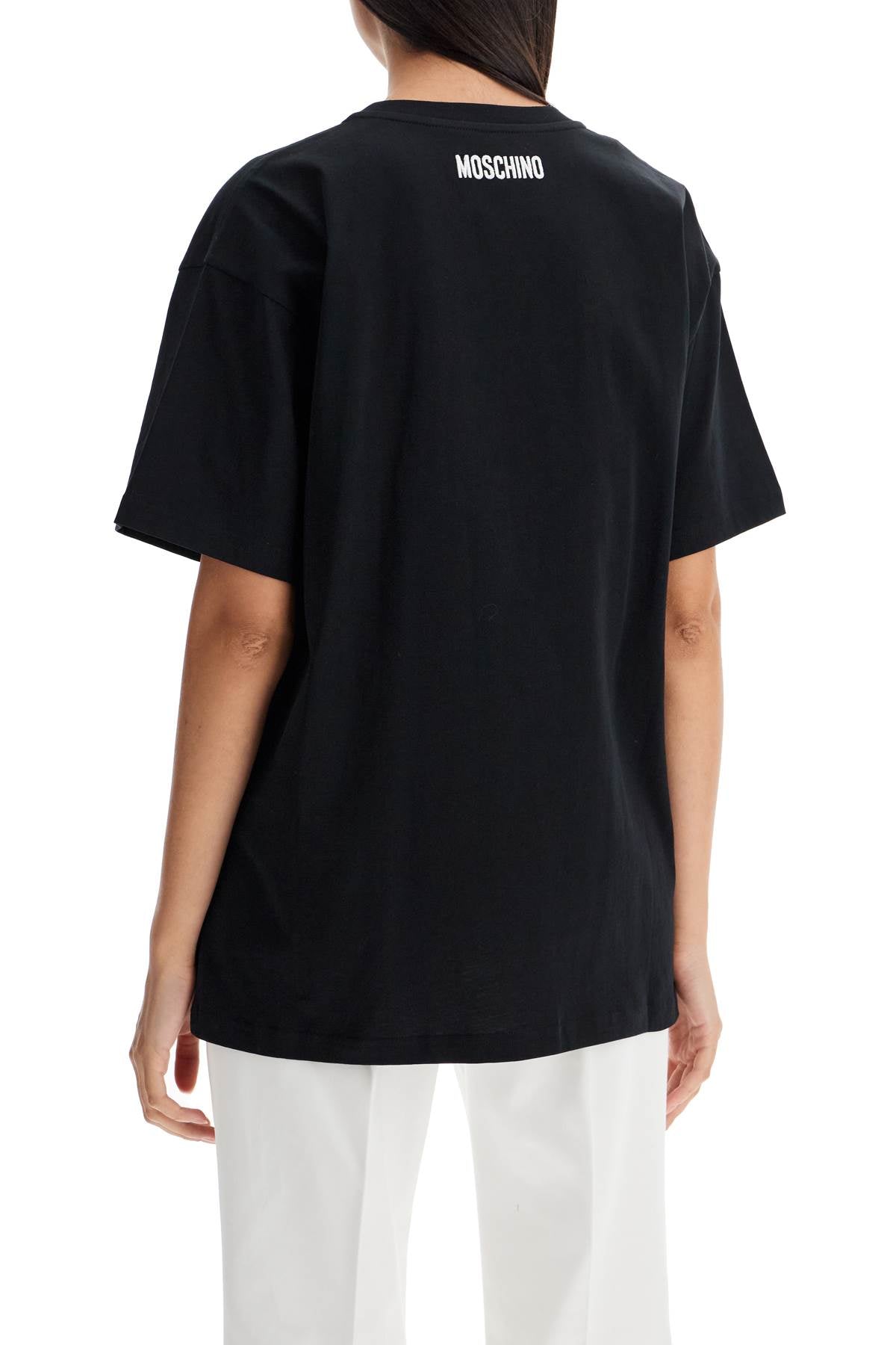 This Moschino crew neck T-shirt features an oversized fit and is made of pure cotton jersey. It has contrasting lettering embroidery on the front and a logo embroidered on the back of the collar. The model is 177 cm tall and wears size XS.
