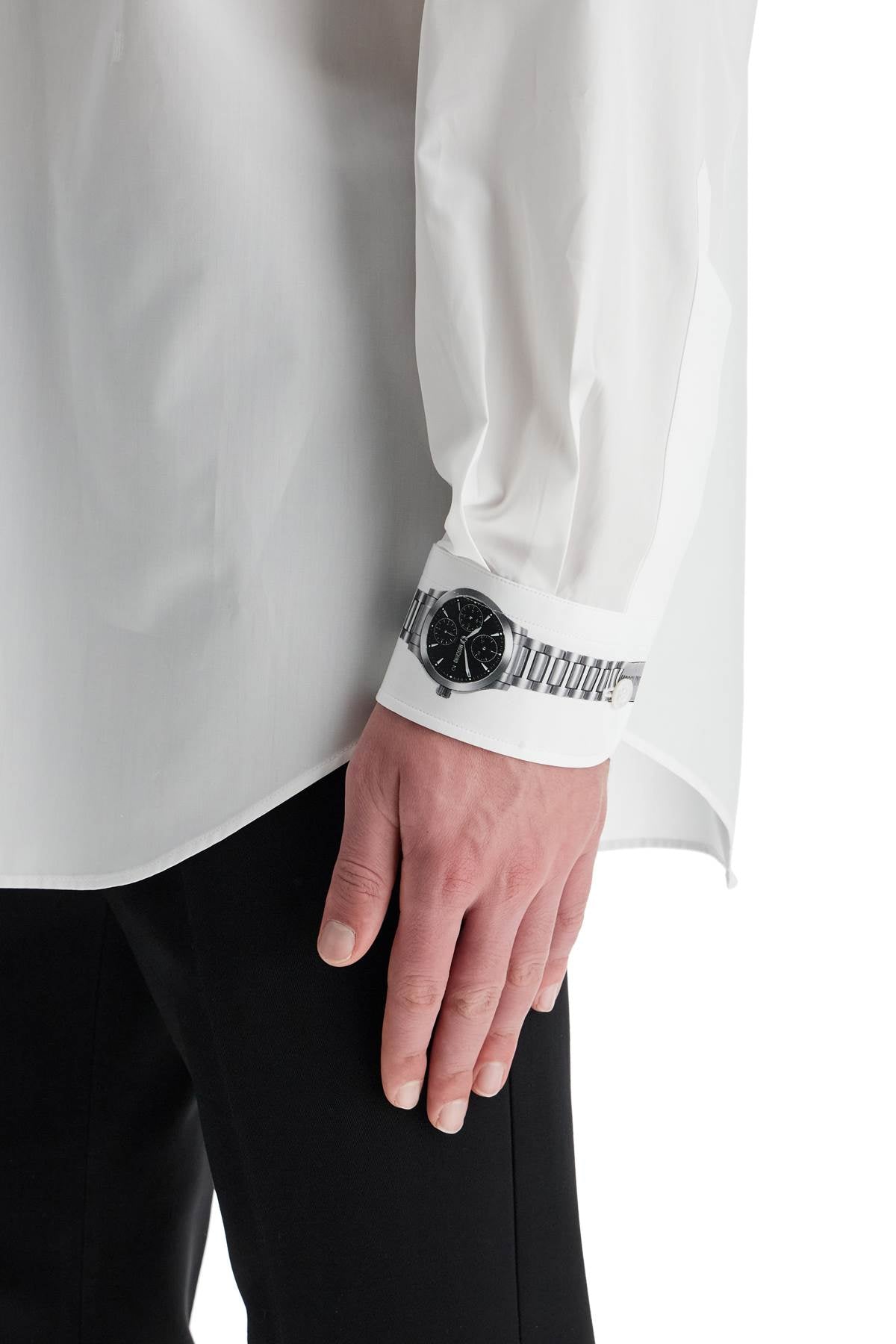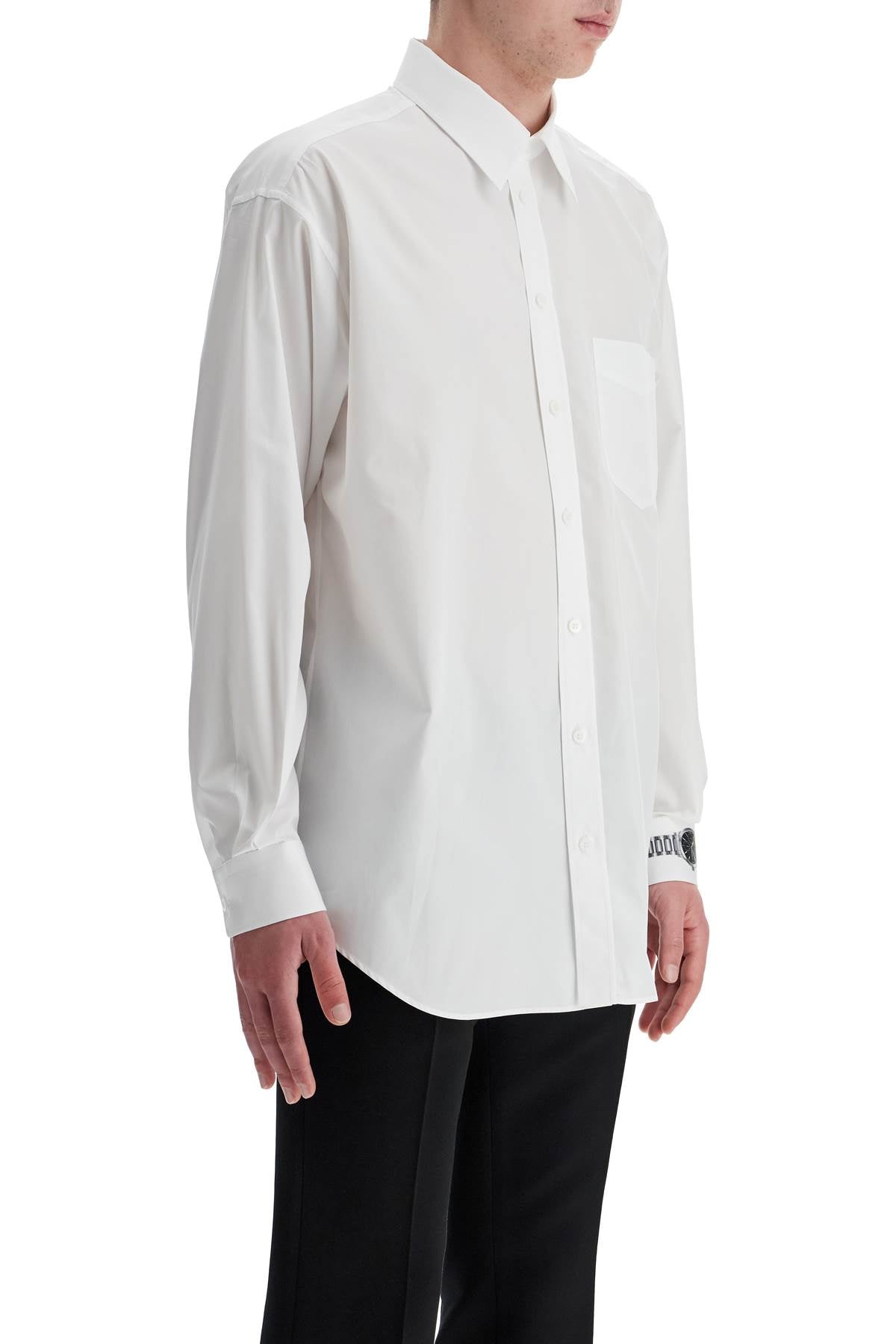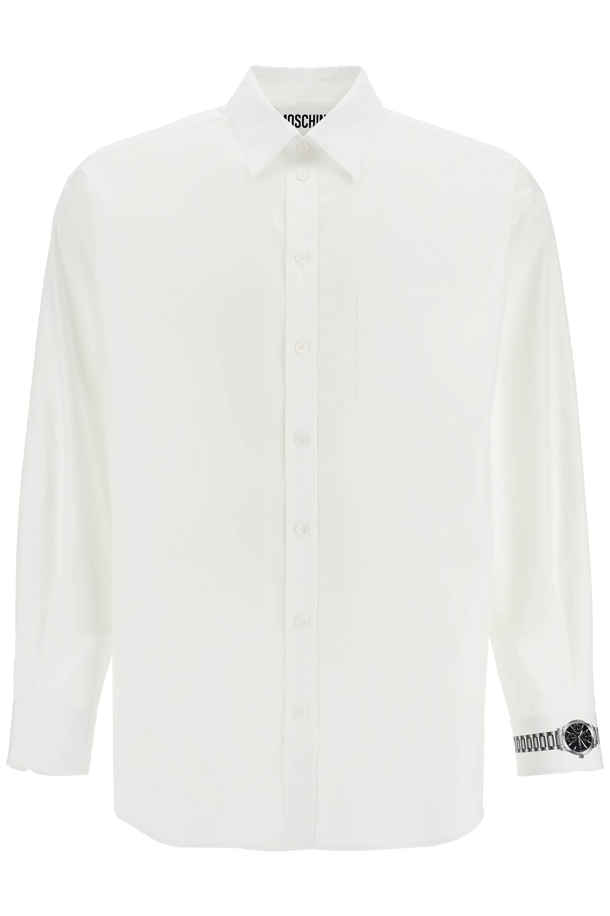 Made of cotton poplin, this Moschino shirt stands out for the "clock" pattern printed on the left cuff. It has a relaxed fit with an Italian collar, button closure with placket and a chest pocket. The model is 182 cm tall and wears size 40.
