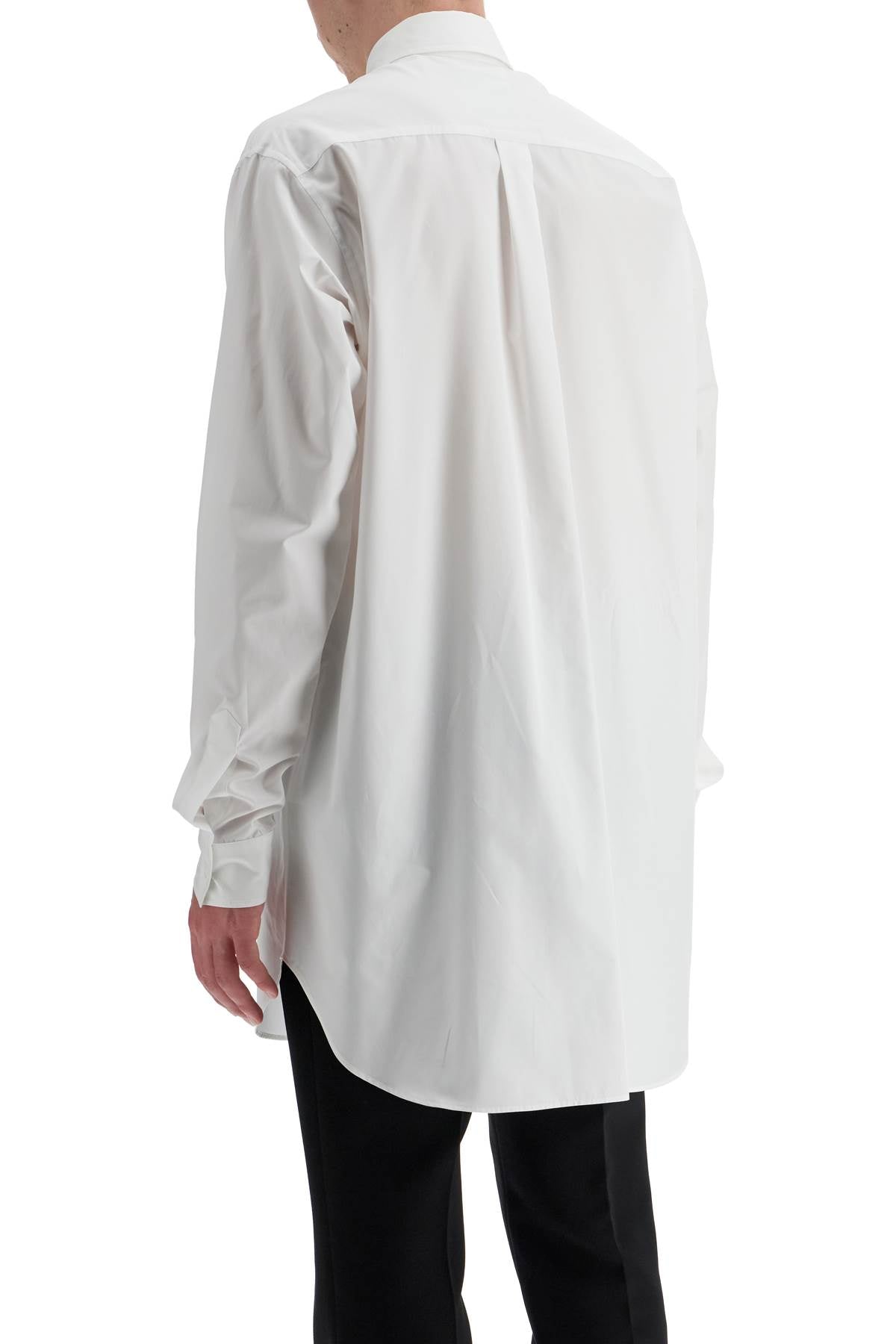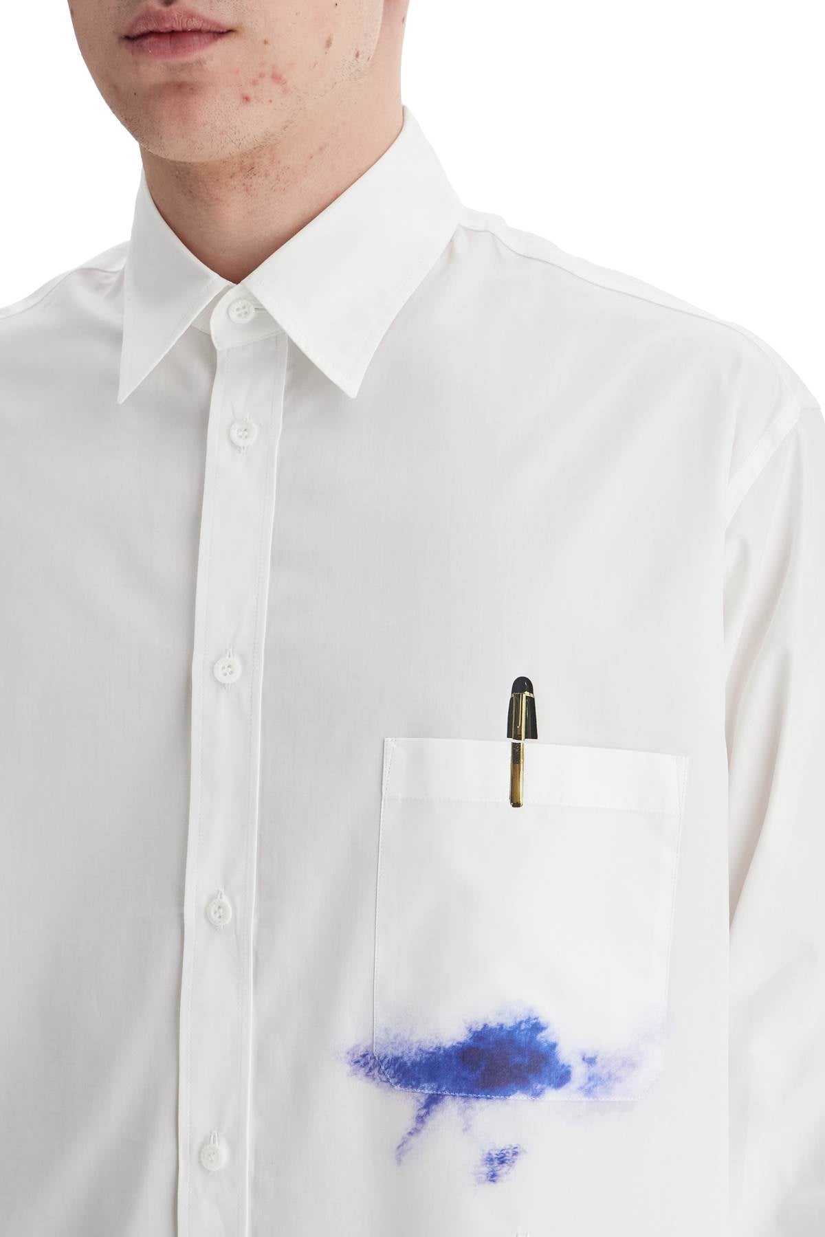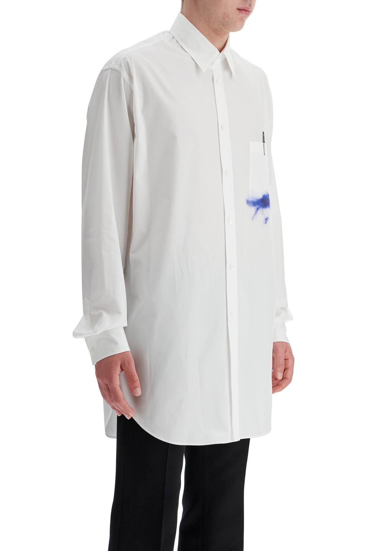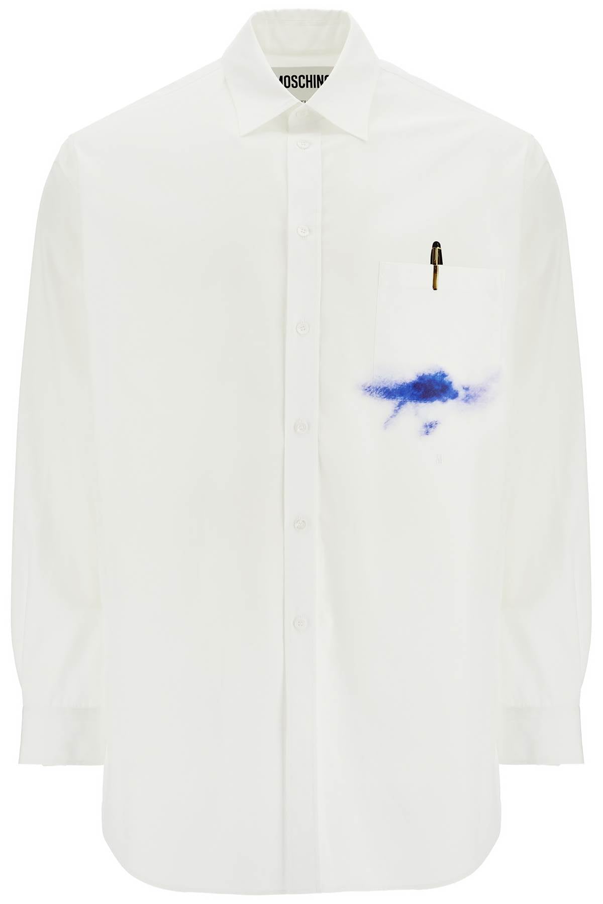 Made of cotton poplin, this Moschino shirt stands out for its trompe l'oeil prints on the chest, corresponding to the pocket. It features a comfortable and elongated cut with an Italian collar, button closure with placket, and classic cuffs. The model is 182 cm tall and wears size 40.