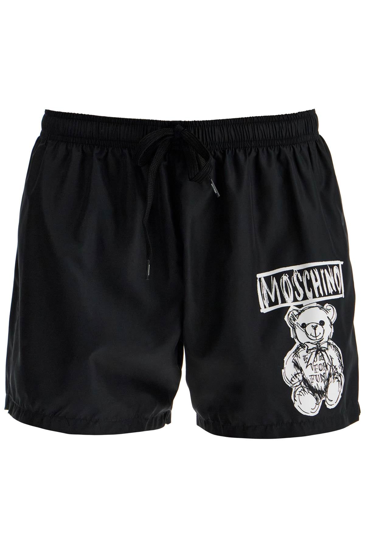The Moschino men's swim trunks have a soft fit and an adjustable elastic waistband with drawstring. Made of lightweight polyester, they feature a logo print on the left side, a back pocket, and a mesh inner brief. The model is 187 cm tall and wears size IT 48.