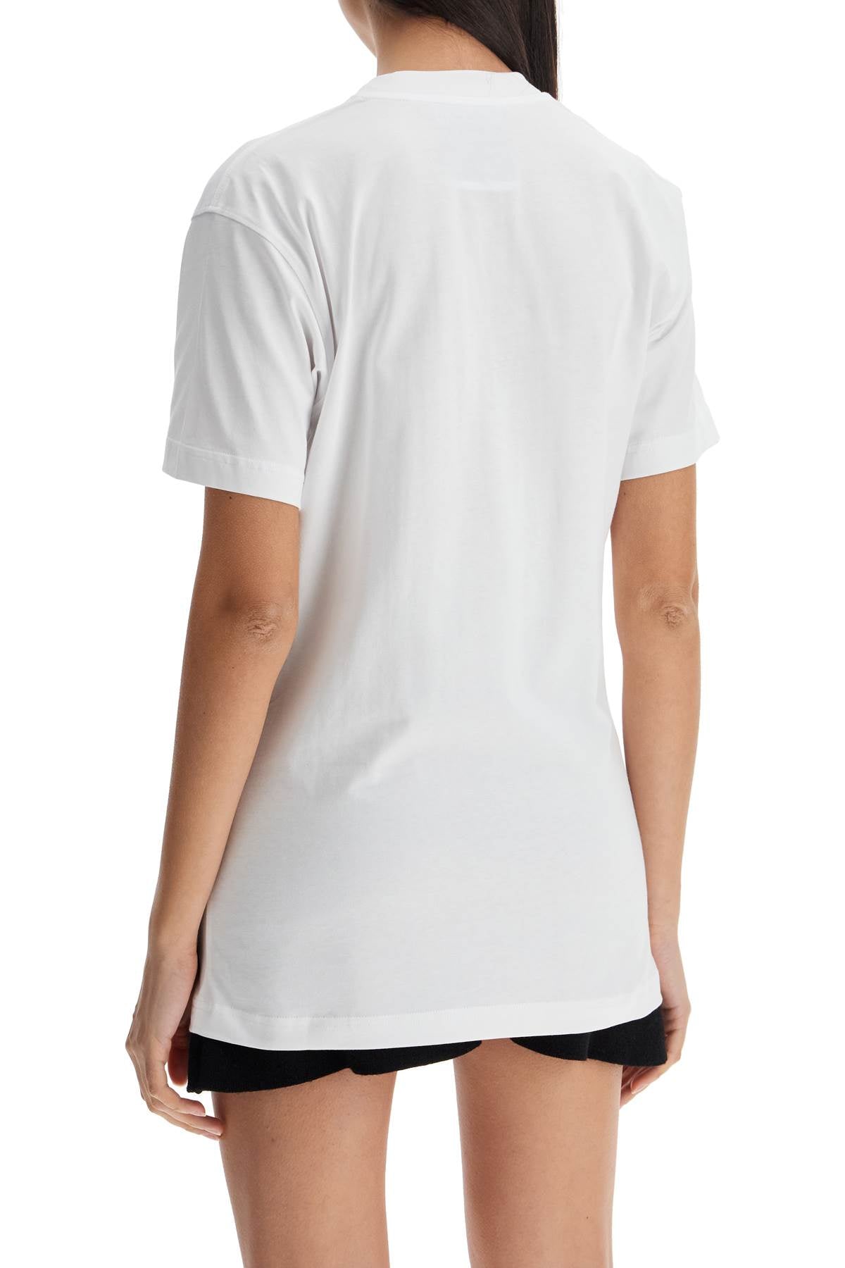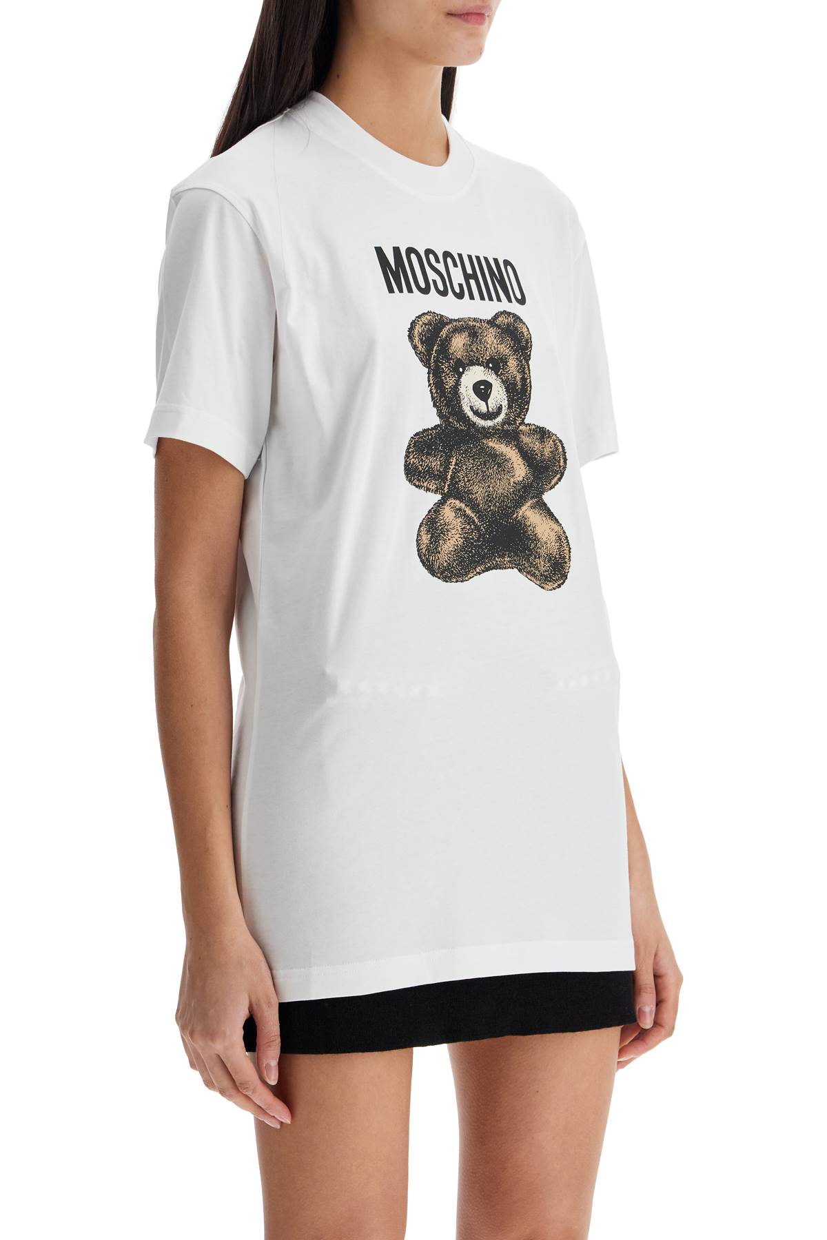 Short-sleeved jersey cotton t-shirt with Moschino Teddy Bear print on the front. Ribbed crew neck, regular fit. The model is 177 cm tall and wears size XS.