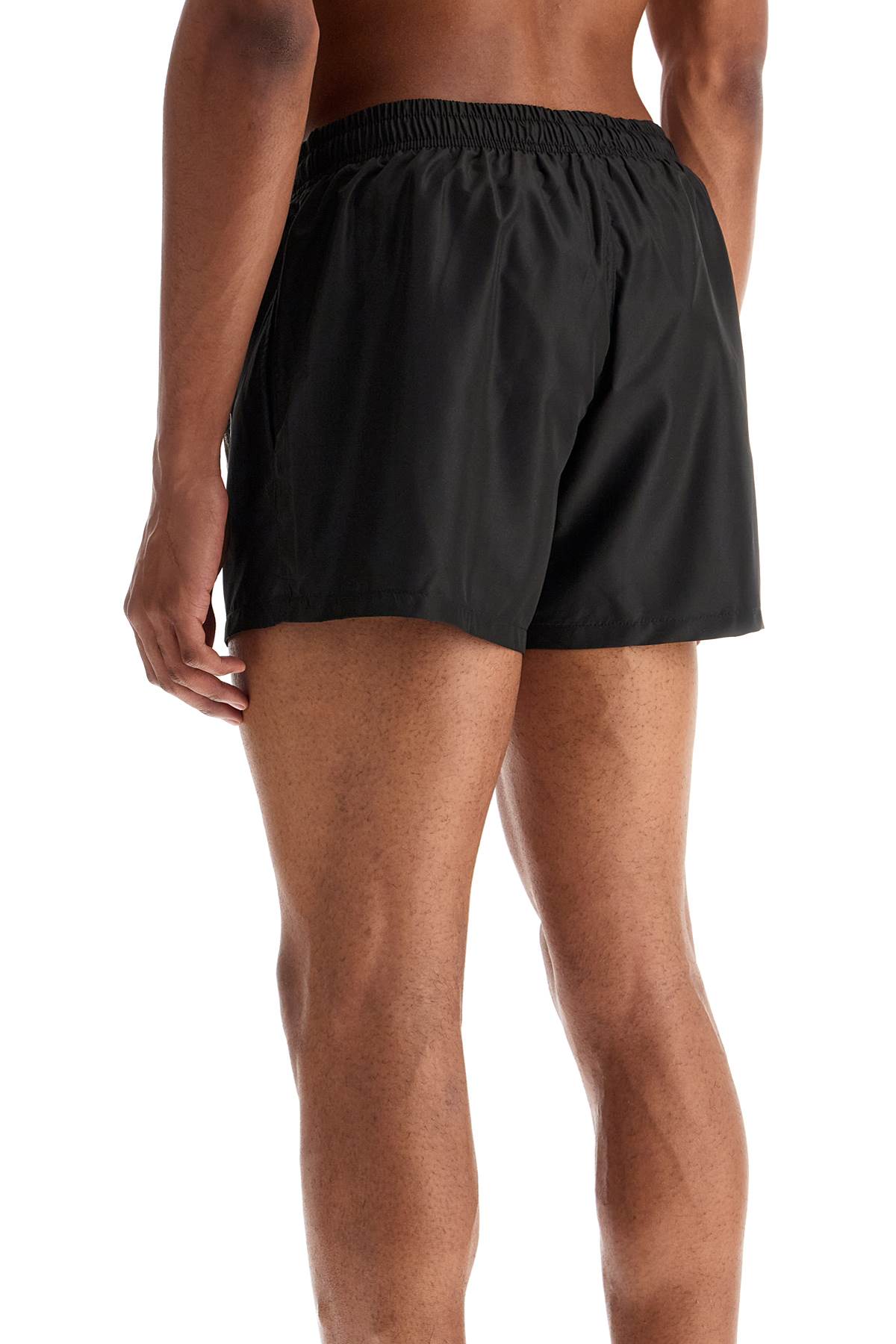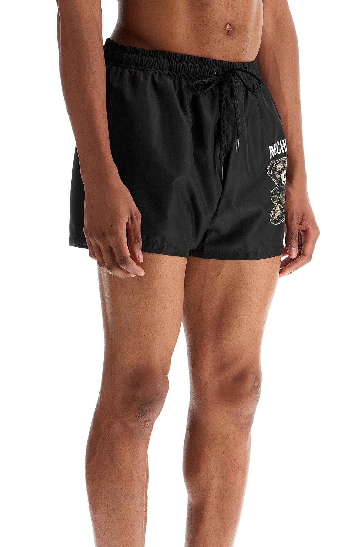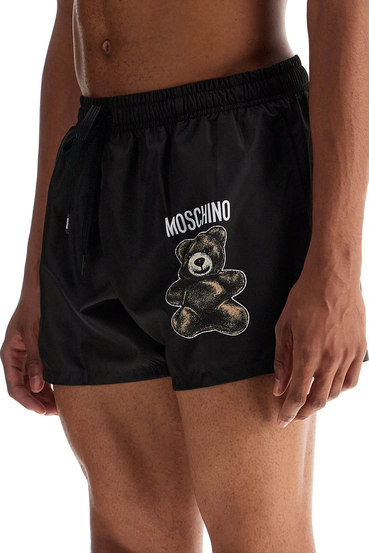Moschino men's swim trunks with a soft fit and adjustable elastic waistband with drawstring. Made of lightweight polyester with Moschino Teddy Bear print, they feature two side pockets and a mesh inner brief. The model is 182 cm tall and wears size IT 48.