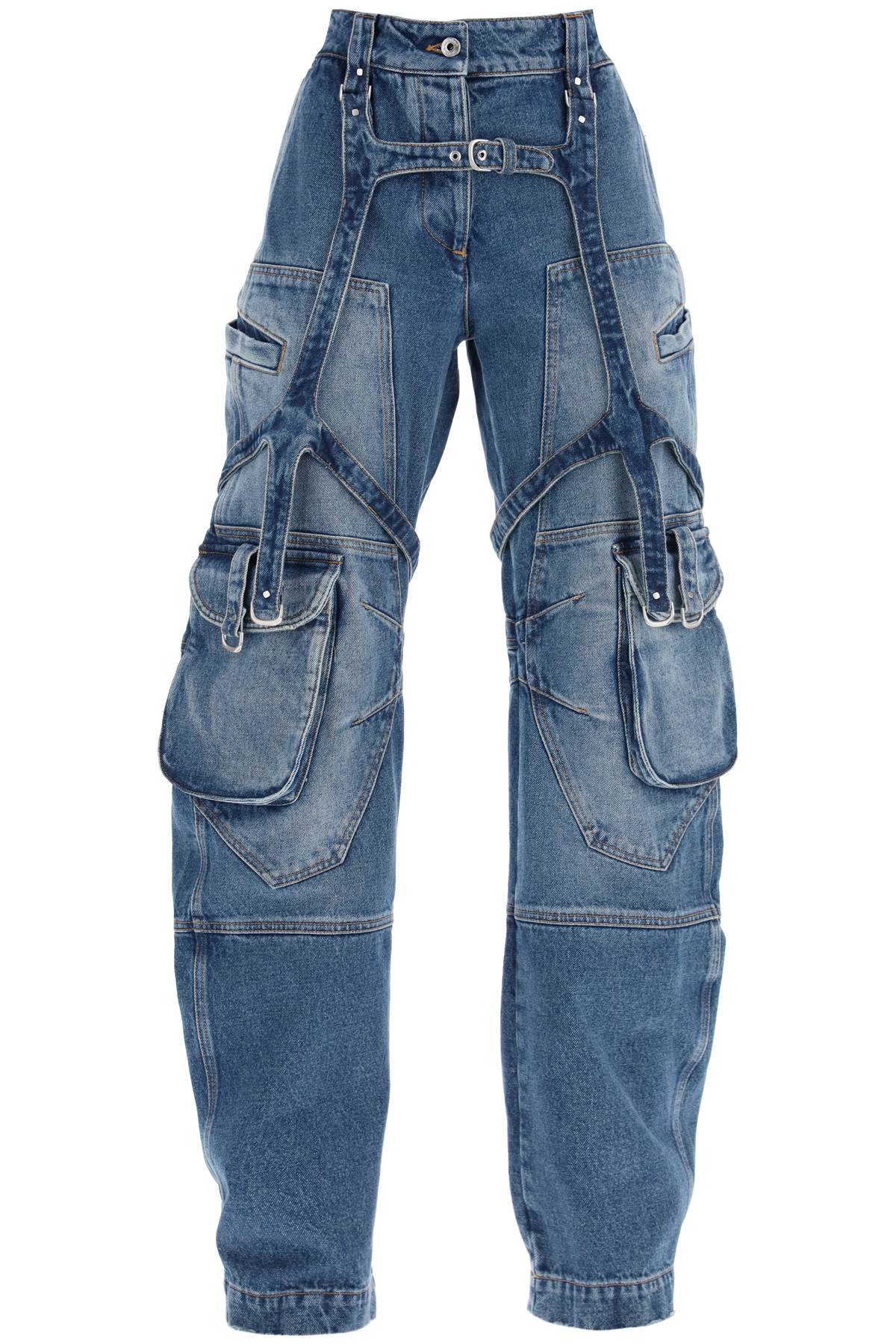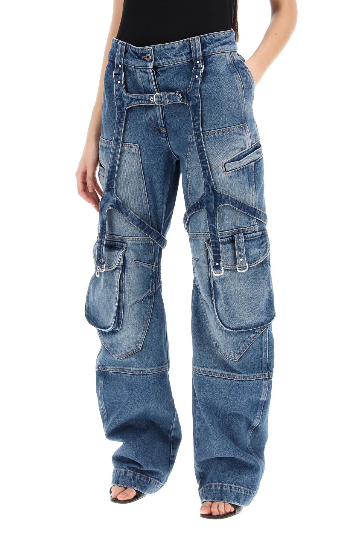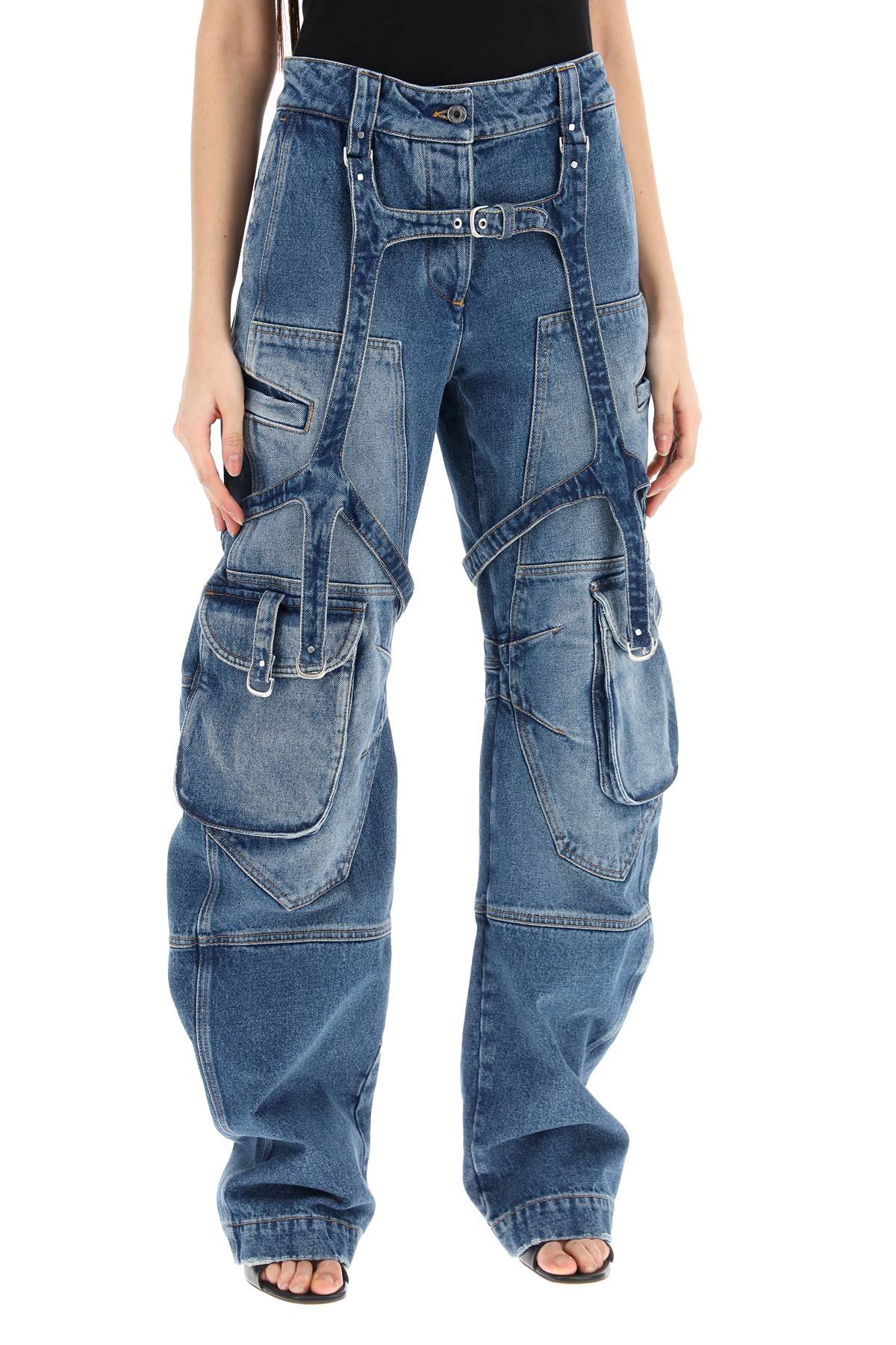 Off-White jeans made of pure, distressed cotton denim with a cargo design featuring utility pockets on the legs. They have a front closure with hidden buttons, belt loops, French pockets on the sides, flap pockets on the back, harness-style details and distressed finishes. Low-waisted and baggy fit. The model is 177 cm tall and wears size 26.
