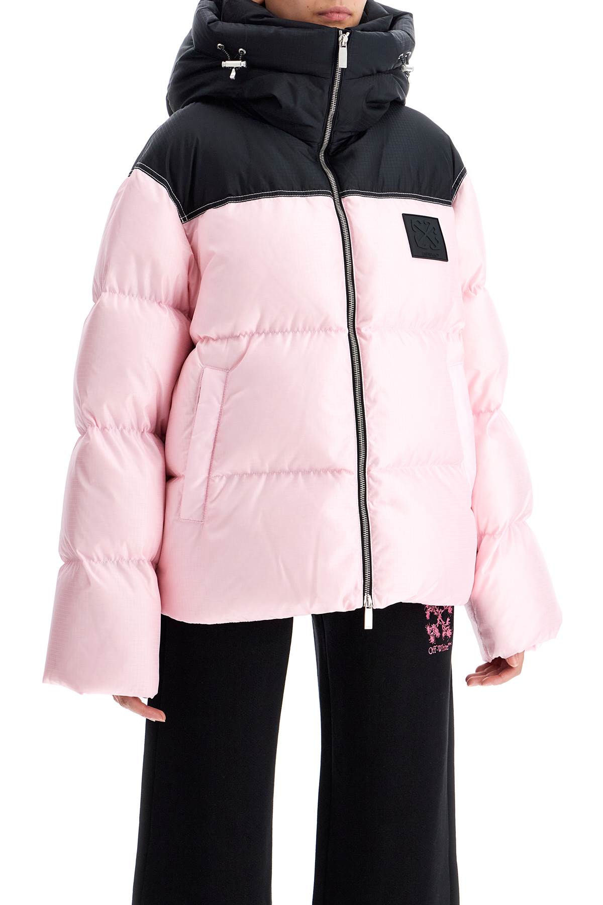 This Off-White quilted jacket is made of nylon ripstop with a color-block design and filled with real feathers. The oversized fit features an adjustable hood and hem with drawstrings, a double-slider zip closure, and two side pockets. Logo application on the chest. The model is 177 cm tall and wears size IT 40.