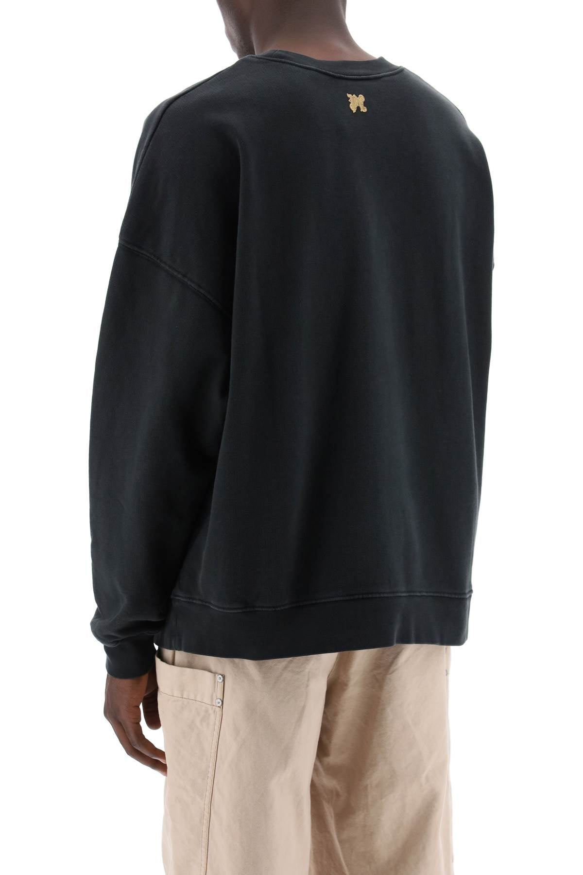 The Palm Angels oversized crewneck sweatshirt is made of brushed cotton jersey and features a large Burning Monogram print, enhanced with laminated details. The back is finished with a gold metal monogram applied under the collar. The model is 187 cm tall and wears size L.
