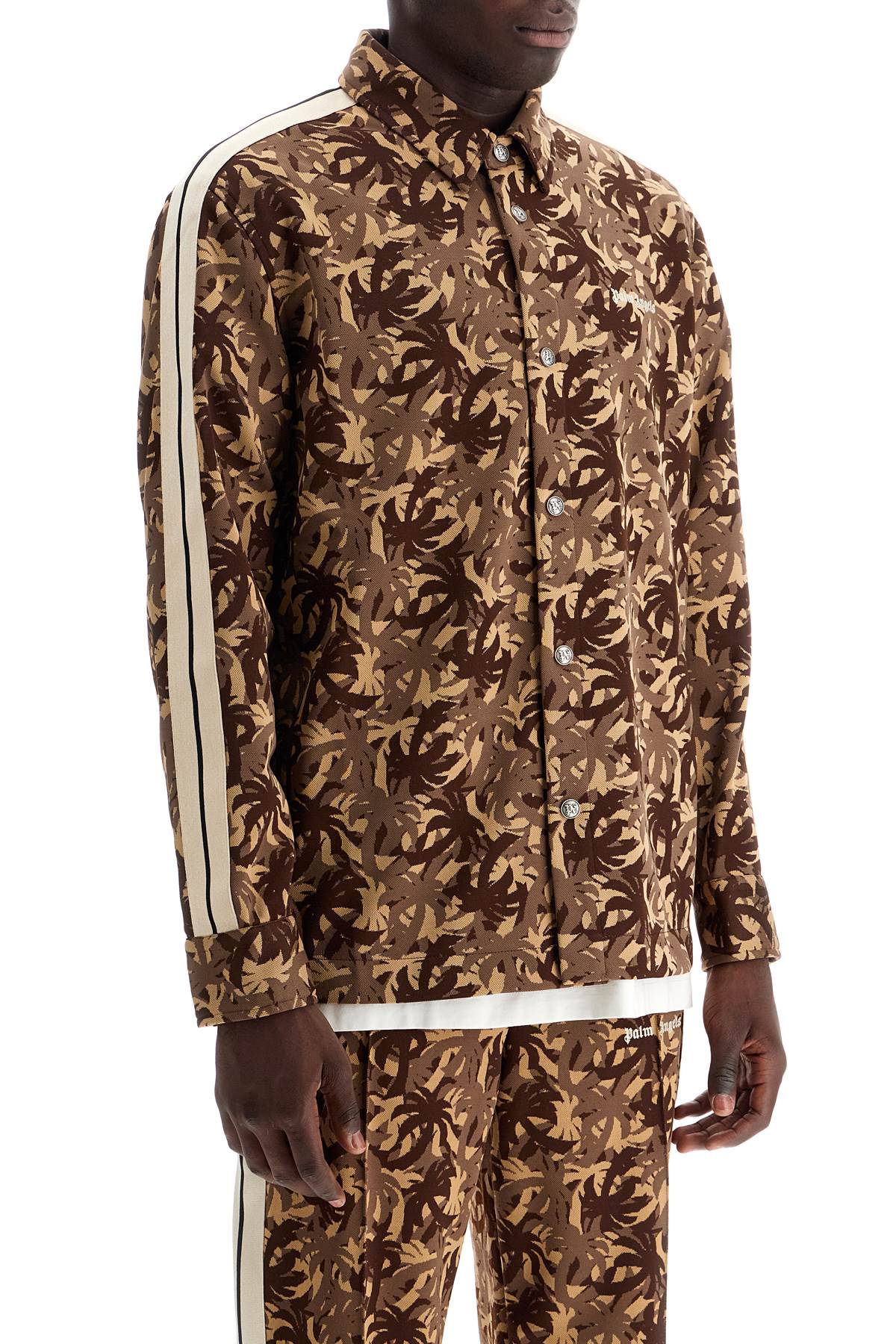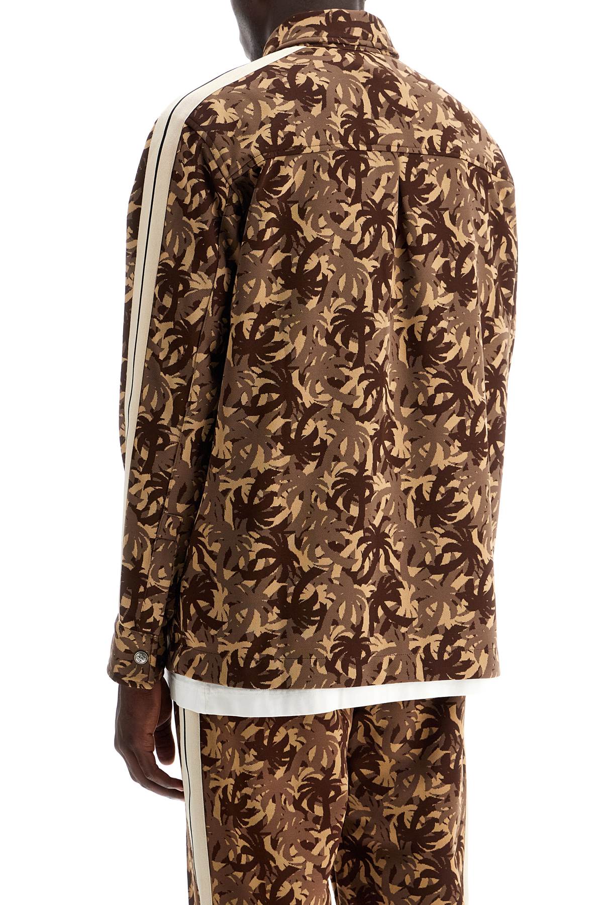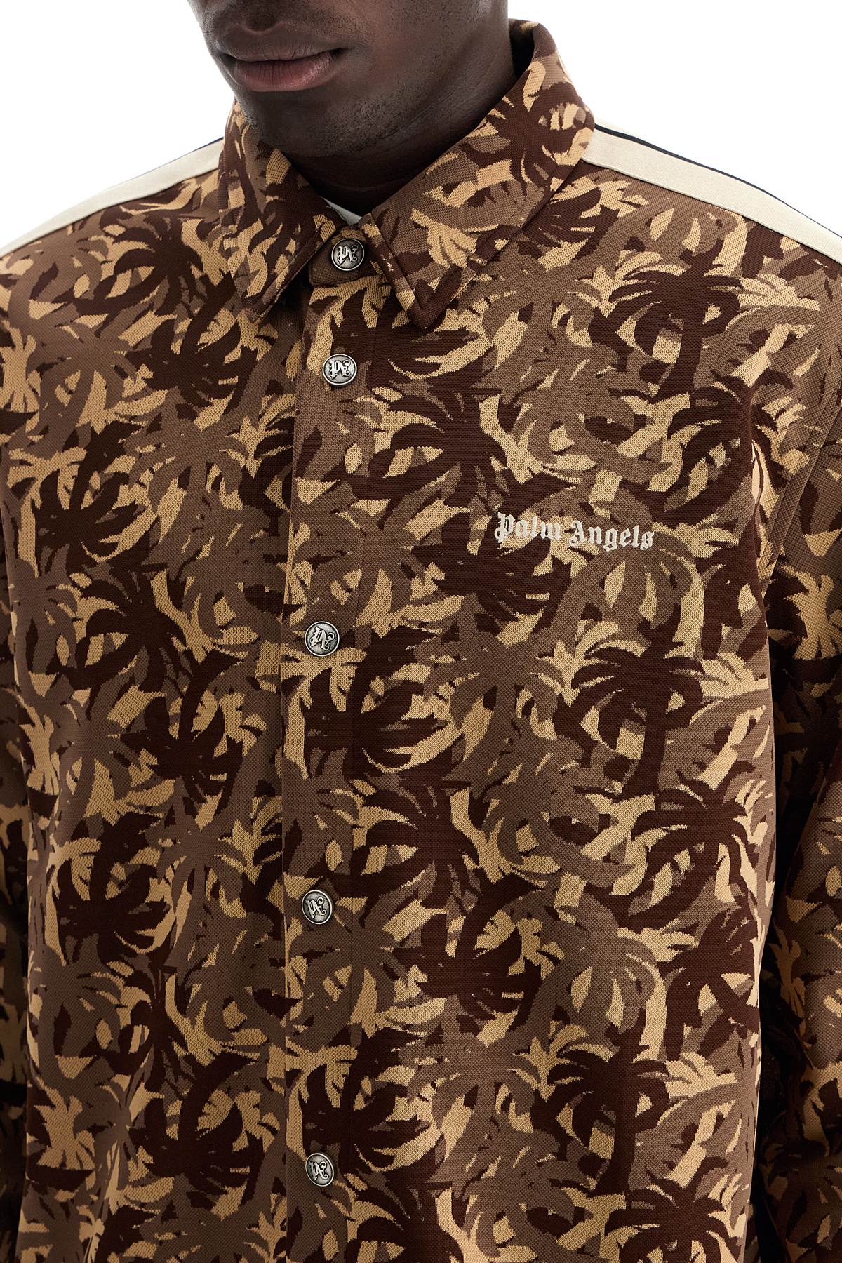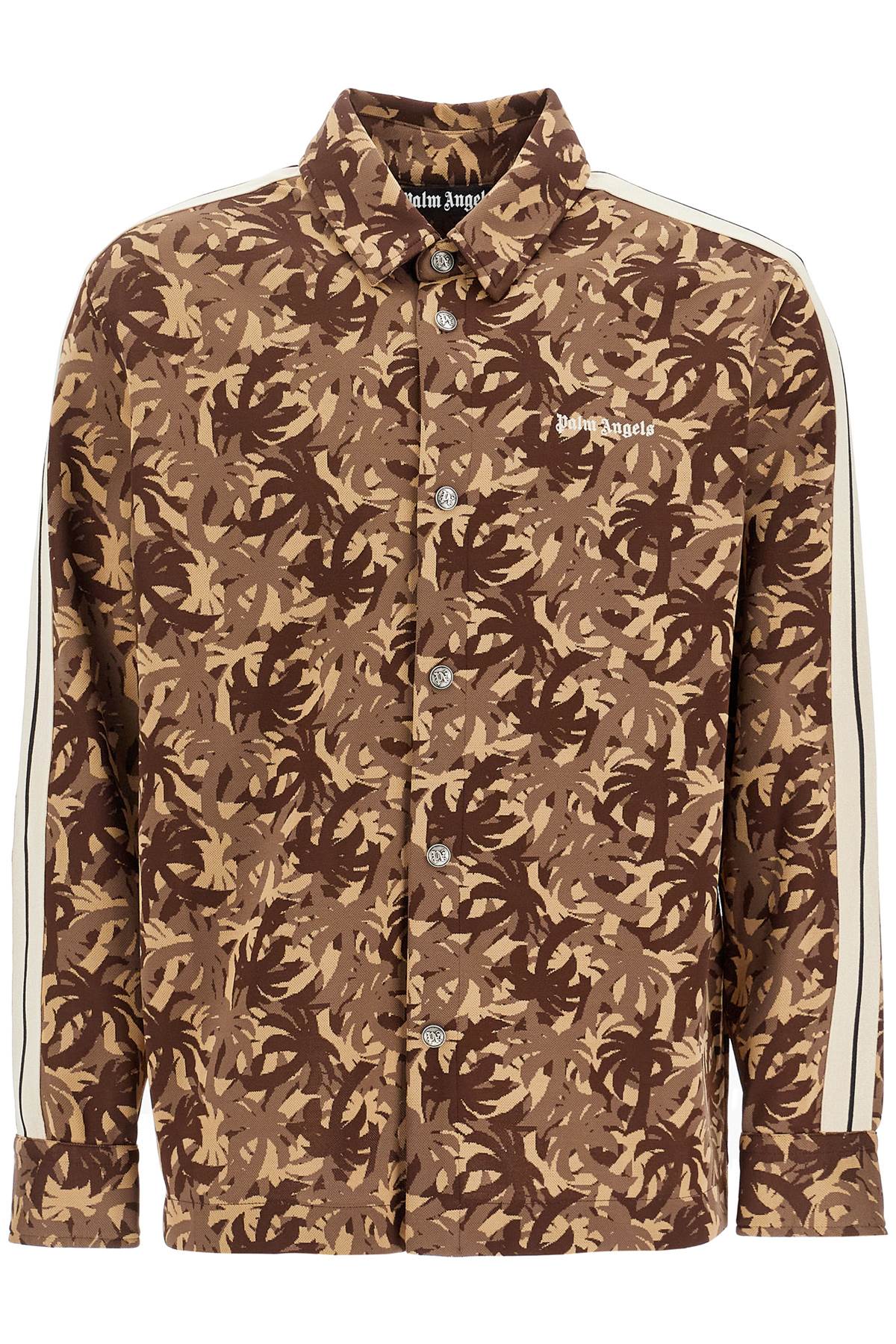 The Palm Angels Overshirt Track is made of technical jersey with the iconic Palm camouflage pattern all over, enriched by bicolor bands applied on the sleeves. It features a classic collar, front closure and rounded cuffs with branded snap buttons. The straight cut with a soft fit is finished with a back yoke and pleat, and signed with an embroidered logo on the chest. The model is 187 cm tall and wears a size L.