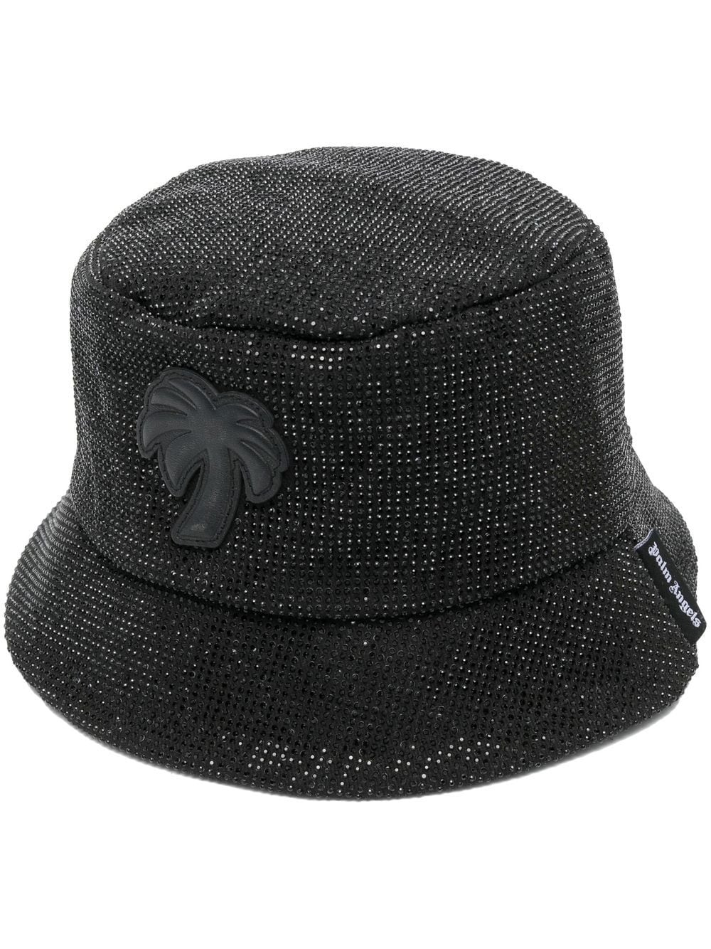 palm-patch rhinestone bucket hat from PALM ANGELS featuring black, cotton, logo patch to the front, rhinestone embellishment, logo tag, round crown and dropped narrow brim.