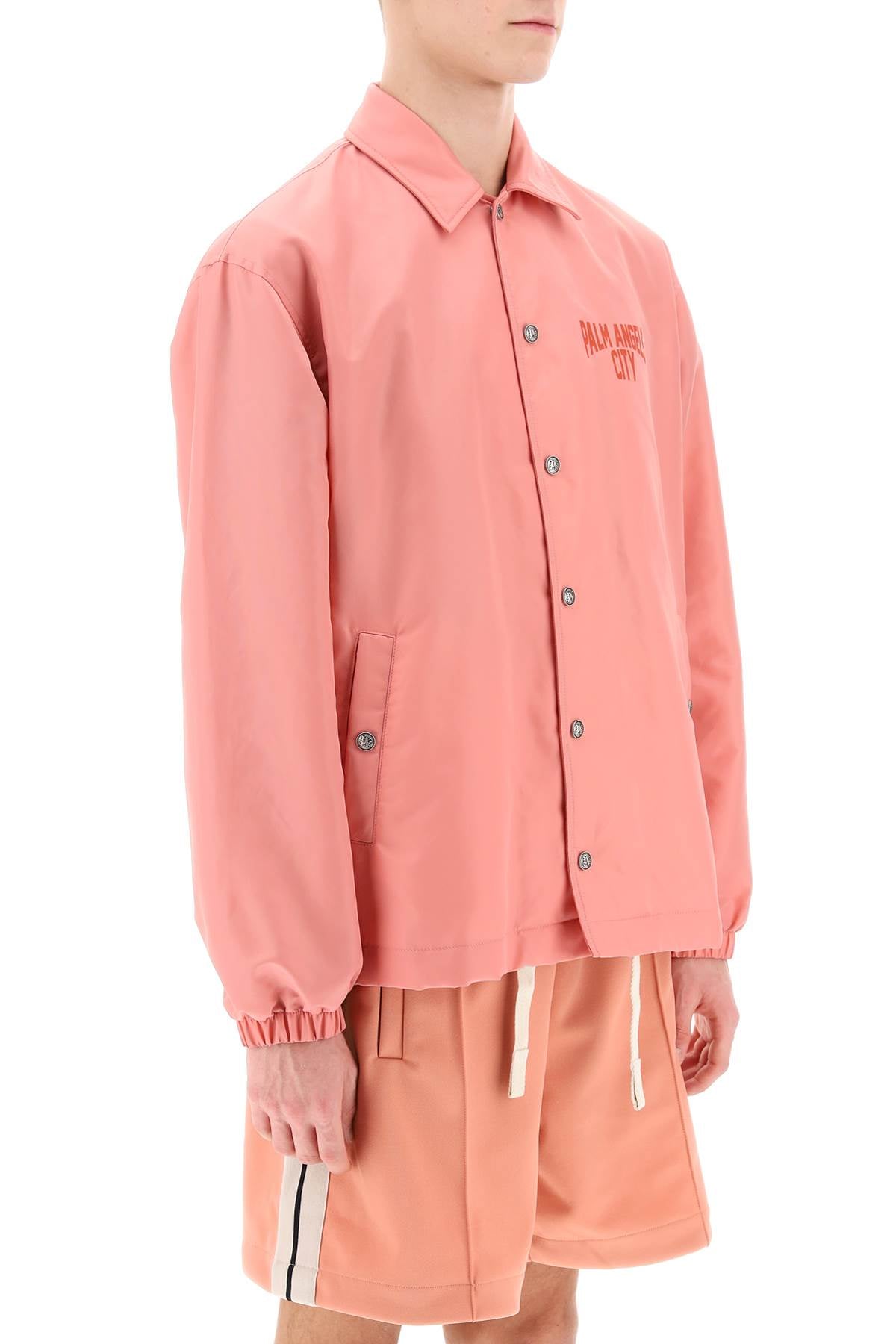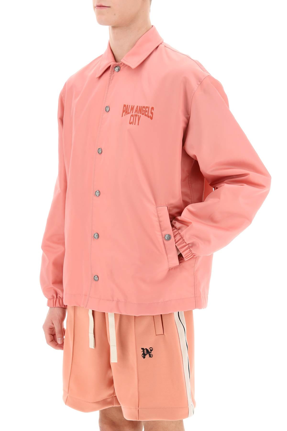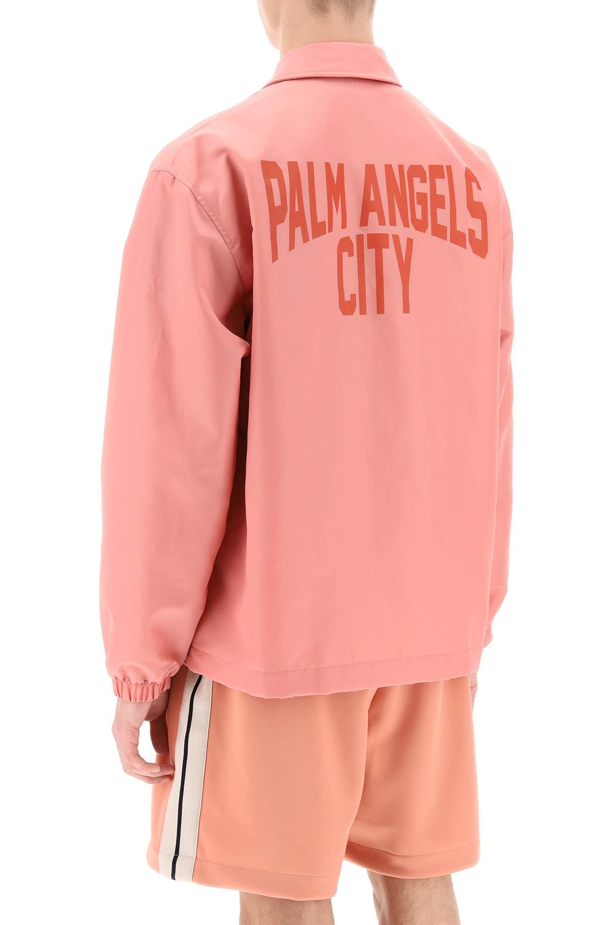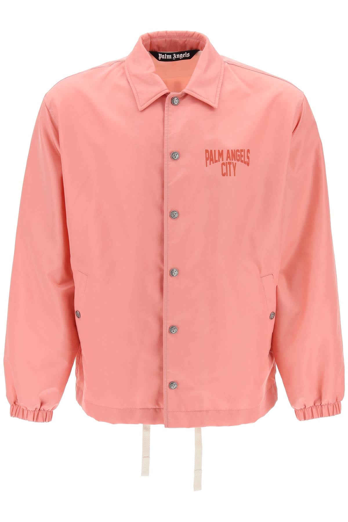Palm Angels coach jacket crafted in nylon twill, characterized by Palm Angels City print at back and chest. It features classic collar, logoed-button closure and welt pockets, elasticated cuffs and adjustable hem with inner drawstring. Lined in cotton and provided with an inner pocket. Relaxed boxy cut. The model is 187 cm tall and wears size IT 48.