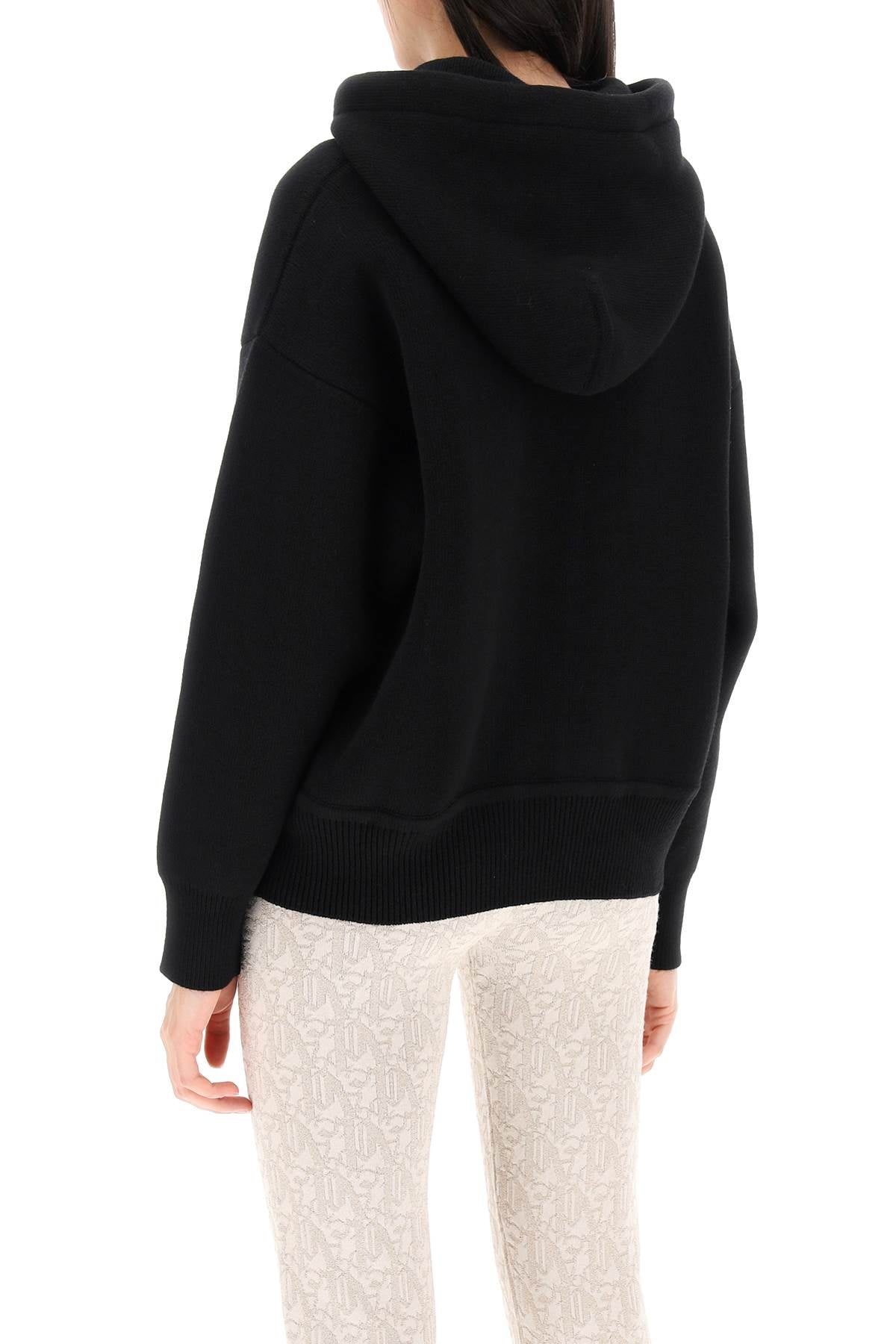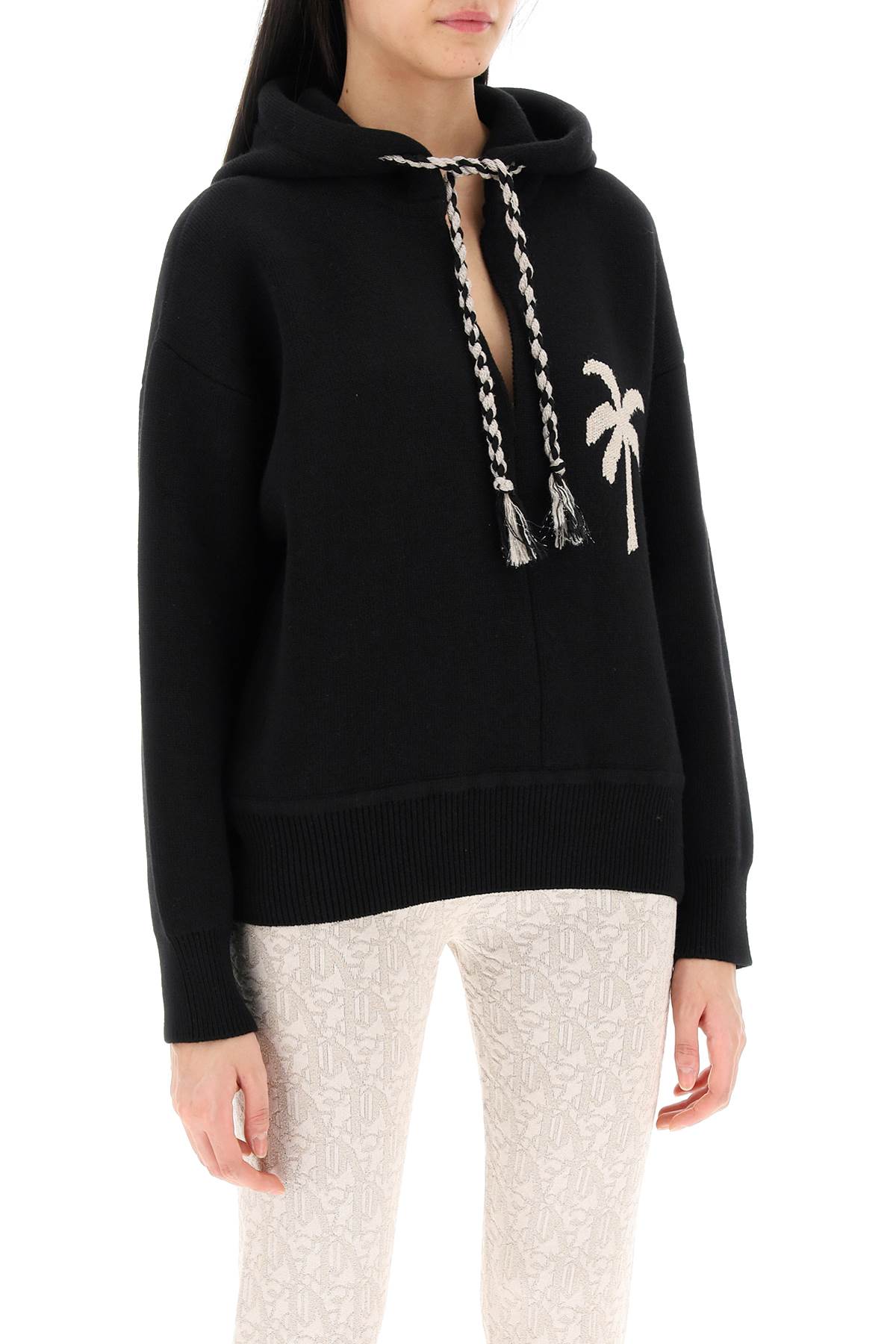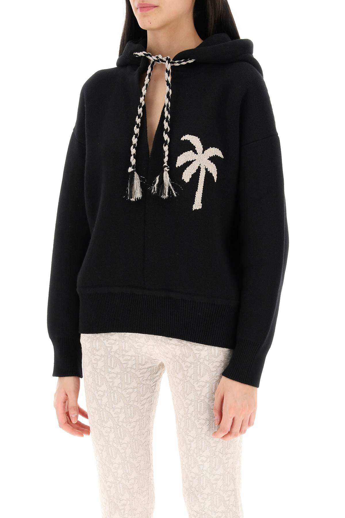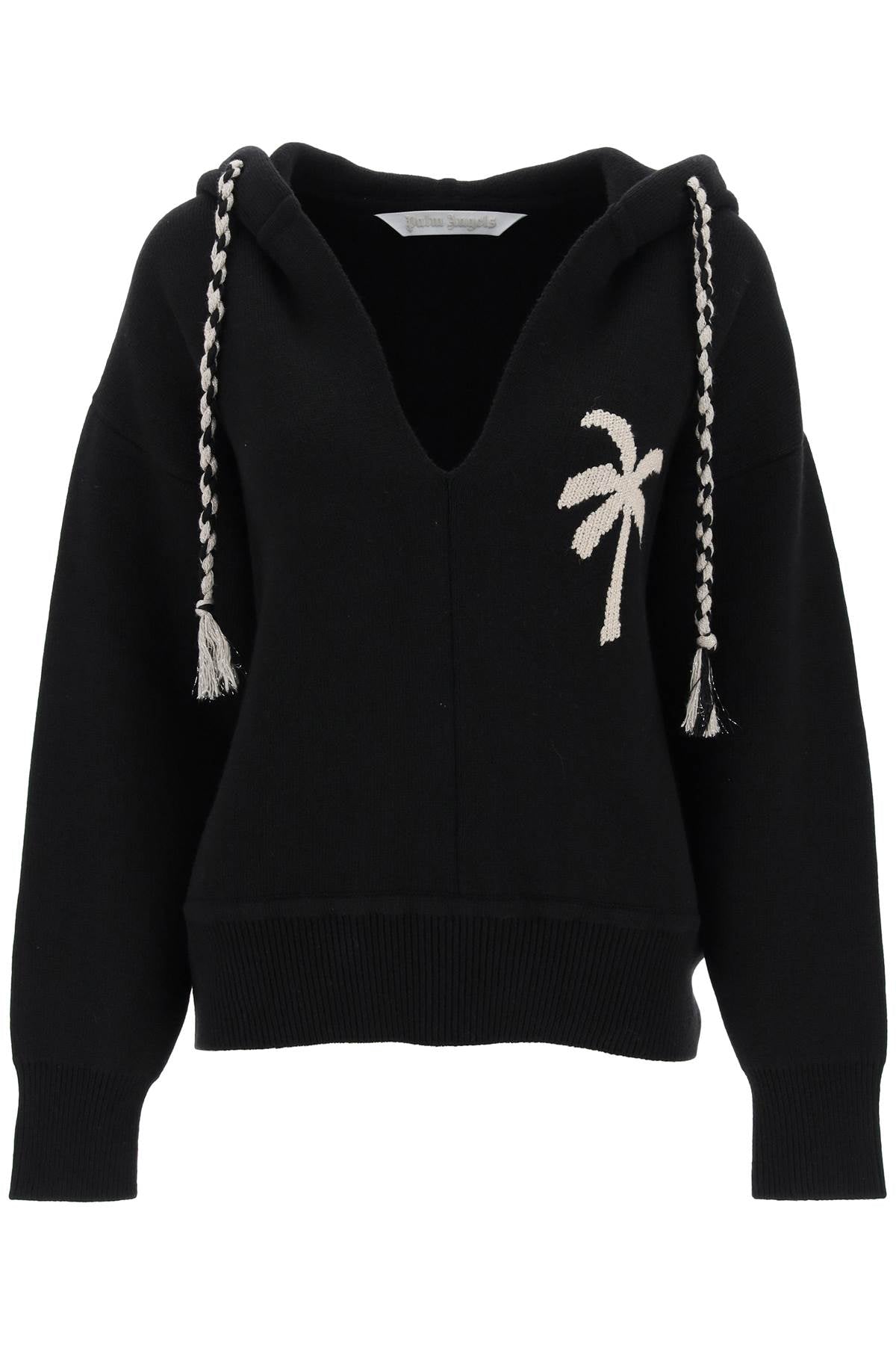 Palm Angels sweatshirt crafted in double-face wool and cashmere-blend stockinette-stitch knit, embellished with lurex jacquard Palm motif on the chest. It features V neck provided with braided drawstring and ribbed hem and cuffs. Loose fit with dropped shoulders. The model is 177 cm tall and wears size XS.
