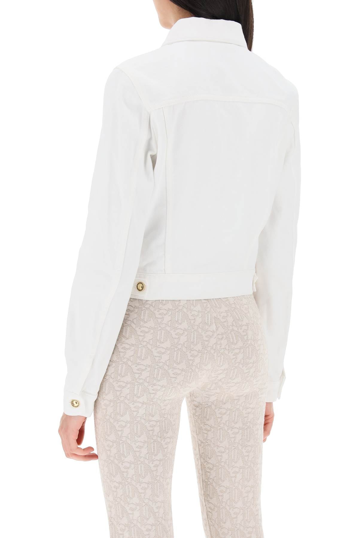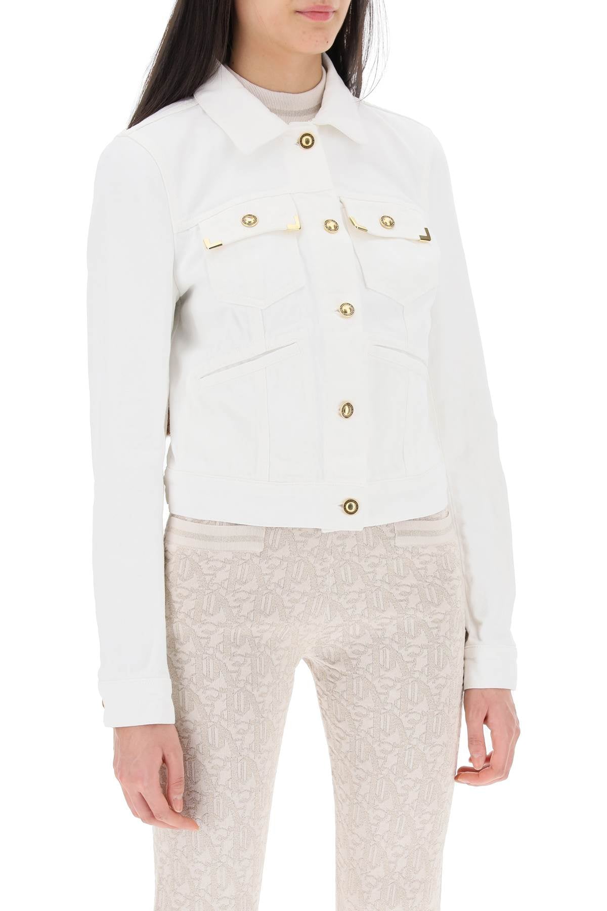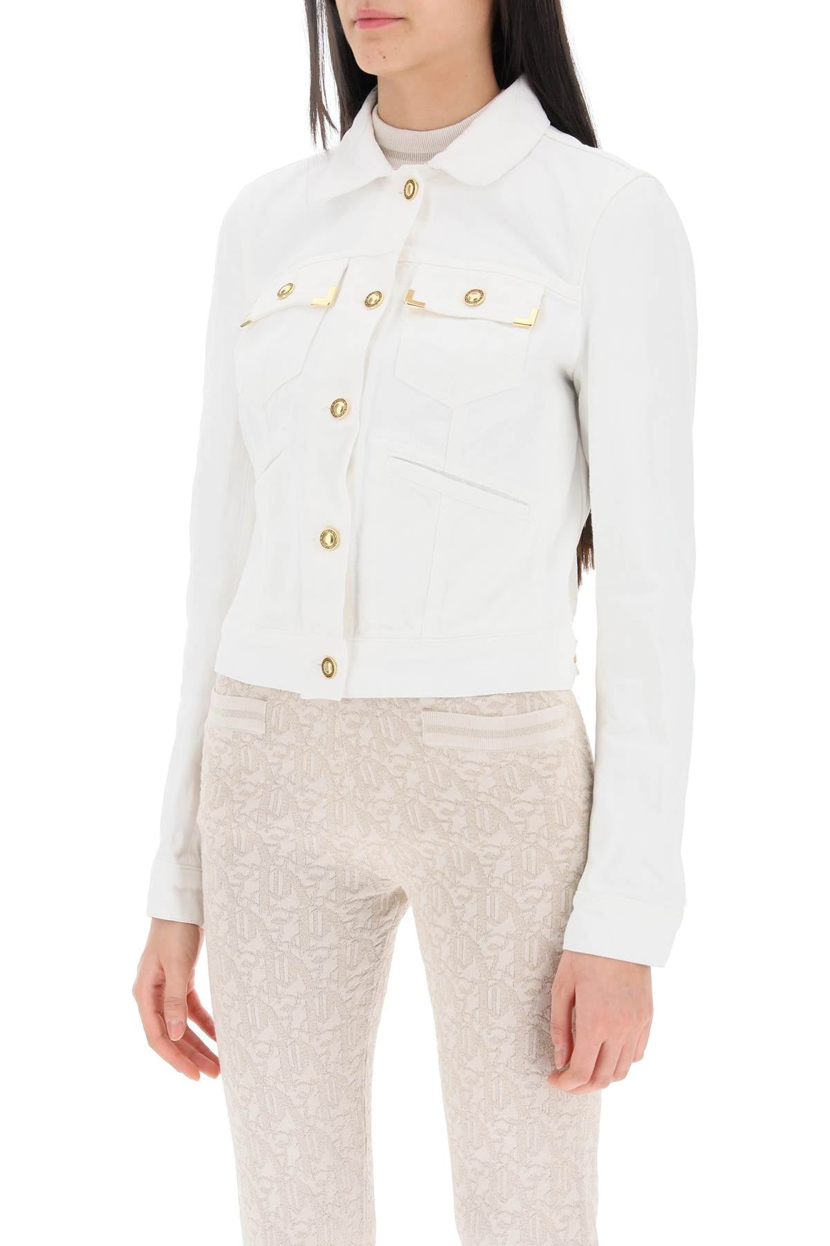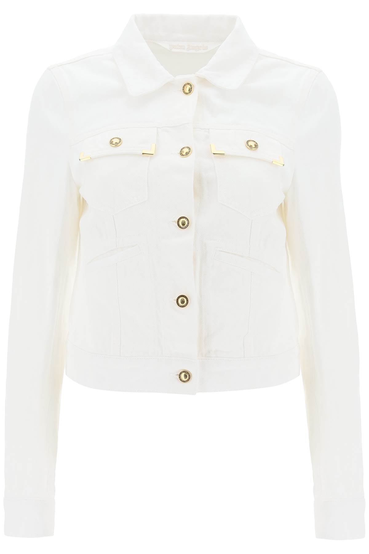 Palm Angels jacket crafted in pure cotton denim, characterized by a short regular cut finished with gold-tone metal edges and logo buttons. It features classic collar, front button placket, chest pockets with flap, slanted welt pockets, buttoned cuffs and back straps on the hem. The model is 177 cm tall and wears size S.