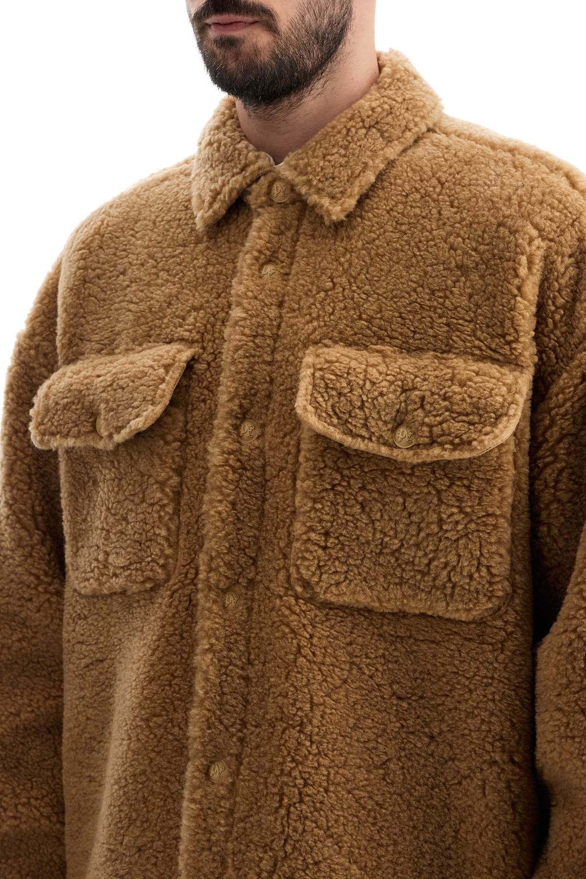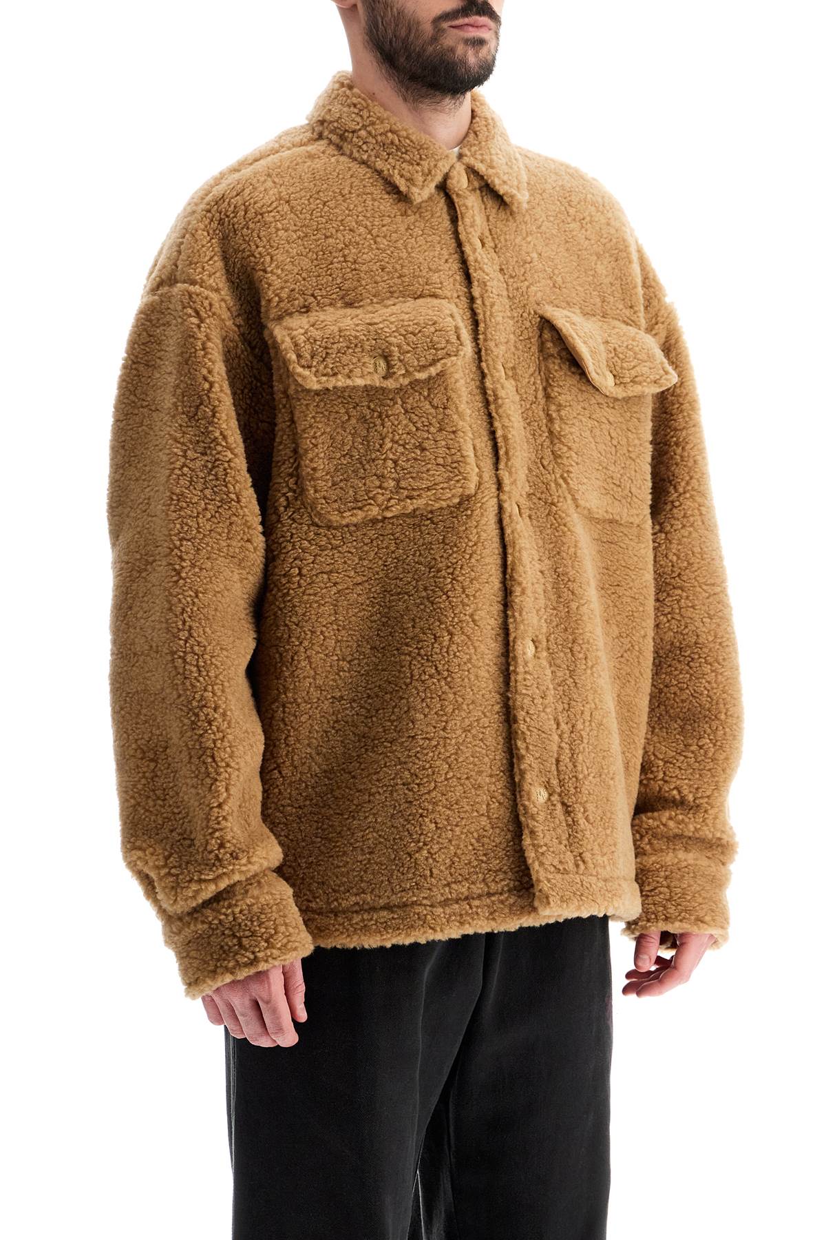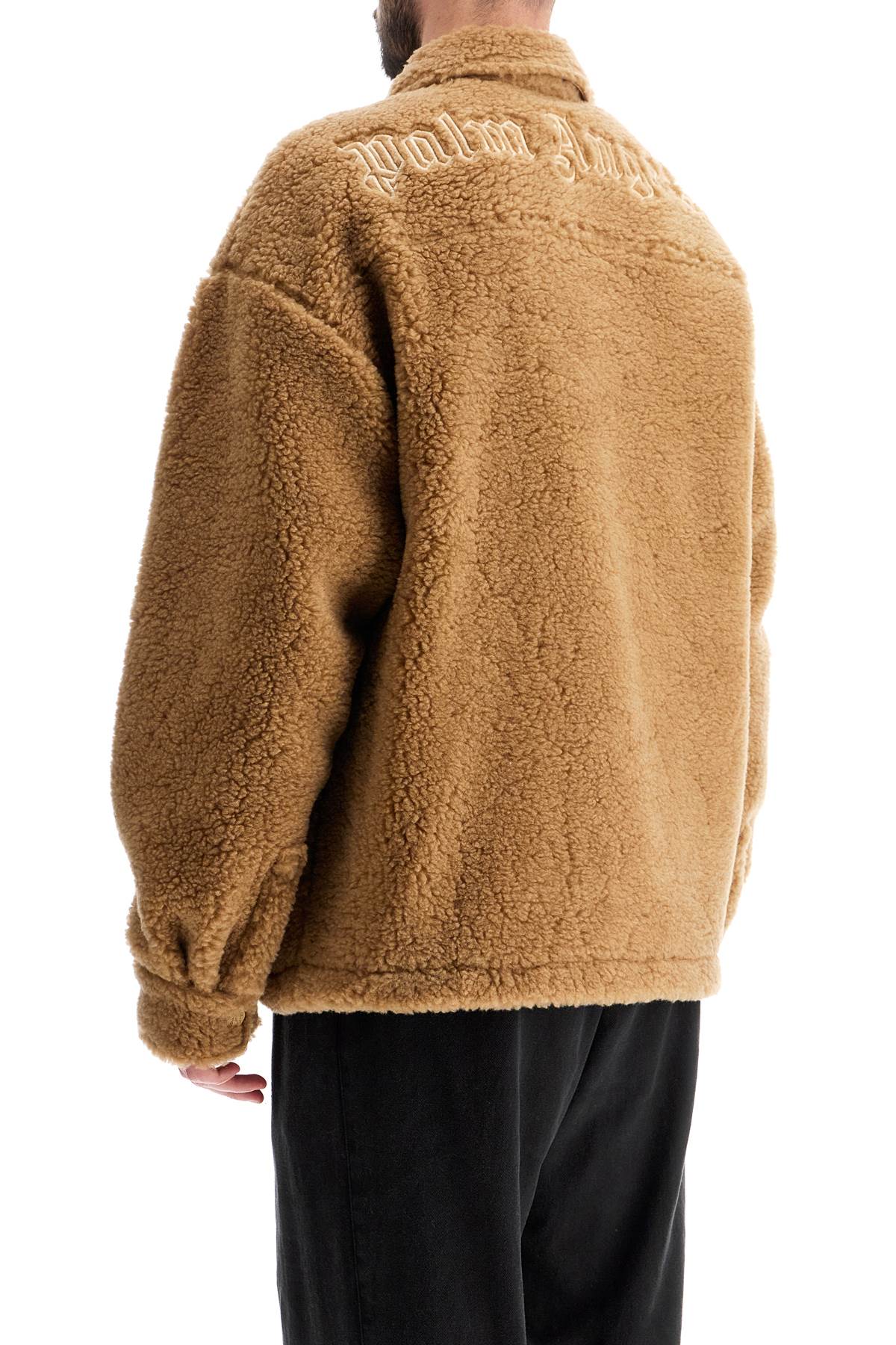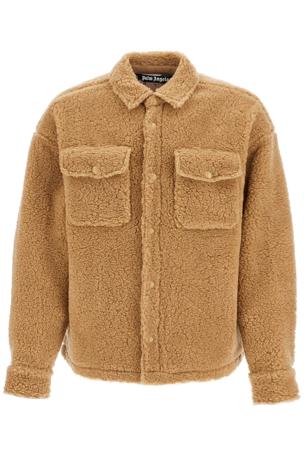 This soft teddy fabric overshirt features an embroidered Palm Angels logo on the back yoke. It has a straight and relaxed fit with dropped shoulders, a shirt collar, and cuffs, as well as side pockets and two flap pockets on the chest. The monogram snap buttons and printed lining complete the design. The model is 187 cm tall and wears size IT 48.