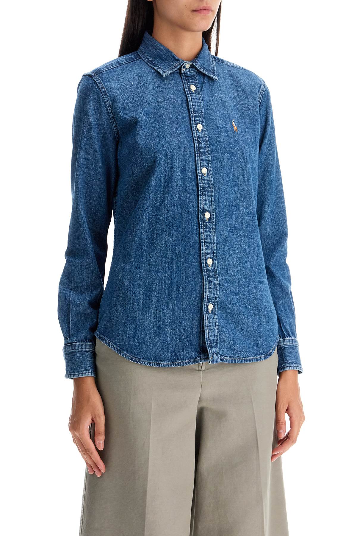 A slim-fit shirt in soft cotton denim from Polo Ralph Lauren, featuring a classic point-collar design with front button placket and a multicolor Pony logo embroidered at the chest. The model is 177 cm tall and wears a size US 2.