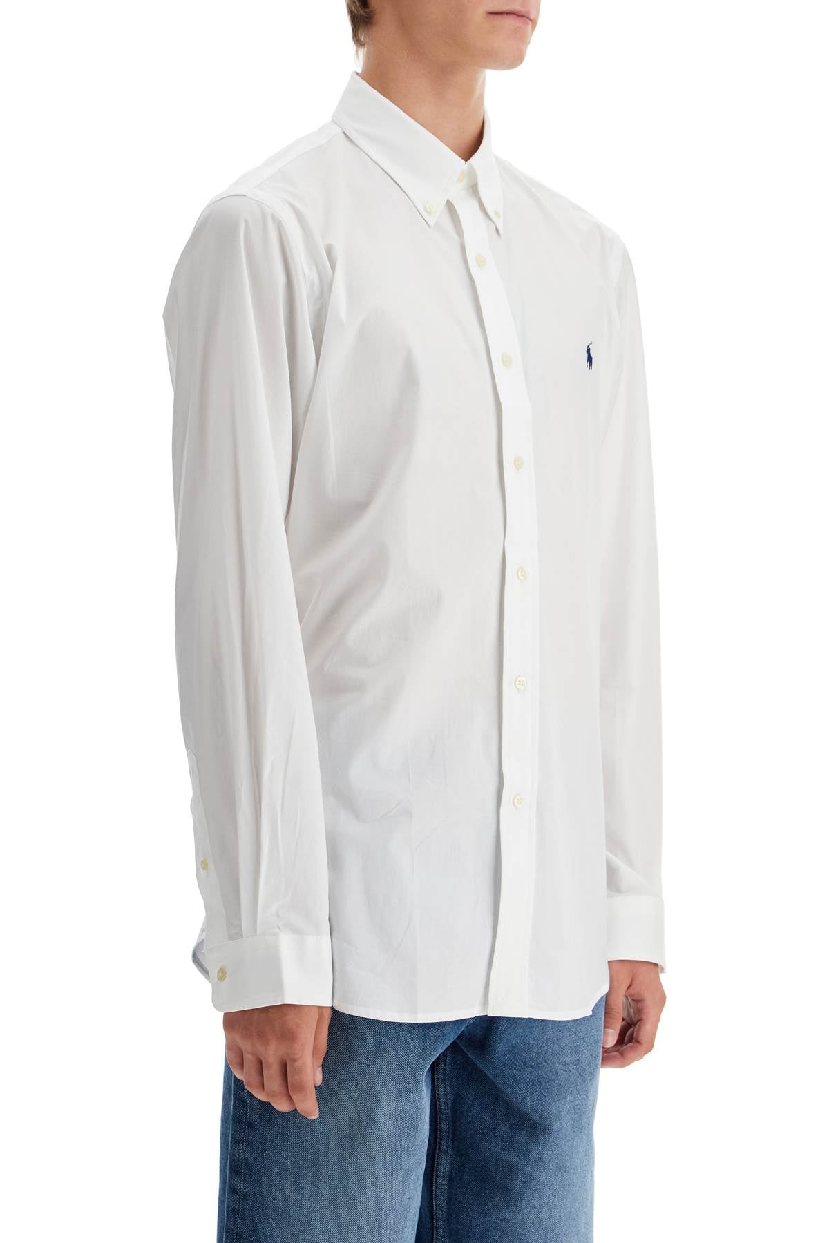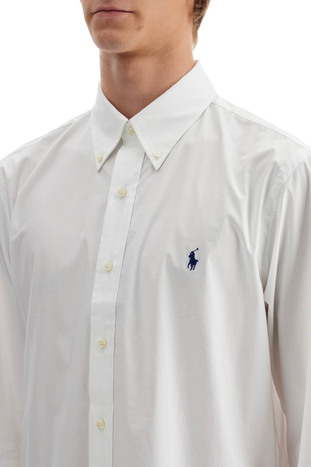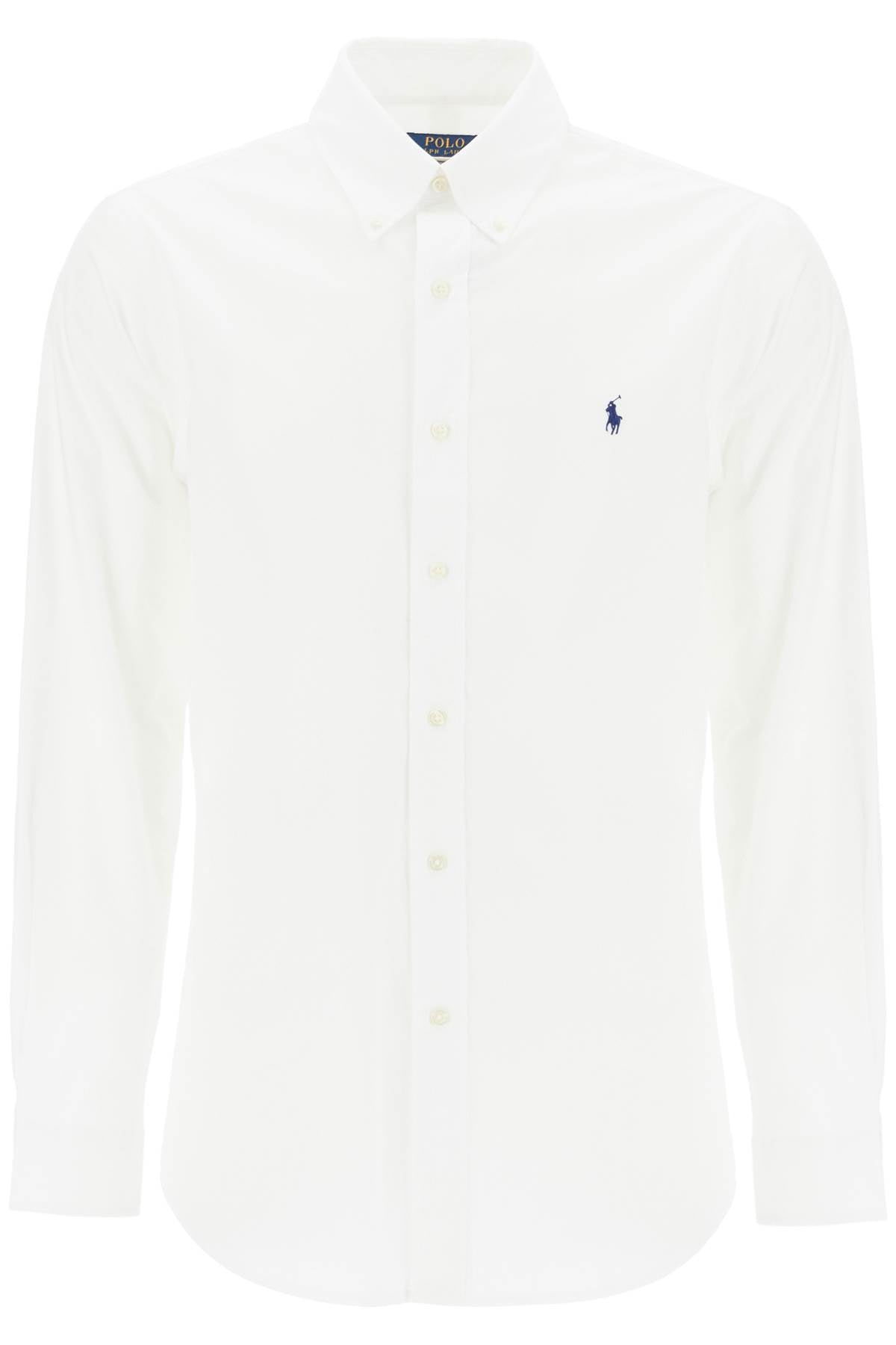 This Polo Ralph Lauren shirt is made of stretch cotton poplin, with a regular fit. It features a button-down collar, button closure, single-button cuffs, and a rounded hemline. The back has a box pleat and the chest is adorned with the iconic embroidered Pony detail. The model is 187 cm tall and wears size L.