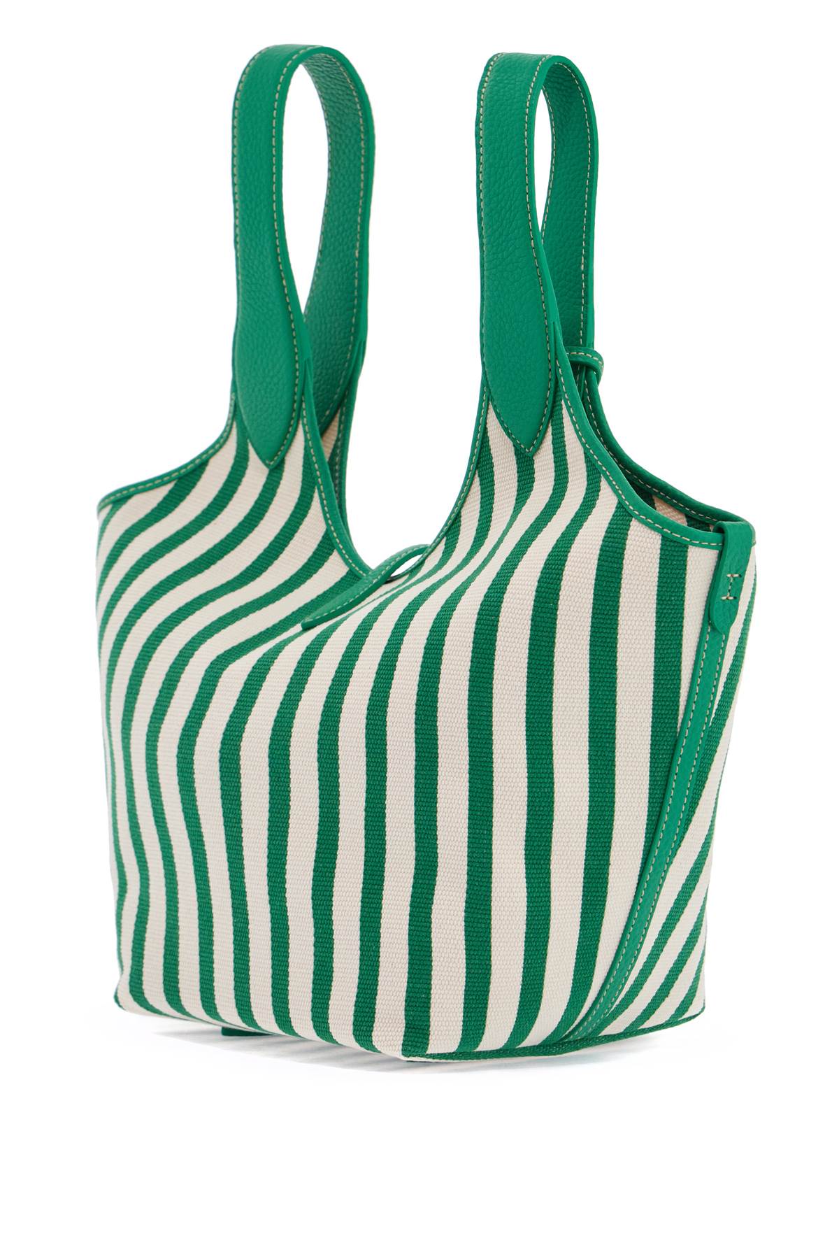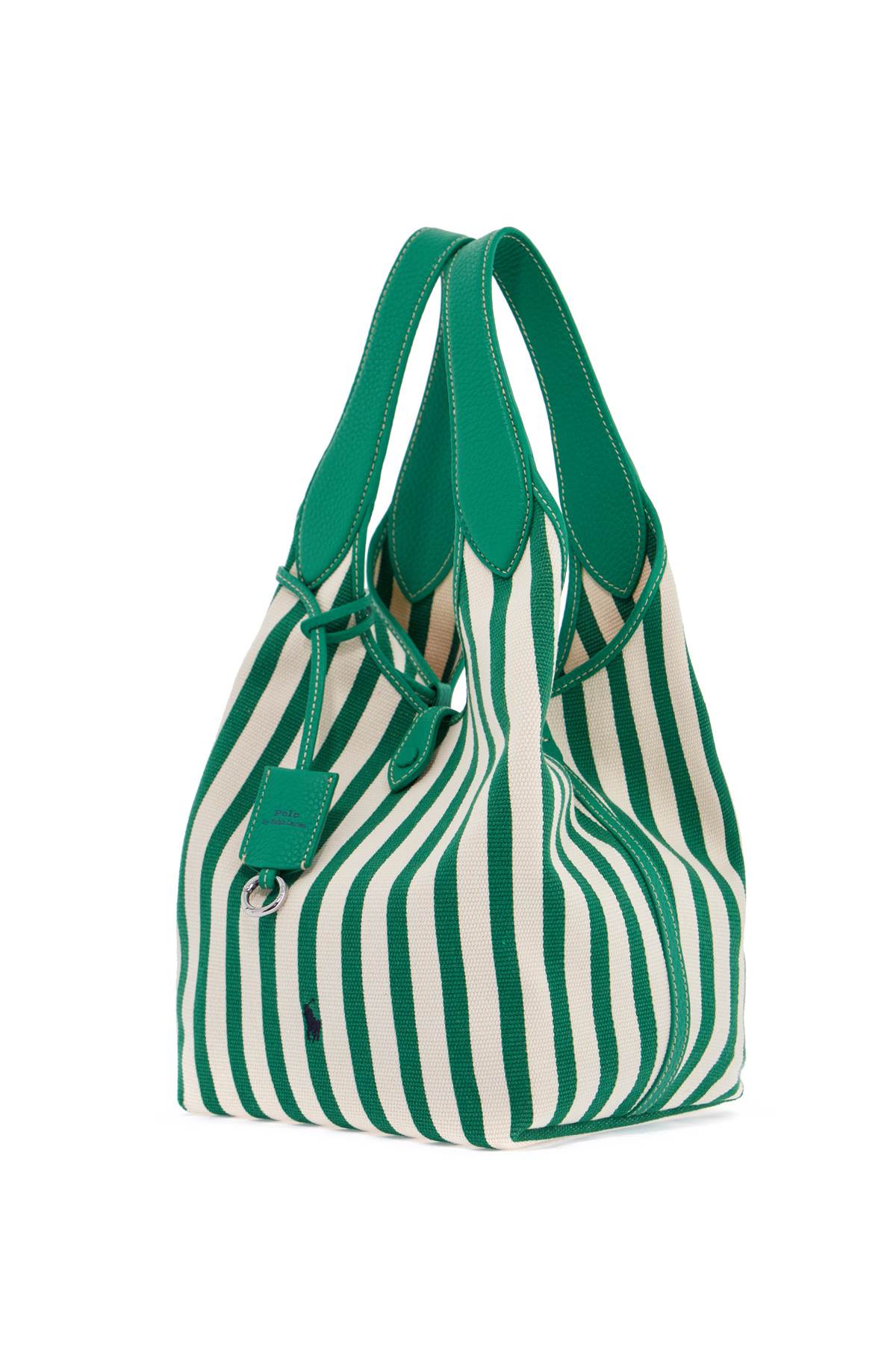 The Polo Ralph Lauren tote bag, from the Polo Play collection, is made of striped cotton canvas and finished with hammered leather. It features a double closure with a strap and snap button on one side and an anchor on the other. The top has two handles, while the interior is unlined and includes a removable keychain with a leather case. The design is detailed with the iconic pony embroidery on the front. Size and Fit - Bag Length = 18 cm, Bag Height = 23 cm, Bag Weight = 17 cm, Handle Height = 21 cm,