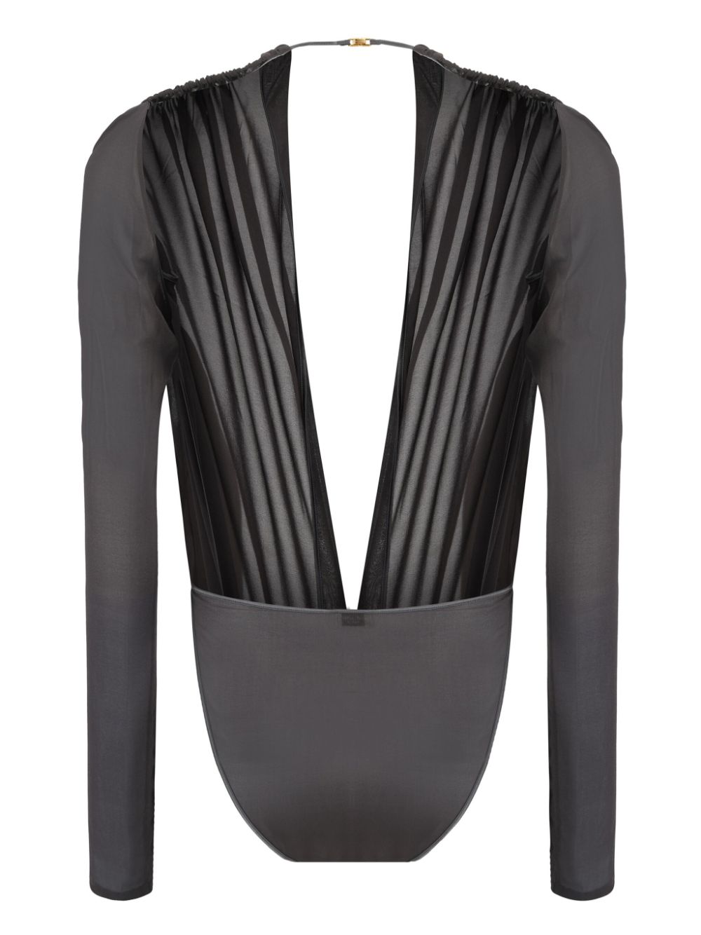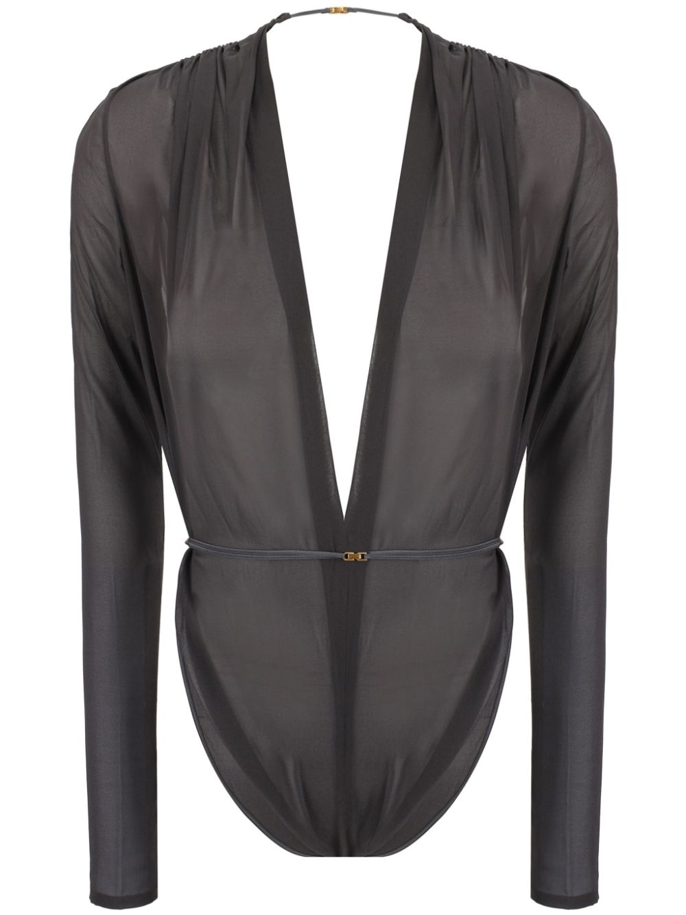 black silk blend adjustable waist strap adjustable strap to the rear long sleeves plunging V-neck We've partnered with Good On You — an independent agency that rates how brands perform in relation to their impact on the planet, people and animals, with a multi-criteria rating simplified to a five points scale. In order to be awarded our conscious label, larger brands need to score a minimum of four out of five ('Good'), while smaller brands must score at least three out of five ('It's A Start'). This item comes from a brand rated three out of five ('It's A Start') by Good on You at the time it was added on FARFETCH. Please note, this is a brand-level rating and does not guarantee that this product is made with conscious materials. Learn more about what makes a product Conscious on our Conscious Criteria page