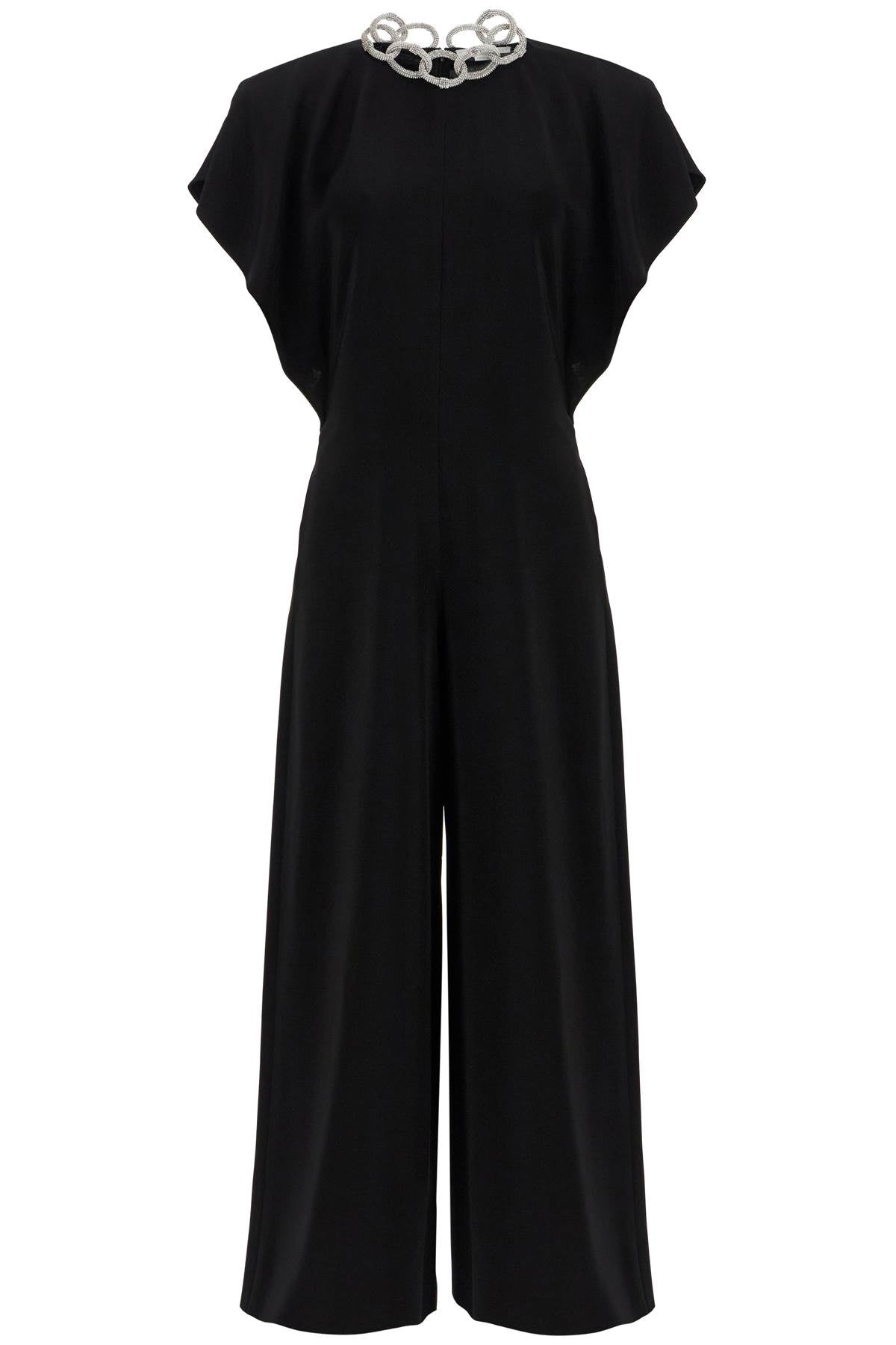 Crafted in stretch viscose cady, this Stella McCartney jumpsuit is embellished with a jewel chain with crystals on the neckline. The wide leg silhouette is defined by a fitted waist and structured shoulders with short butterfly sleeves. The straps are removable. Pockets are inserted at the hips, and there is an invisible zip closure at the back. The model is 177 cm tall and wears size IT 40.