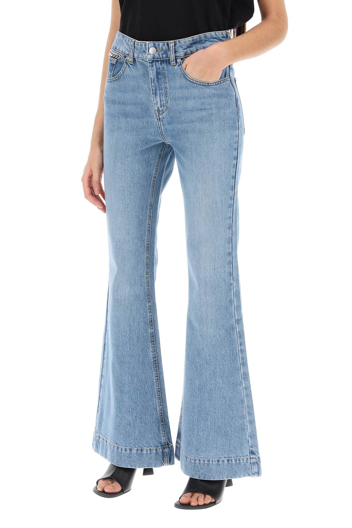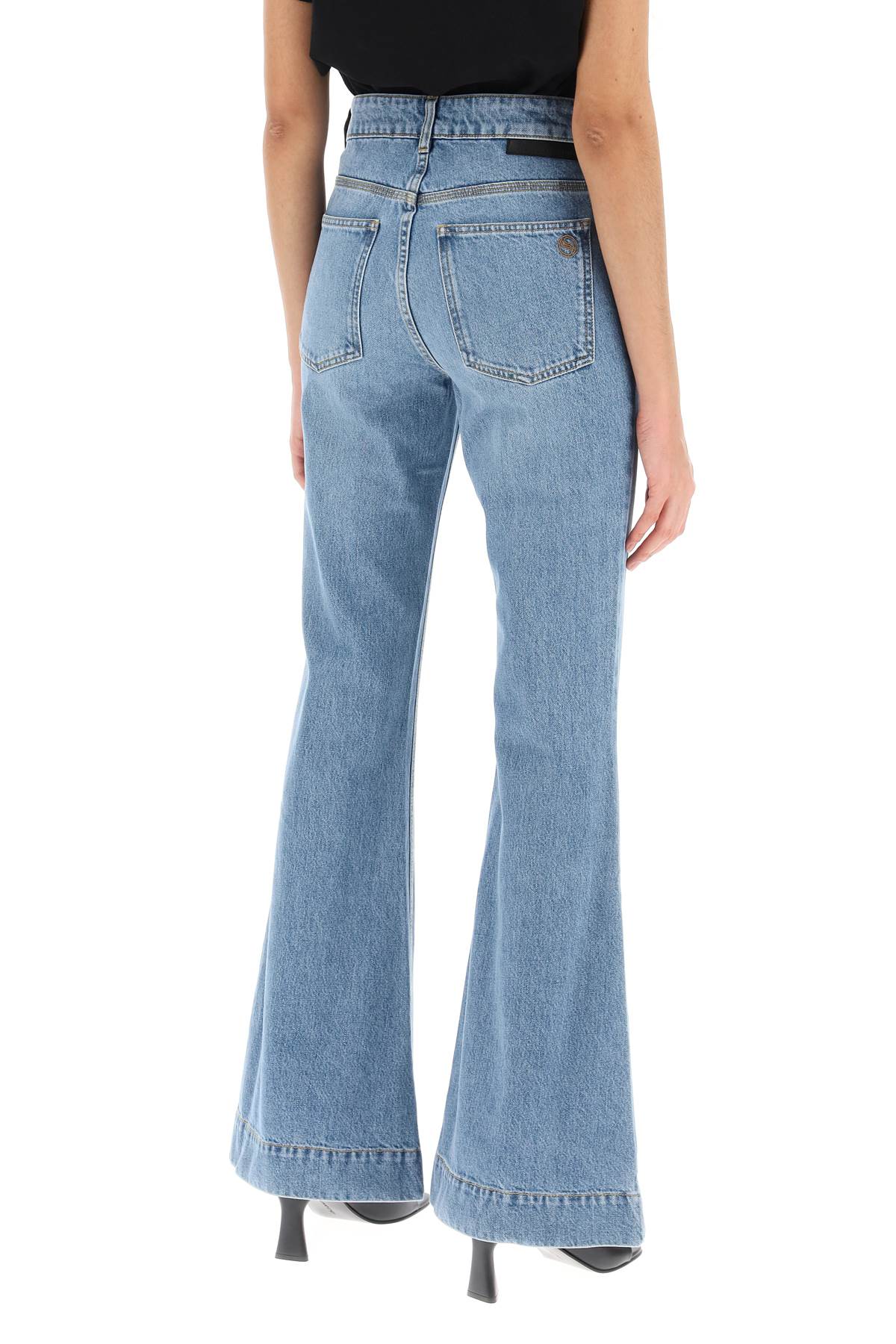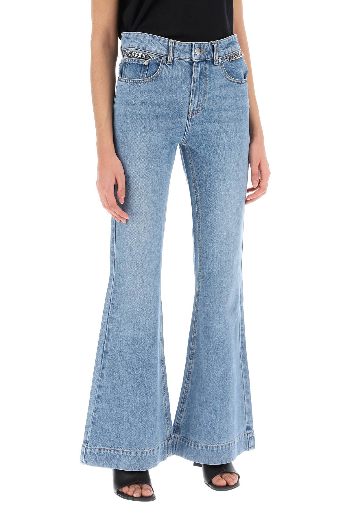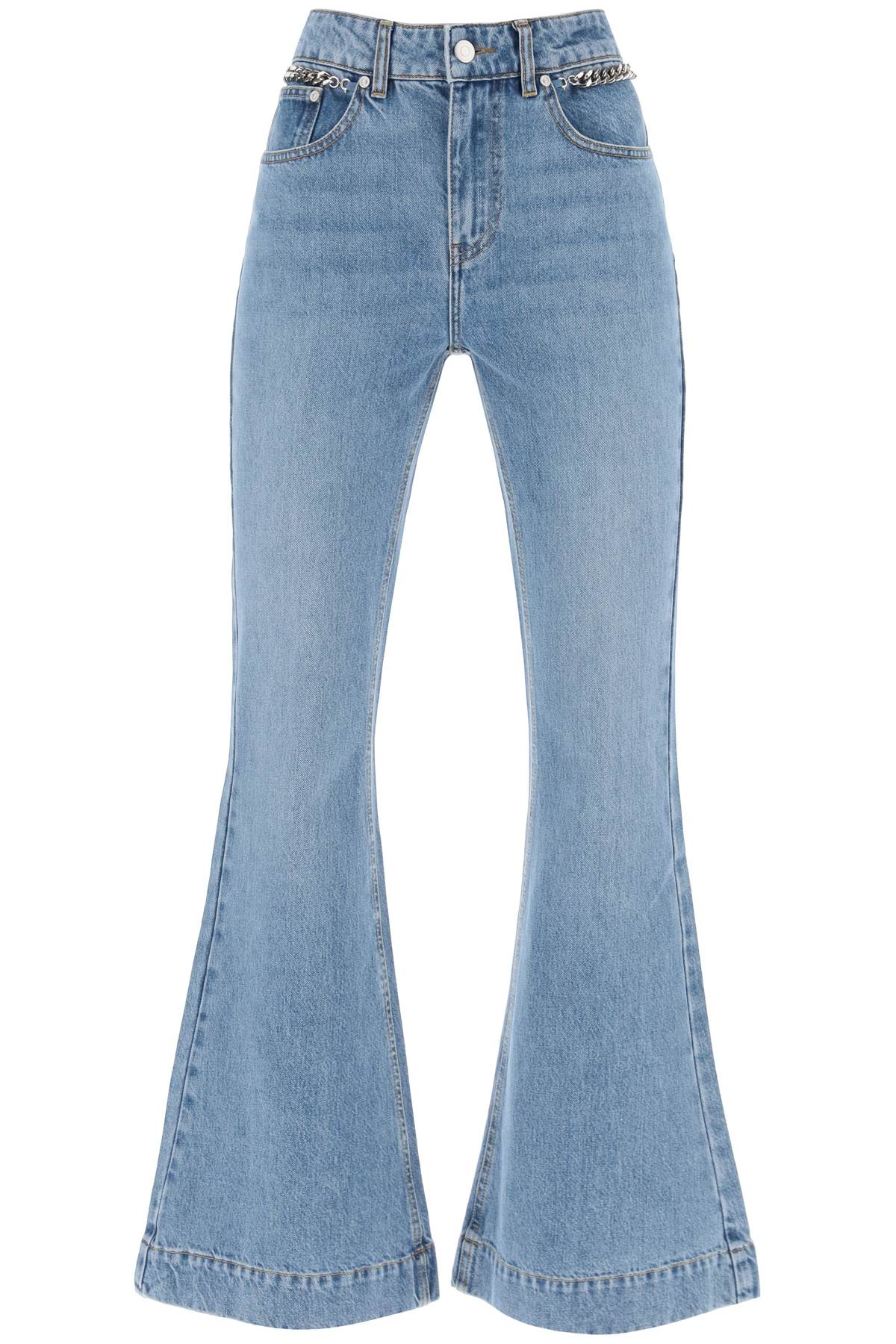 These Stella McCartney five-pocket jeans are characterized by a flared silhouette inspired by the '70s. Made of vintage medium wash denim, these pants are embellished with a Falabella chain along the pockets. They feature a mid-rise waist with belt loops, a front hidden zip closure, and button.