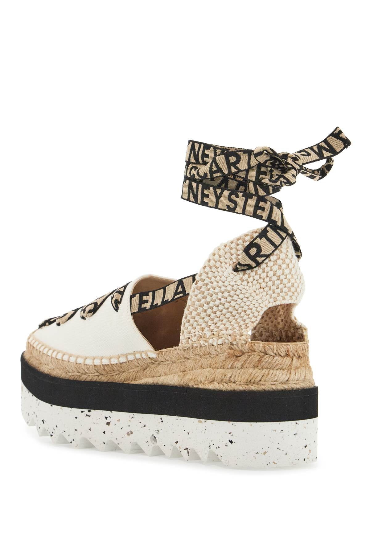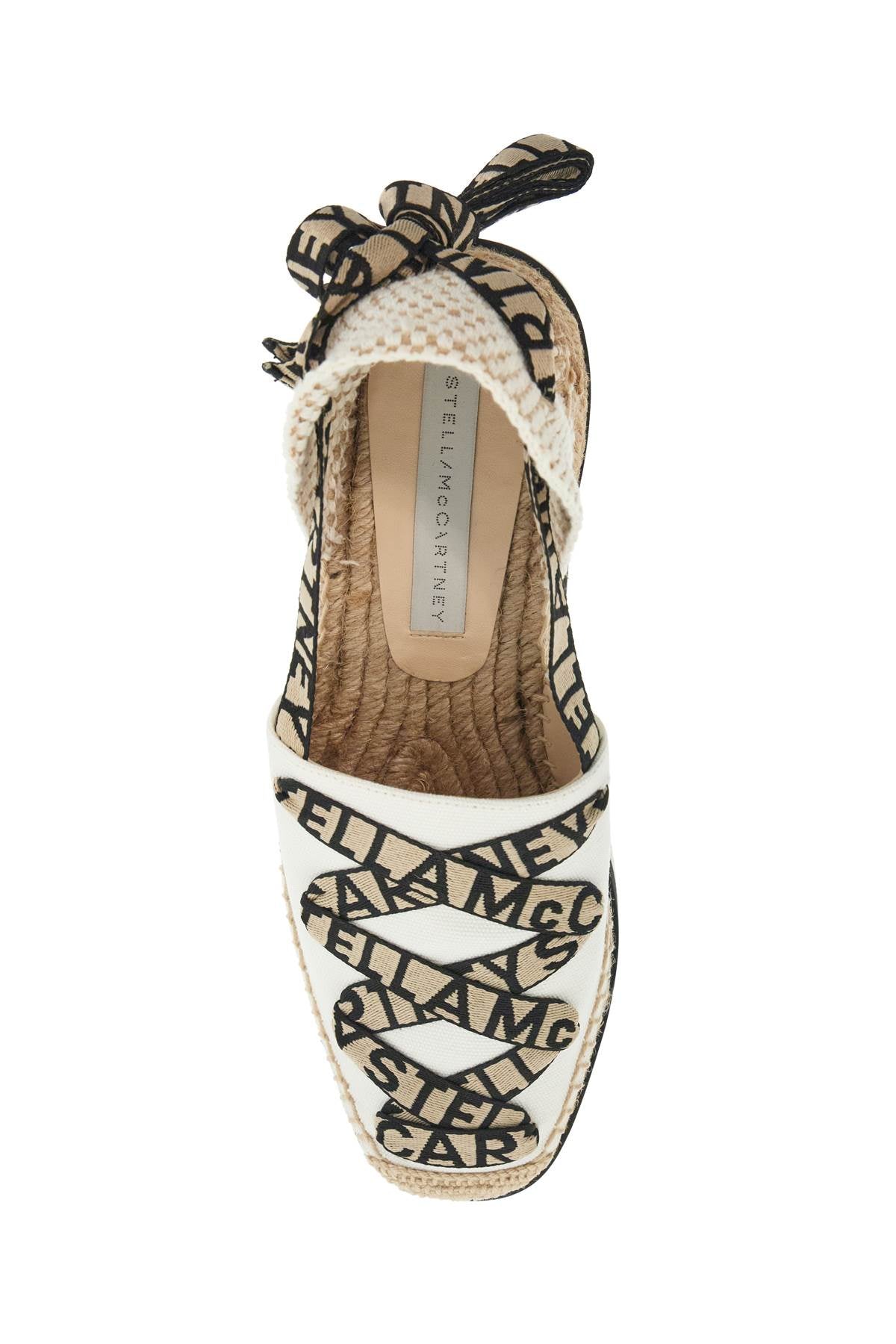 Stella McCartney Gaia espadrilles made of organic cotton featuring logoed ribbons to tie at the ankle and a notched rubber wedge sole. Size and Fit - Heel Height = 7,5 cm, Plateau Height = 5,5 cm,