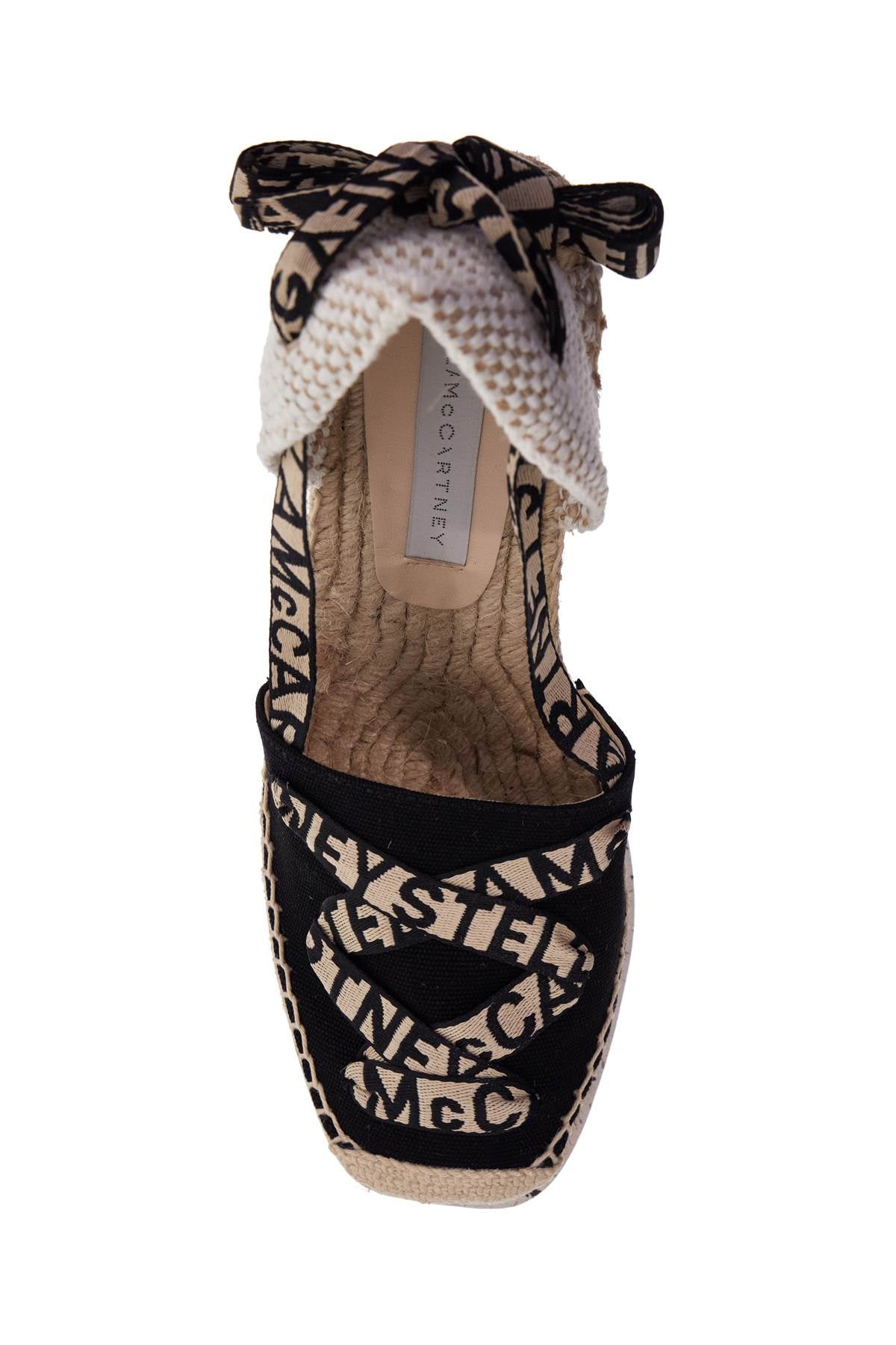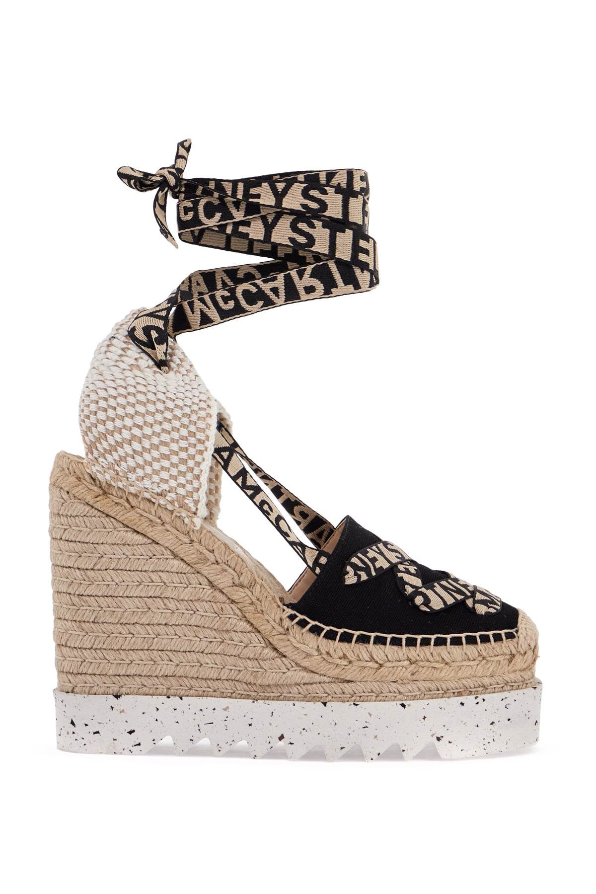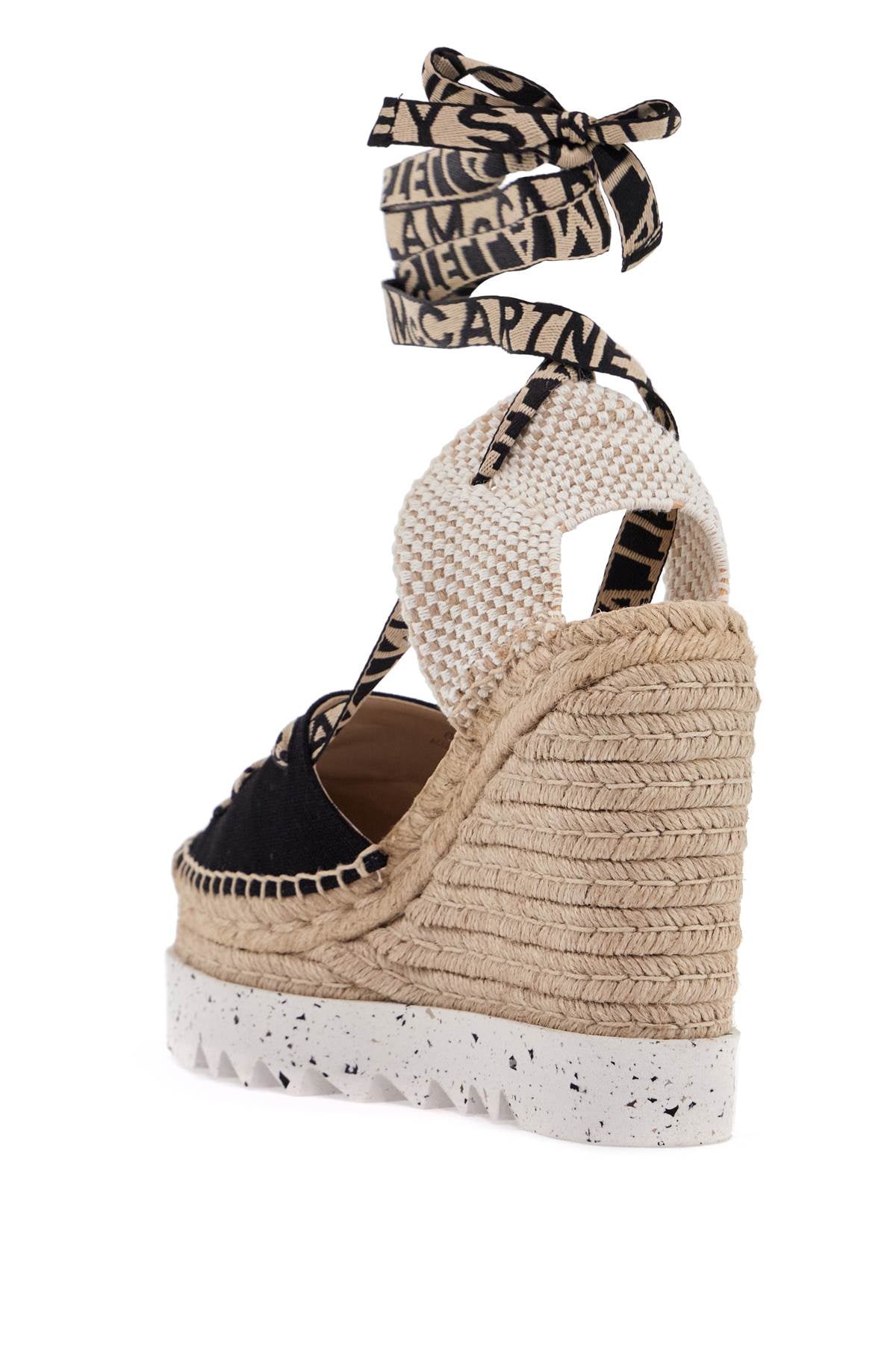 Stella McCartney "Gaia" espadrilles with organic cotton upper, natural jute wedge midsole, jacquard lettering logo ankle ties and saw-edge sole. Size and Fit - Heel Height = 12,5 cm, Plateau Height = 5 cm,