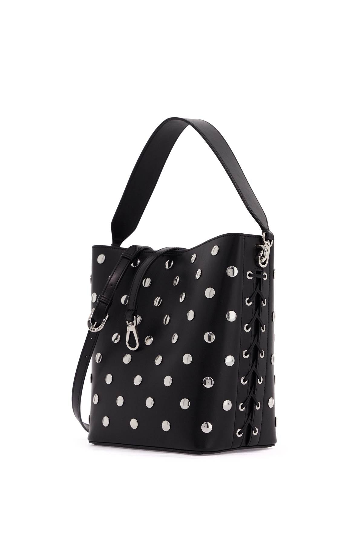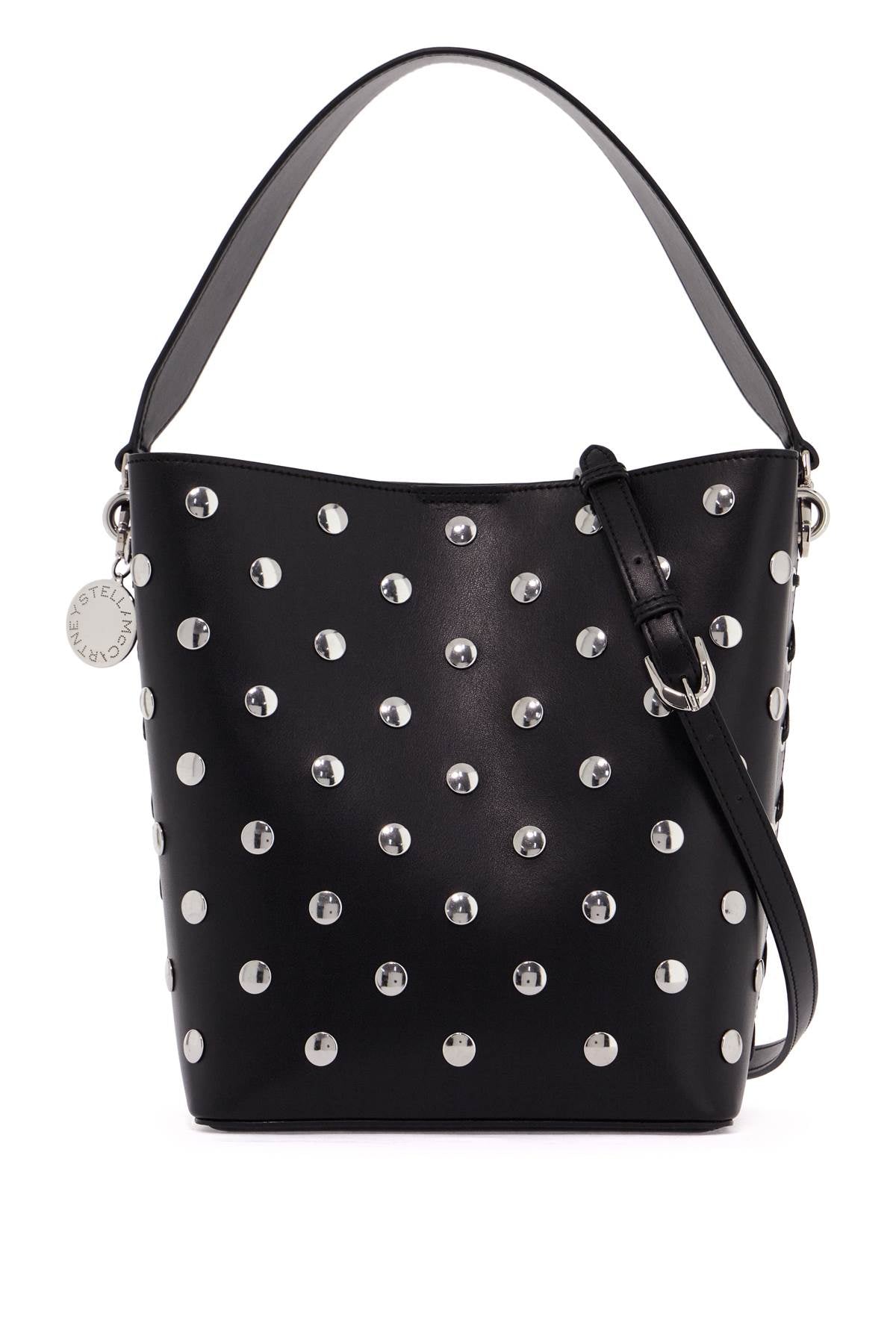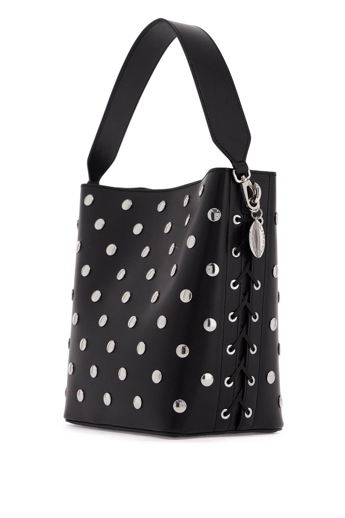 The Frayme bucket bag by Stella McCartney is handmade with their vegan and cruelty-free alternative to leather, embellished with silver studs all over and featuring waxed organic cotton laces on the sides. It can be carried with the removable handle or the adjustable additional shoulder strap and has a magnetic button closure. The interior is lined with suede-like microfiber and has an open pocket, complete with a medallion charm engraved with the logo on the side. Metal accessories have a silver finish. Size and Fit - Bag Length = 20 cm, Bag Height = 25 cm, Bag Weight = 14 cm, Handle Height = 19 cm,