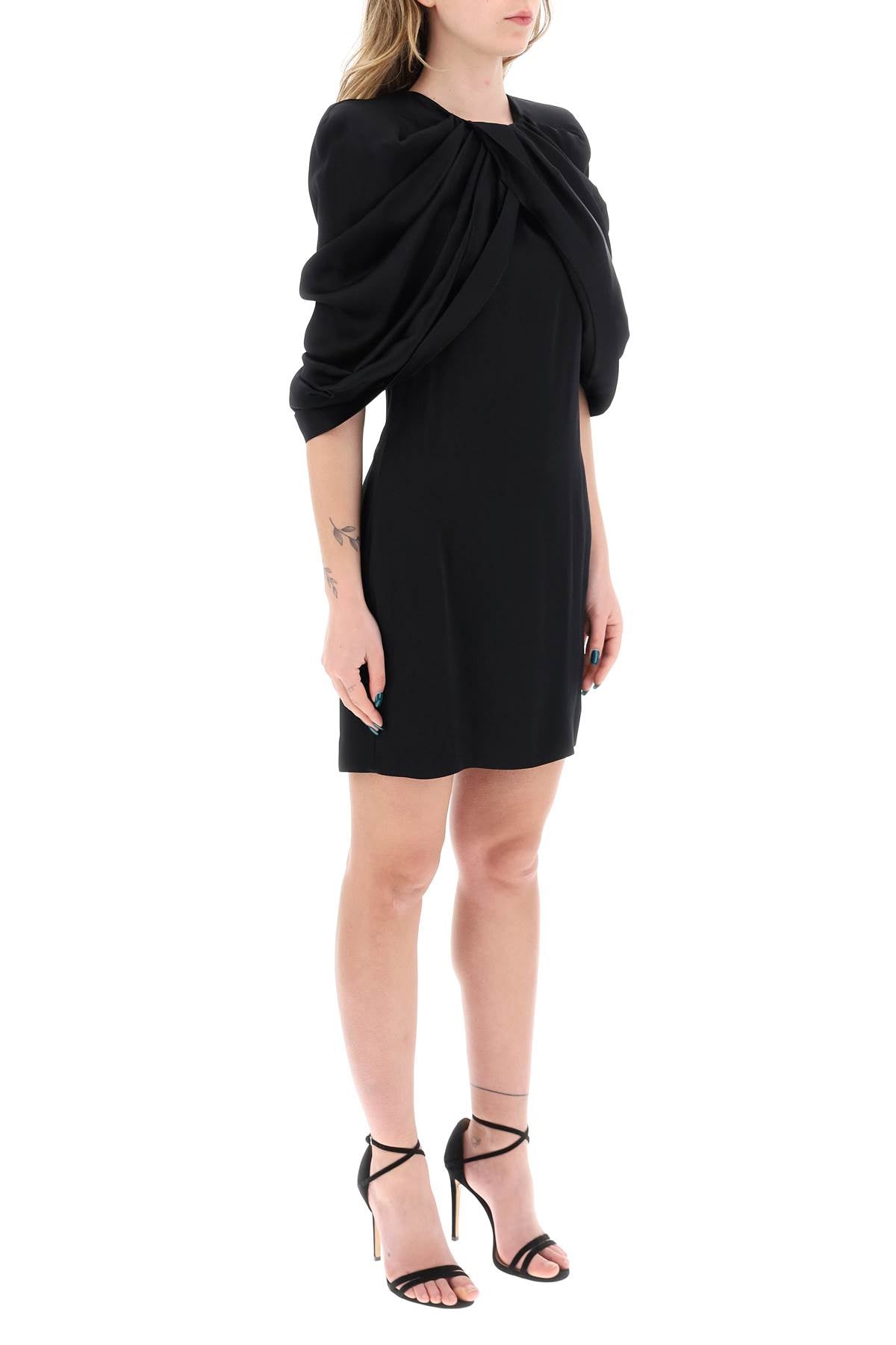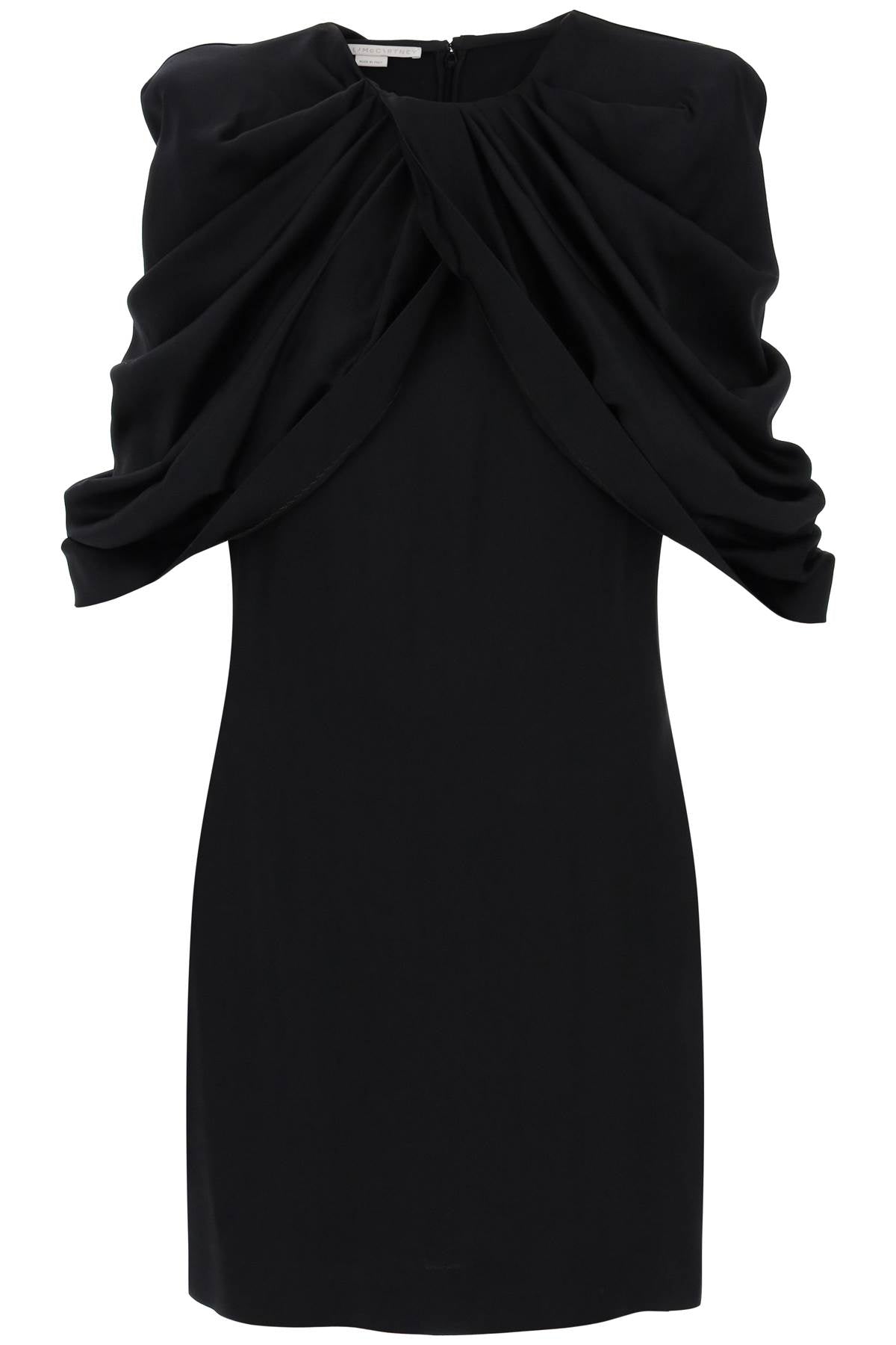 This mini dress by Stella McCartney is made of sustainable technical viscose satin, featuring wide petal sleeves enhanced by draping and internal straps. It has a round neckline and a hidden back zip closure. The fitted silhouette is worn by the model who is 177 cm tall and wears an IT size 40.