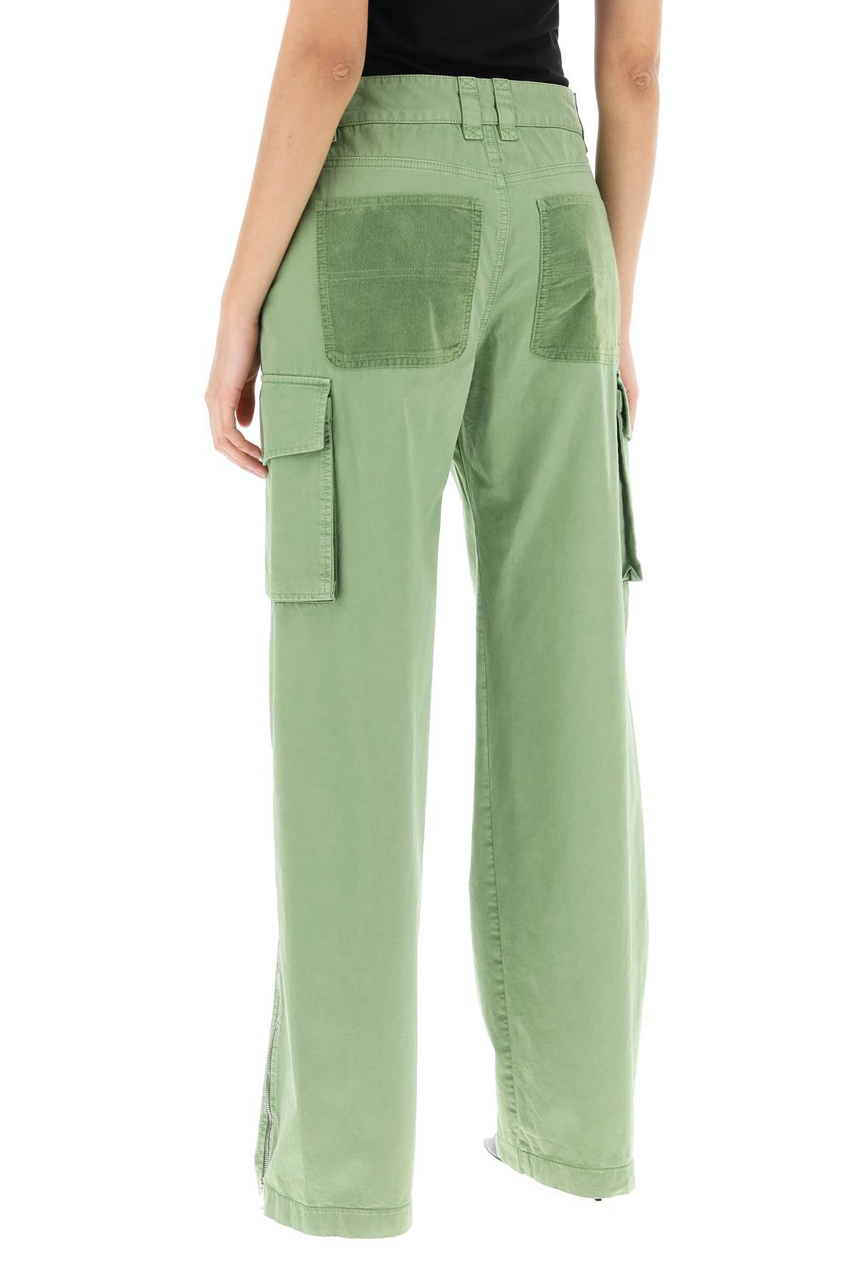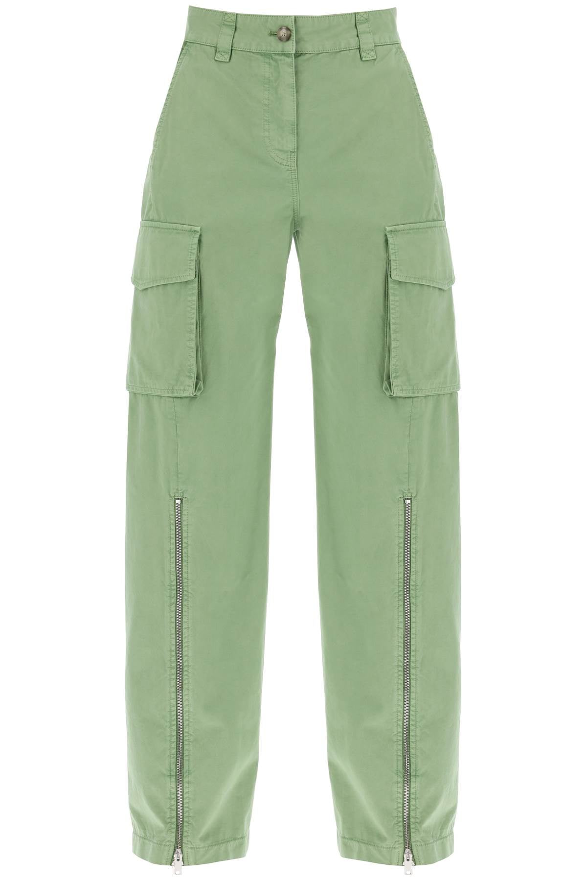 Stella McCartney organic cotton cargo pants with a straight cut and medium waist. Enriched by tonal corduroy details, they feature a four-pocket construction with two flap pockets on the legs. The gusset inserts with zippers at the bottom allow for customizable fit on the leg. Belt loops, front zip closure and button. The model is 177 cm tall and wears size IT 40.