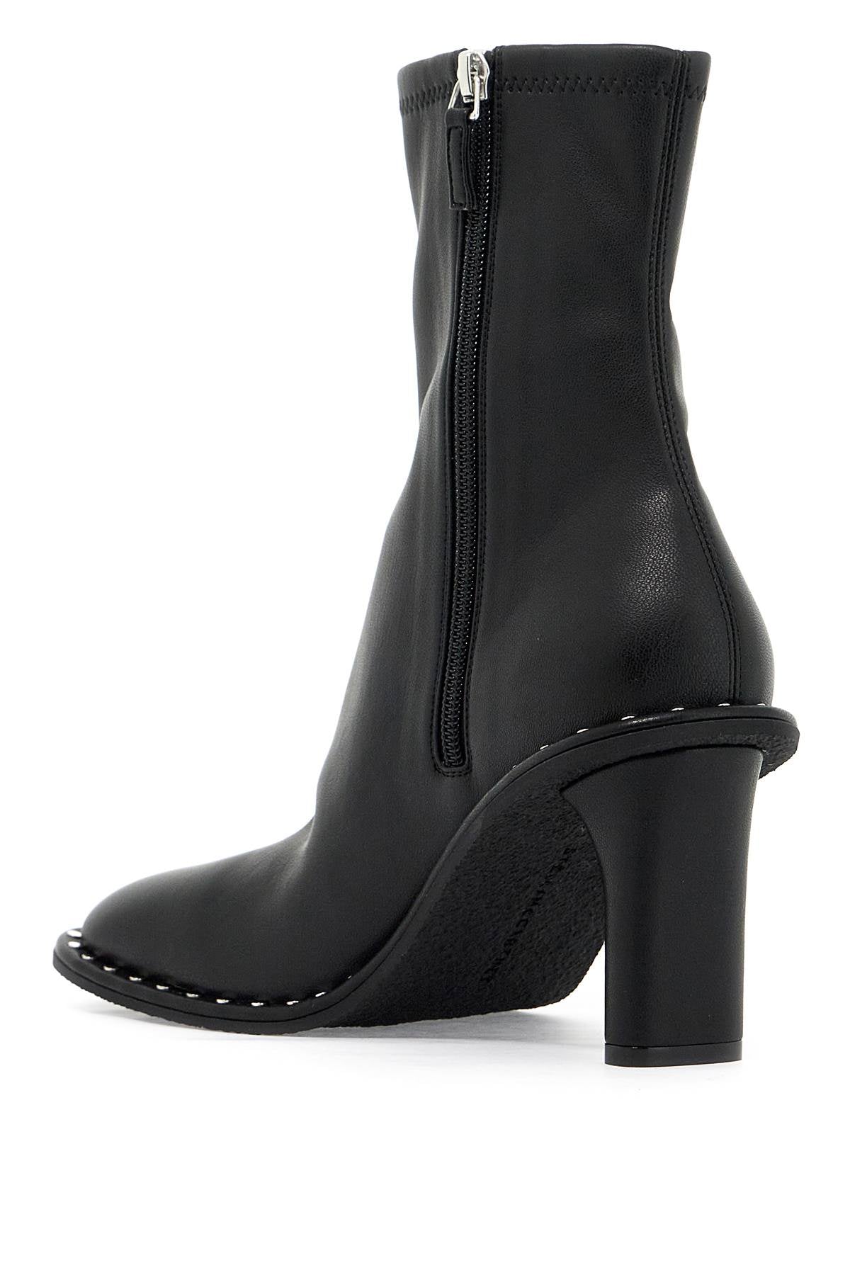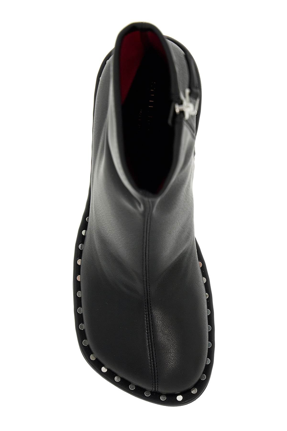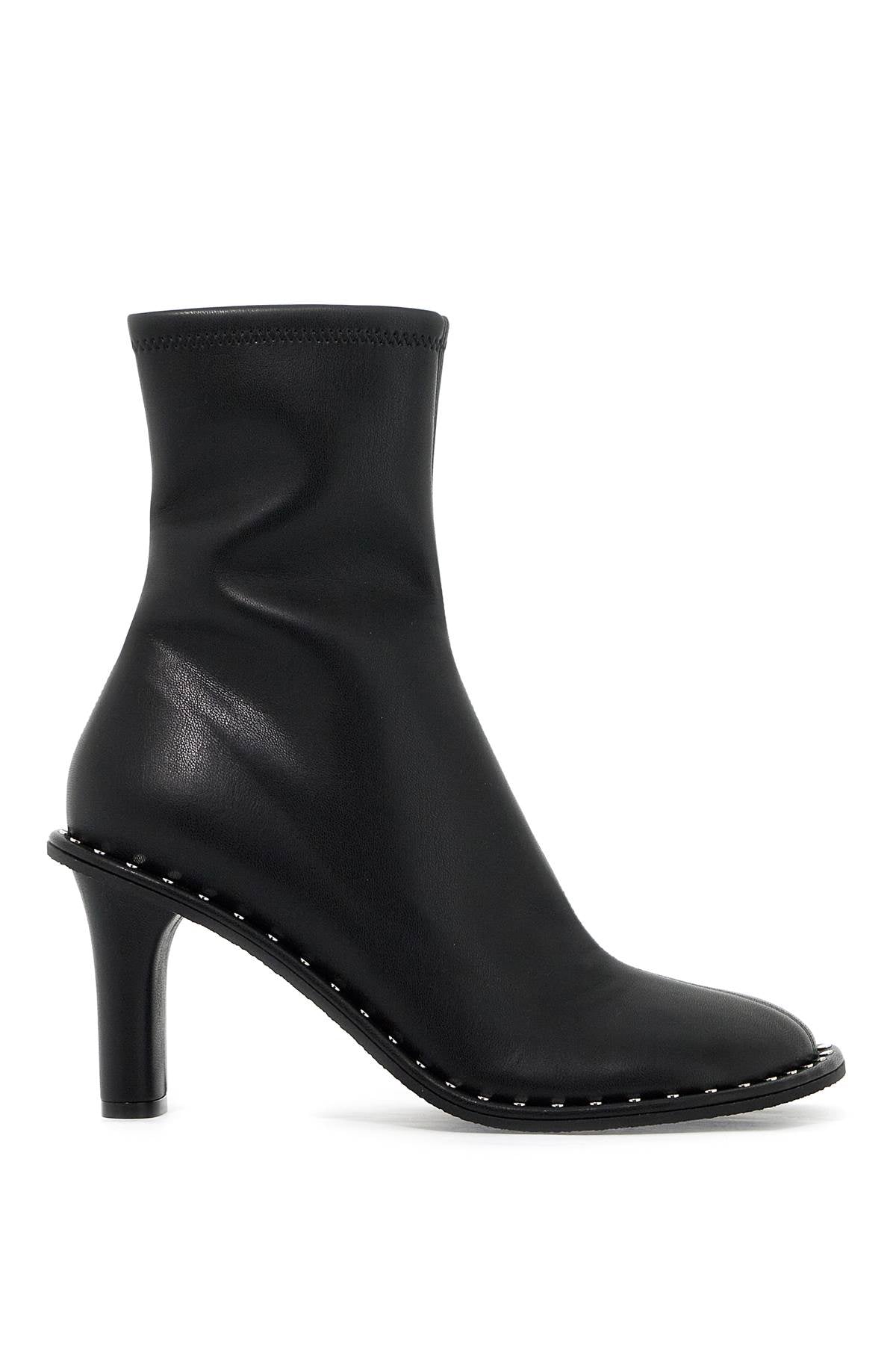 These Stella McCartney ankle boots are made of soft Alter Mat eco-leather, with a sock-like construction and wide, square toe inspired by equestrian style. They feature a side zip closure, fabric lining, silver metal studs decorating the welt, a covered Ryder heel, and a textured rubber sole. Size and Fit - Heel Height = 8,5 cm,