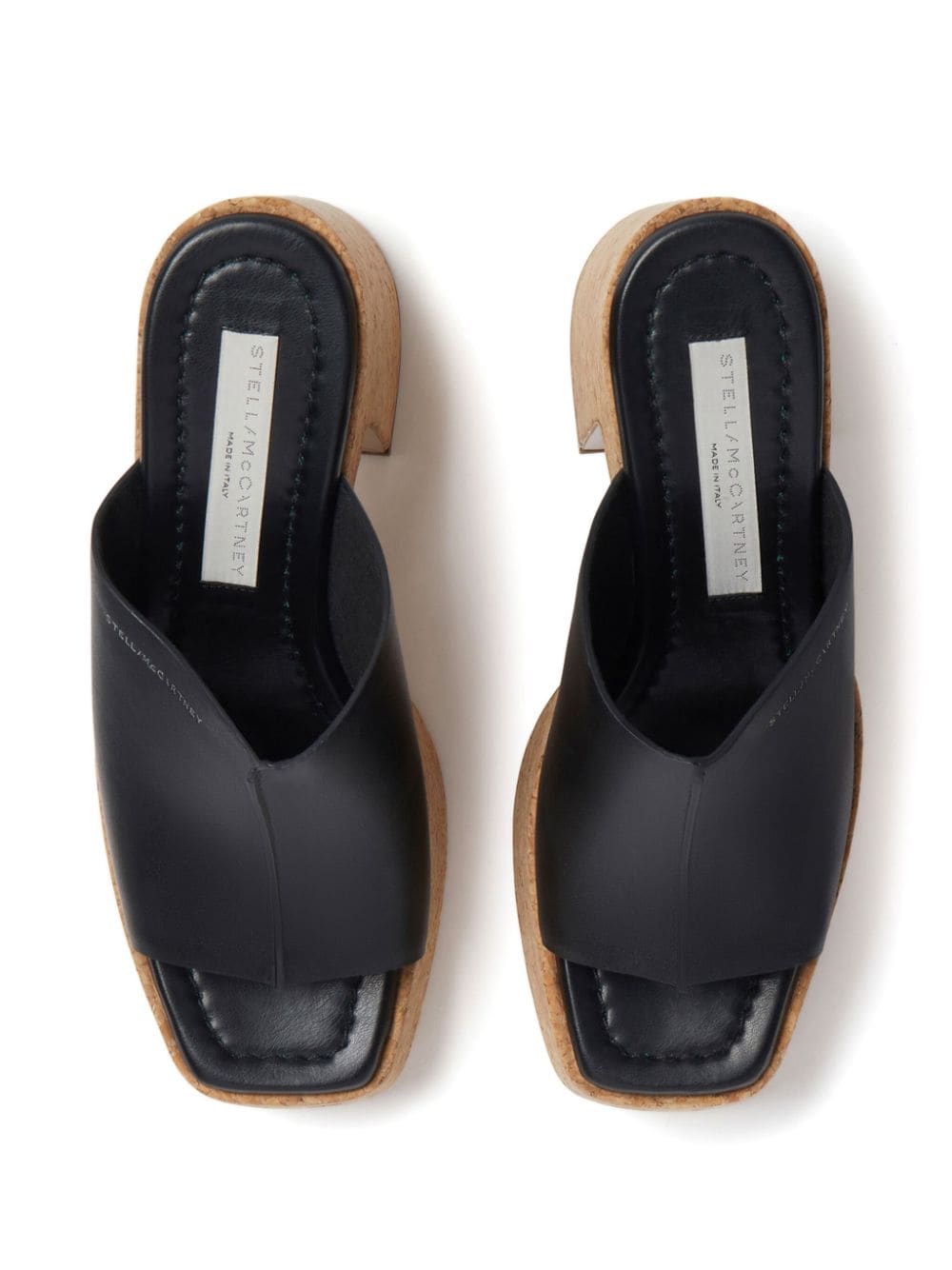 black faux leather branded insole open back slip-on style square open toe cork platform sole block heel This item is made from at least 50% recycled or upcycled materials. For recycled synthetic clothing products, we highly recommend using a microfibre-catching washing bag to ensure that no microplastics that can pollute water are released in the process. We've partnered with Good On You — an independent agency that rates how brands perform in relation to their impact on the planet, people and animals, with a multi-criteria rating simplified to a five points scale. In order to be awarded our conscious label, larger brands need to score a minimum of four out of five ('Good'), while smaller brands must score at least three out of five ('It's a start'). This item comes from a brand rated four out of five ('Good') by Good on You at the time it was added on FARFETCH. Please note, this is a brand-level rating and does not guarantee that this product is made with conscious materials. Learn m Size and Fit - Heel 4,7 in / 12 cm; Platform 1,6 in / 4 cm