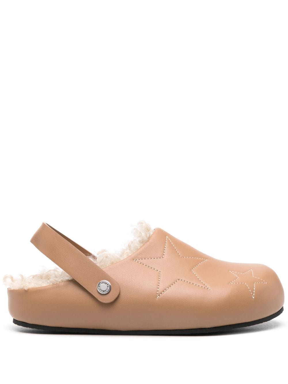 camel beige recycled polyester faux leather star embroidery to the front slingback strap asymmetric toe faux-shearling lining branded insole flat rubber sole This piece comes complete with a protective dust bag. This item is made from at least 50% recycled or upcycled materials. For recycled synthetic clothing products, we highly recommend using a microfibre-catching washing bag to ensure that no microplastics that can pollute water are released in the process. Learn more about what makes a product Conscious on our Conscious Criteria page Size and Fit - Heel 0,6 in / 1,5 cm