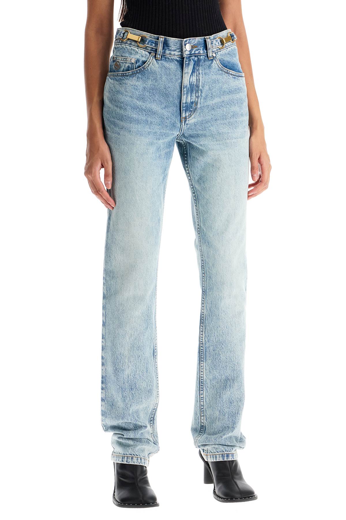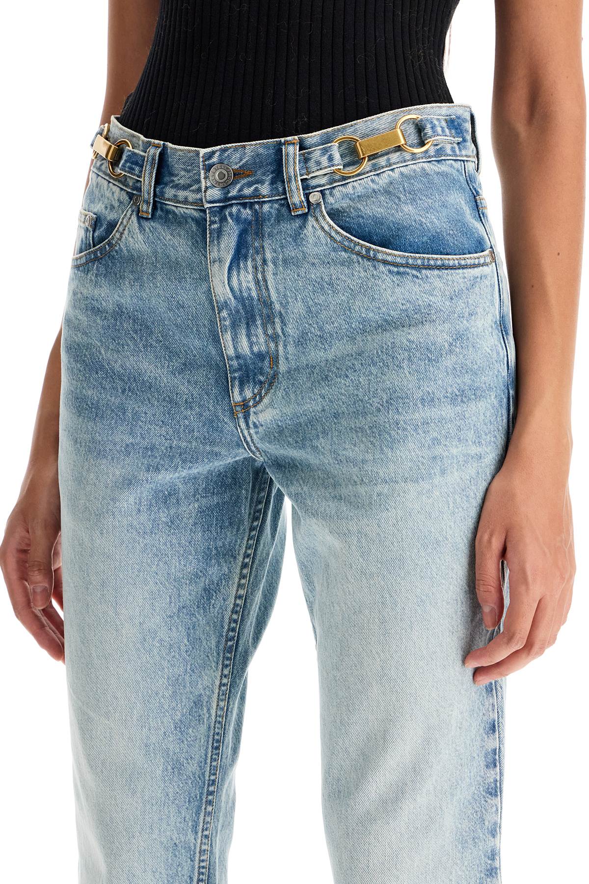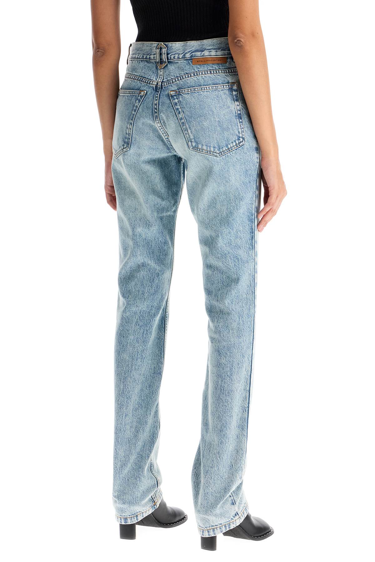 Stella McCartney's five-pocket jeans with a slim fit and straight leg, featuring a medium rise waist. Made of light wash denim, they are embellished with metallic details on the waistband and an embroidered logo on the fifth pocket. Zip and button closure, belt loops. The model is 177 cm tall and wears size 26.