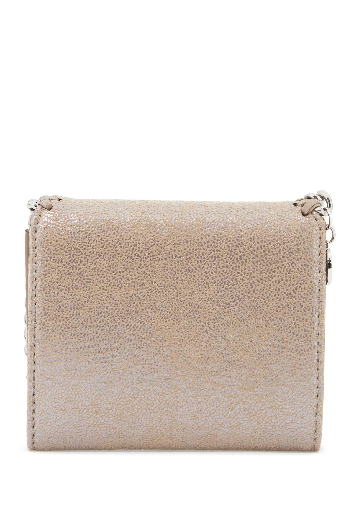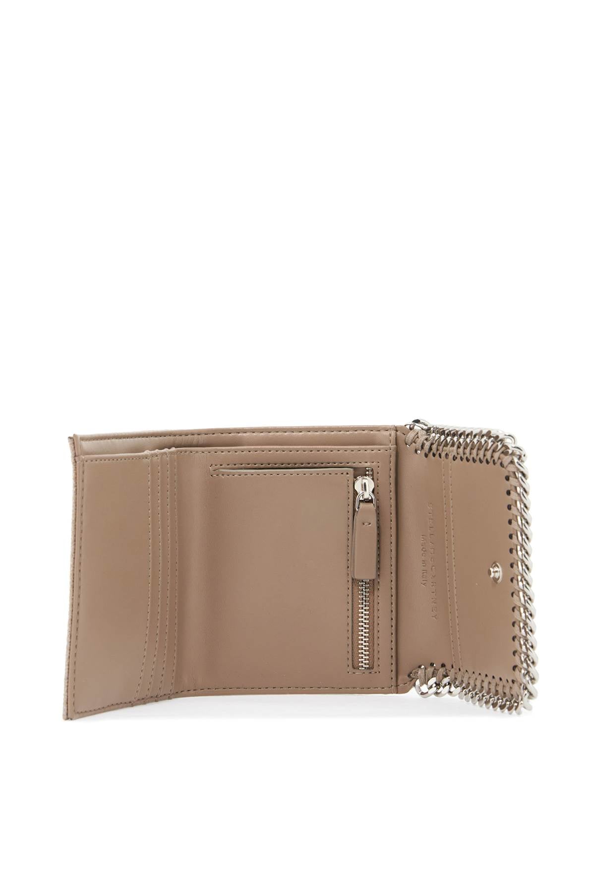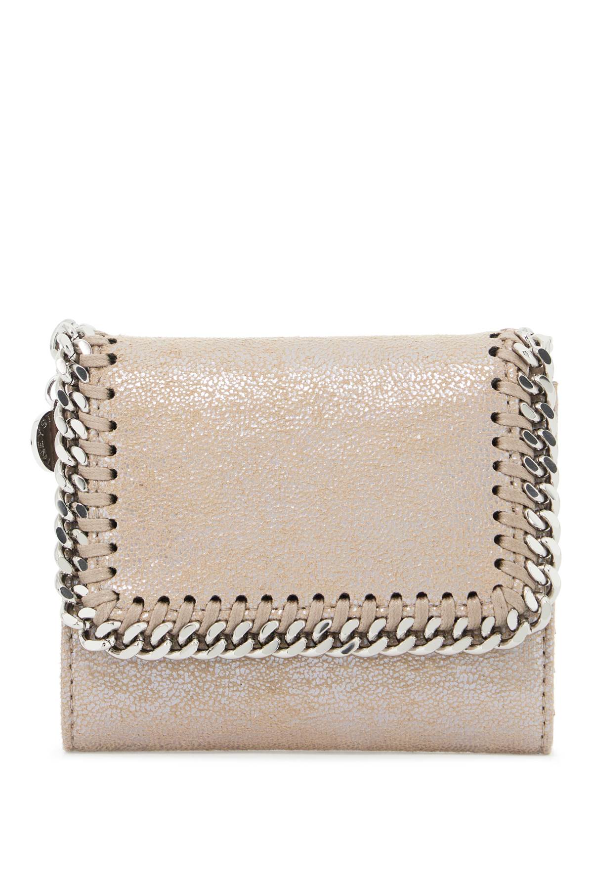 The small Falabella wallet by Stella McCartney is made of shaggy deer eco-leather and features a flap with a chain detail on the edges and the iconic Logo charm. It has a snap button closure, a lined interior in eco-leather and fabric with a compartment for bills, a ticket pocket, a zippered coin pocket, six credit card slots, and an embossed logo. The accessories are finished in silver metal. Size and Fit - Accessory Length = 11,5 cm, Accessory Height = 10 cm, Accessory Weight = 3 cm,