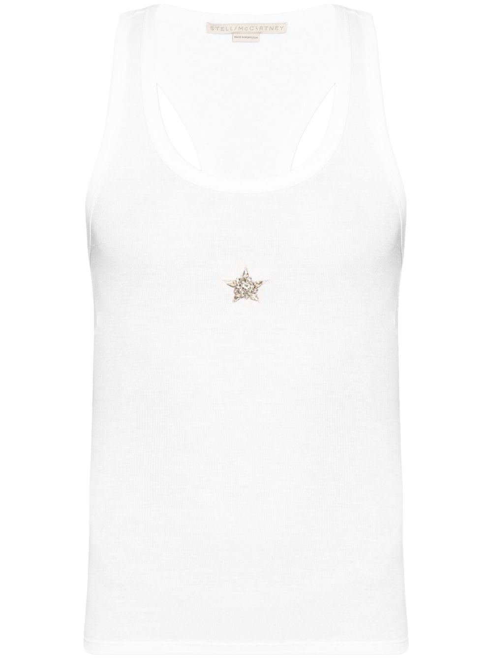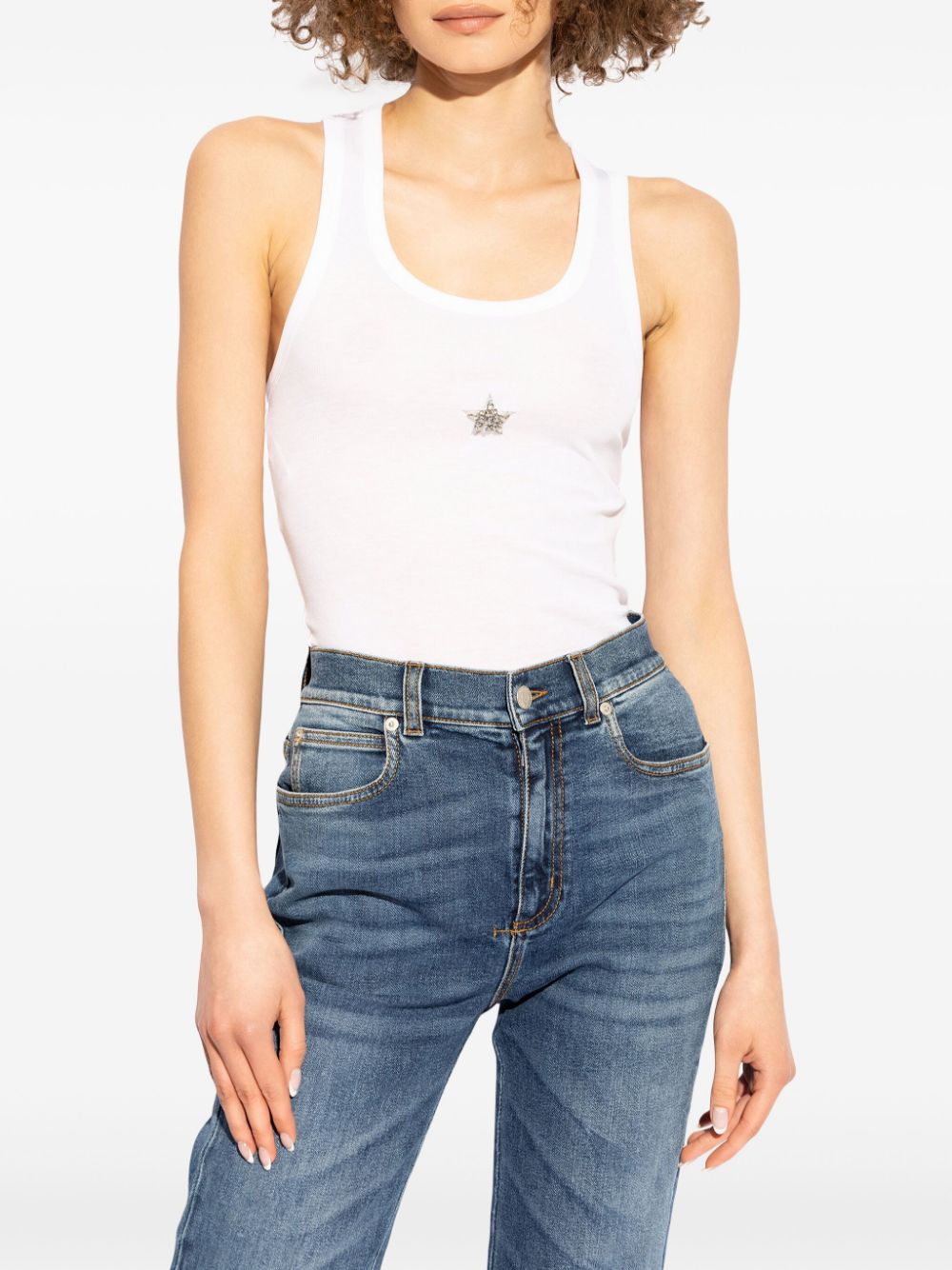 white lyocell fine ribbed appliqué detail round neck sleeveless racerback straight hem This item contains at least 50% materials which are certified or widely recognised as having a lower environmental impact through production and/or manufacturing processes that reduce water consumption and the use of harmful chemicals, or re-use by-products of the production process. Learn more about what makes a product Conscious on our Conscious Criteria page Size and Fit - This piece fits true to size. We recommend you get your regular size. Model is 1,75m / 5ft 8in wearing size S