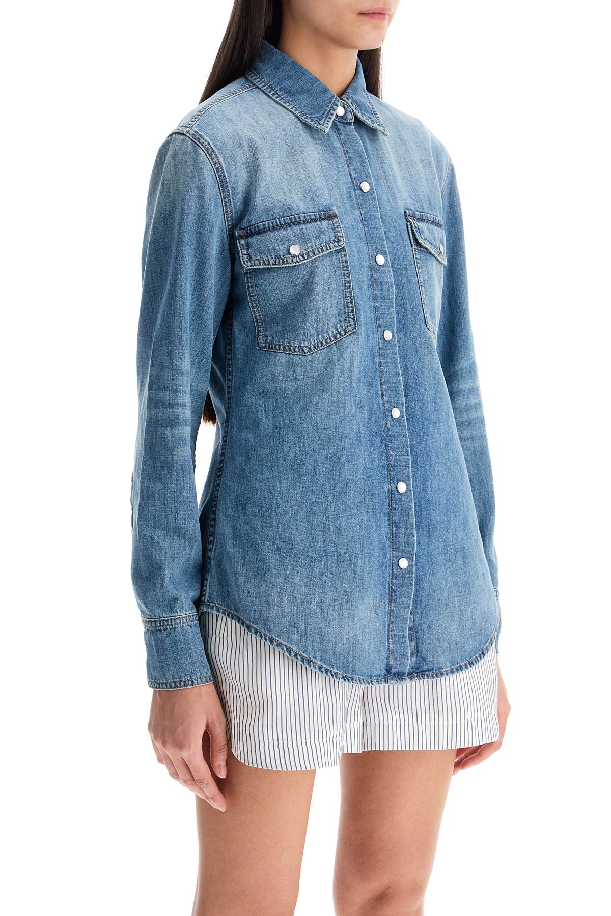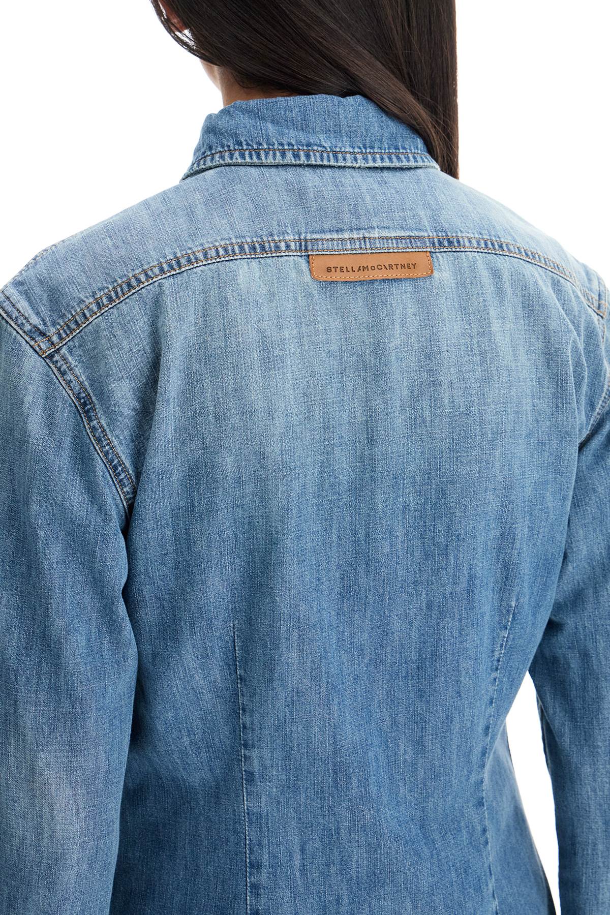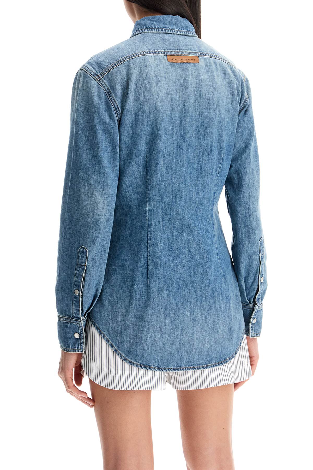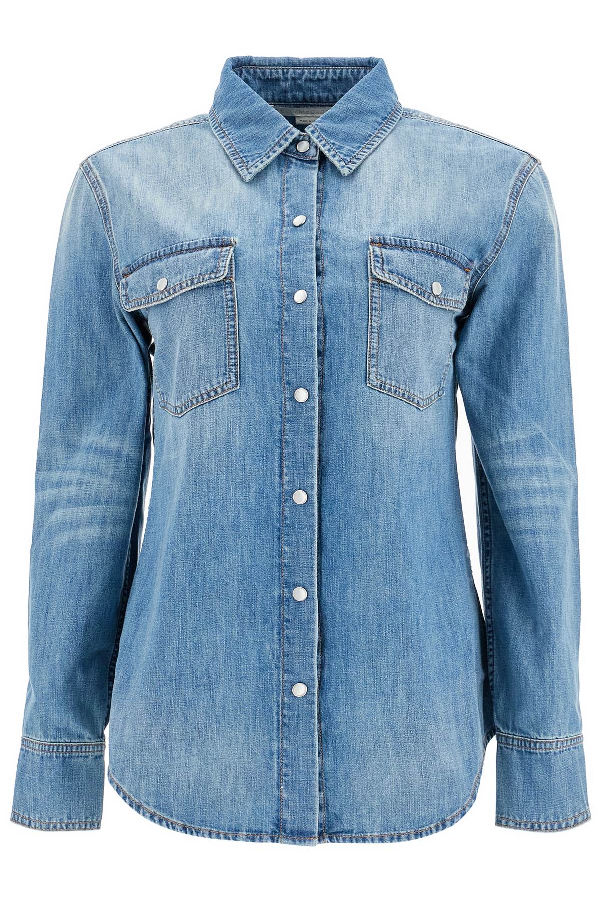 Crafted in medium vintage wash denim, this Stella McCartney shirt features a fitted silhouette with a collar, two front pockets, and a curved hem. It has snap button closures on the front and cuffs, as well as a logo label on the back yoke. The model is 177 cm tall and wears size XS.