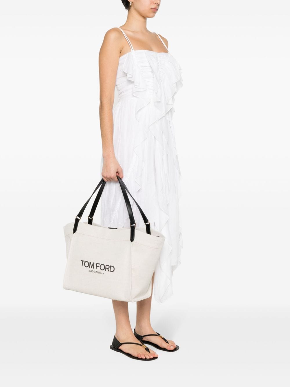 ecru, black cotton, linen/flax, calf leather canvas panelled design logo print to the front two contrasting flat top handles main compartment two internal patch pockets internal magnetic strap to adjust the size leather feet gold-tone hardware concealed magnetic fastening This piece comes complete with a protective dust bag. This item contains at least 50% materials which are certified or widely recognised as having a lower environmental impact through production and/or manufacturing processes that reduce water consumption and the use of harmful chemicals, or re-use by-products of the production process. Learn more about what makes a product Conscious on our Conscious Criteria page Size and Fit - Width 22,44 in / 57 cm