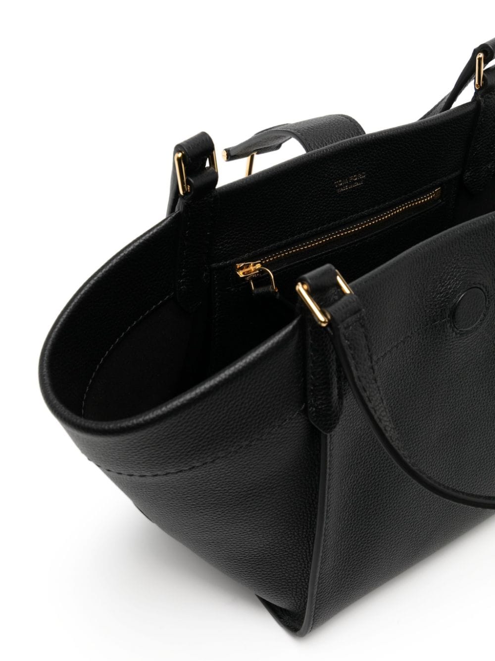 black leather grained texture two flat top handles detachable shoulder strap magnetic fastening gold-tone hardware main compartment internal zip-fastening pocket Size and Fit - Width 14,96 in / 38 cm Height 7,28 in / 18,5 cm Depth 4,53 in / 11,5 cm Handle 6,3 in / 16 cm Strap 16,54 in / 42 cm