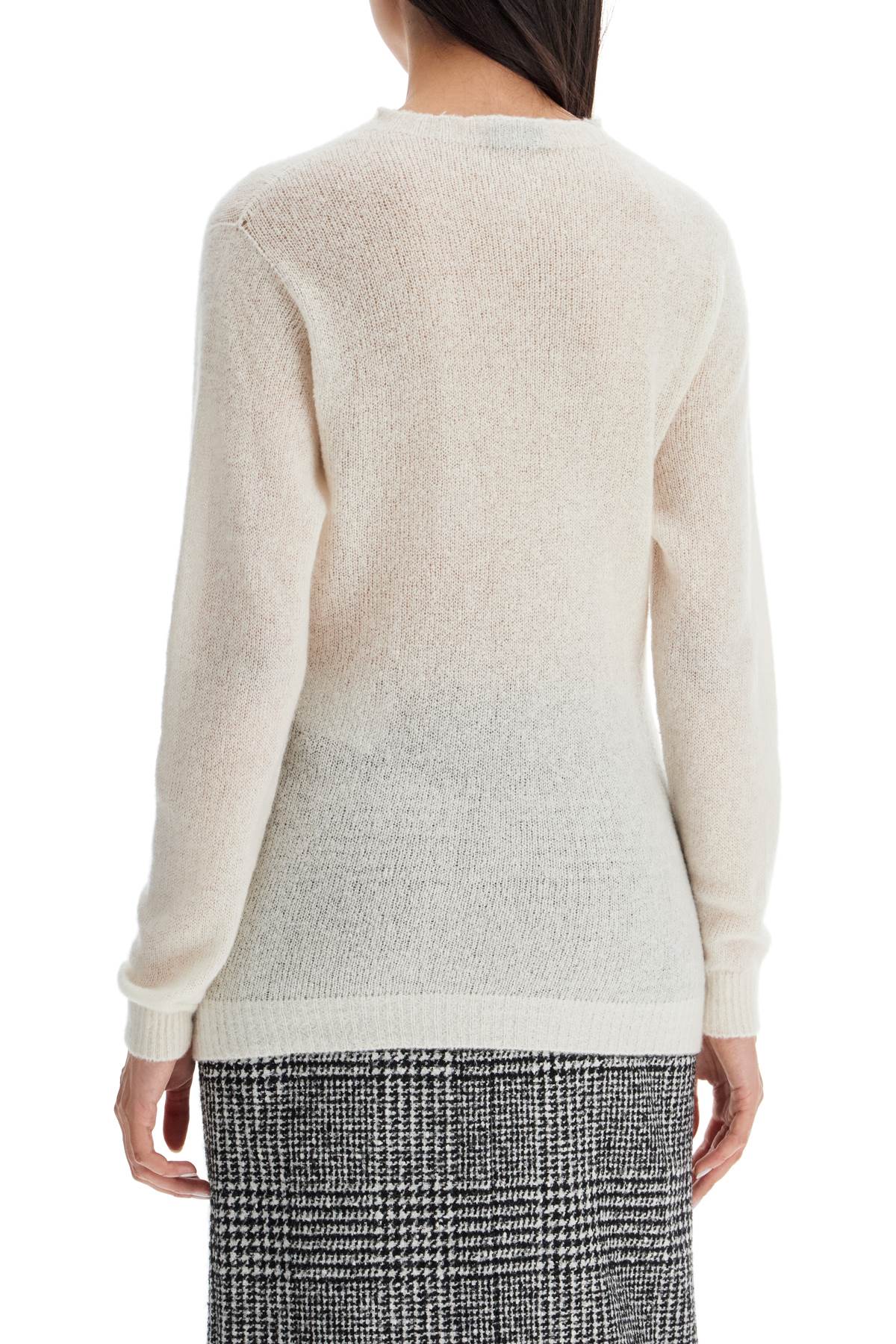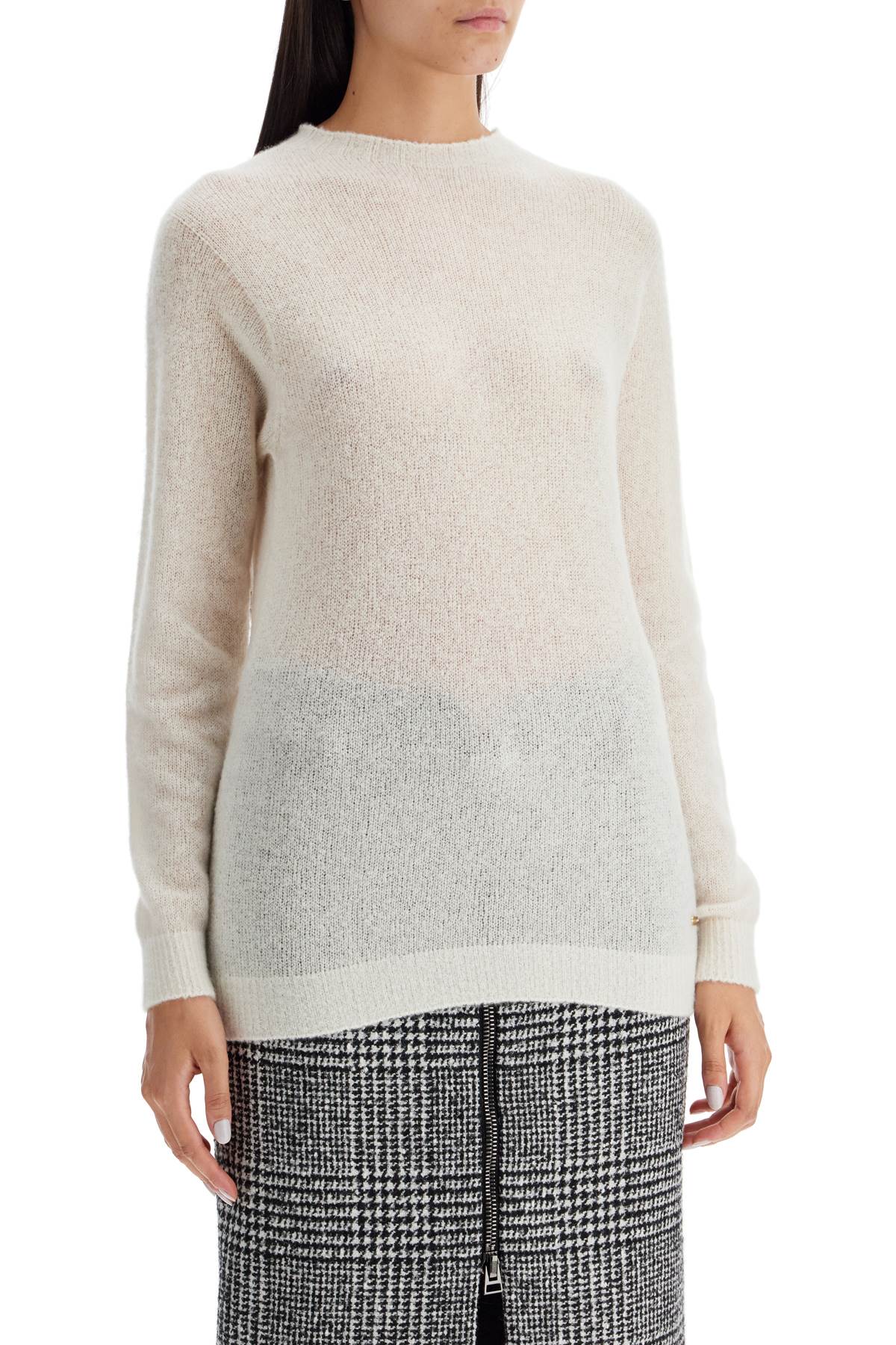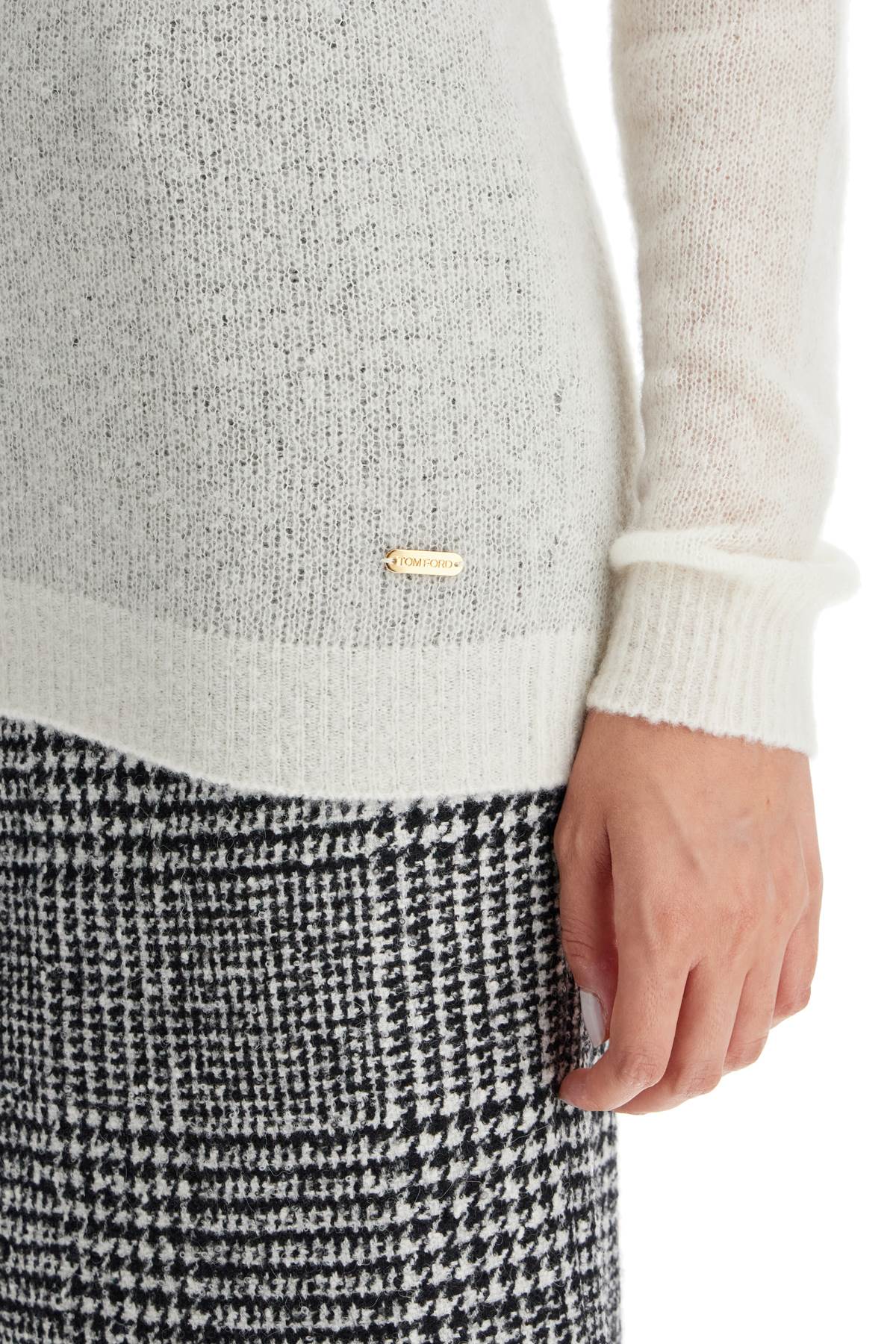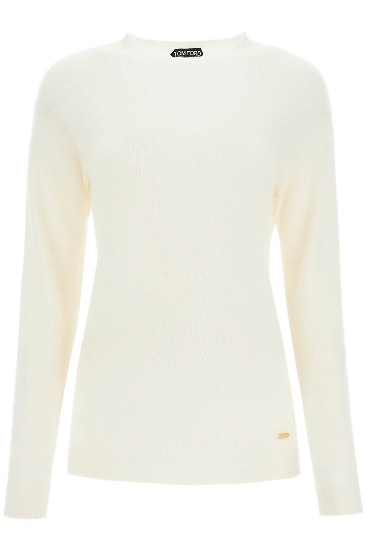 Crafted from soft cashmere and silk yarn with a wide weave, this Tom Ford crew neck sweater has a regular and elongated fit. It is finished with ribbed details and signed on the bottom with a logo metal plaque. The model is 177 cm tall and wears a size S.