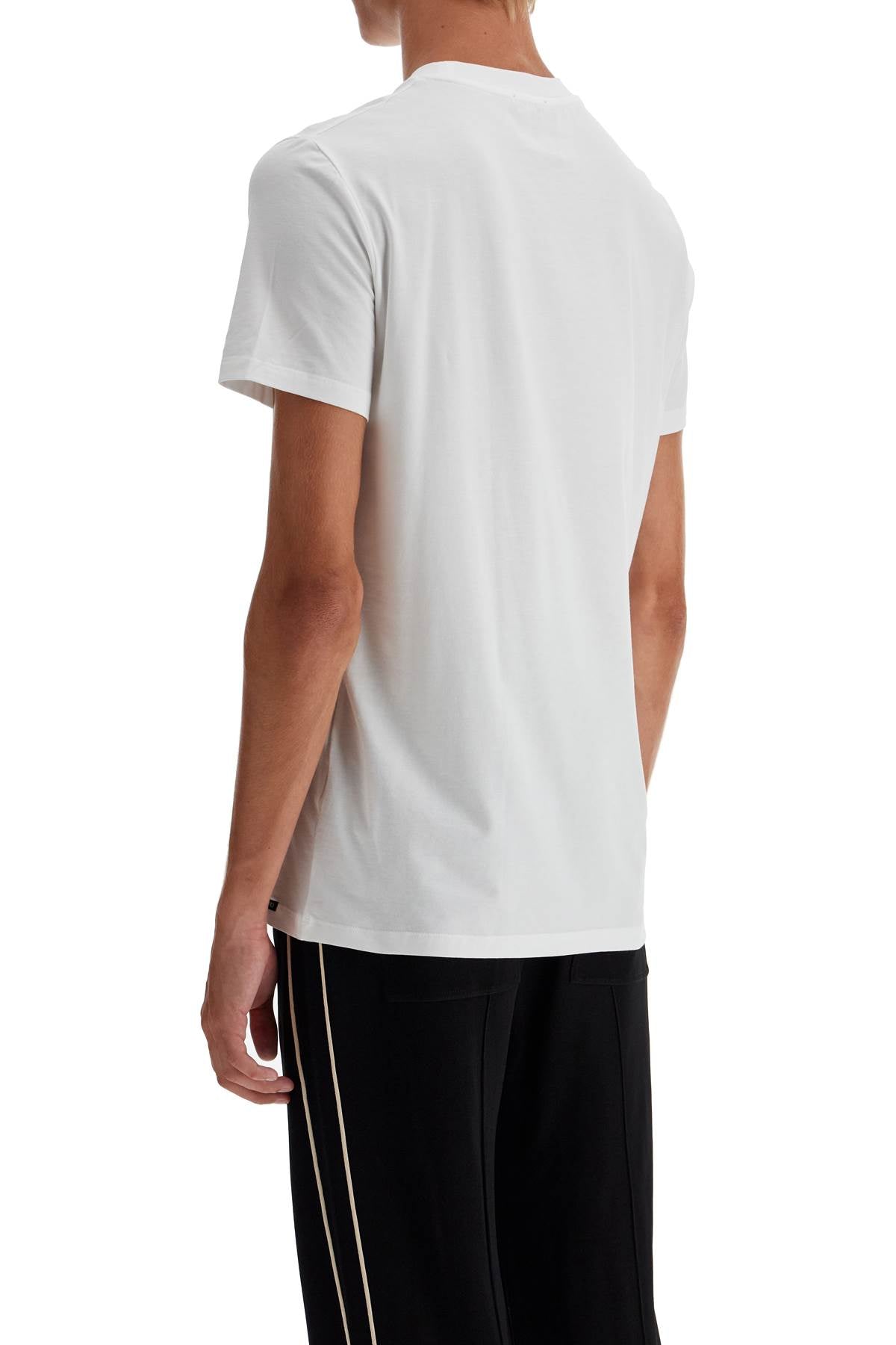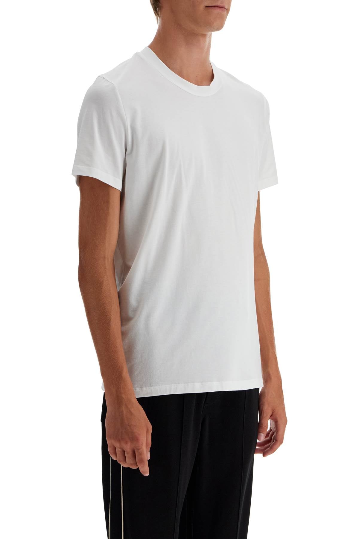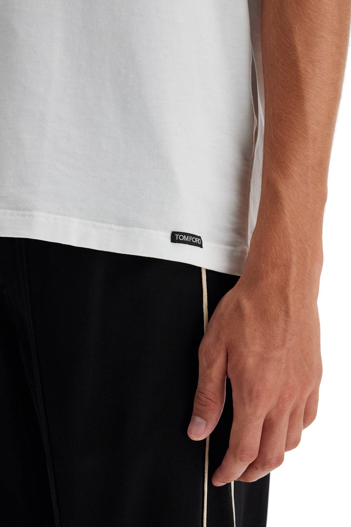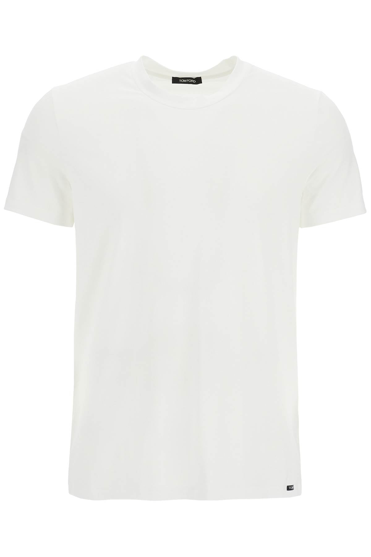 The Tom Ford classic crew neck undershirt is made of lightweight stretch jersey cotton and modal, with a logo label applied at the bottom. The model is 187 cm tall and wears size L.