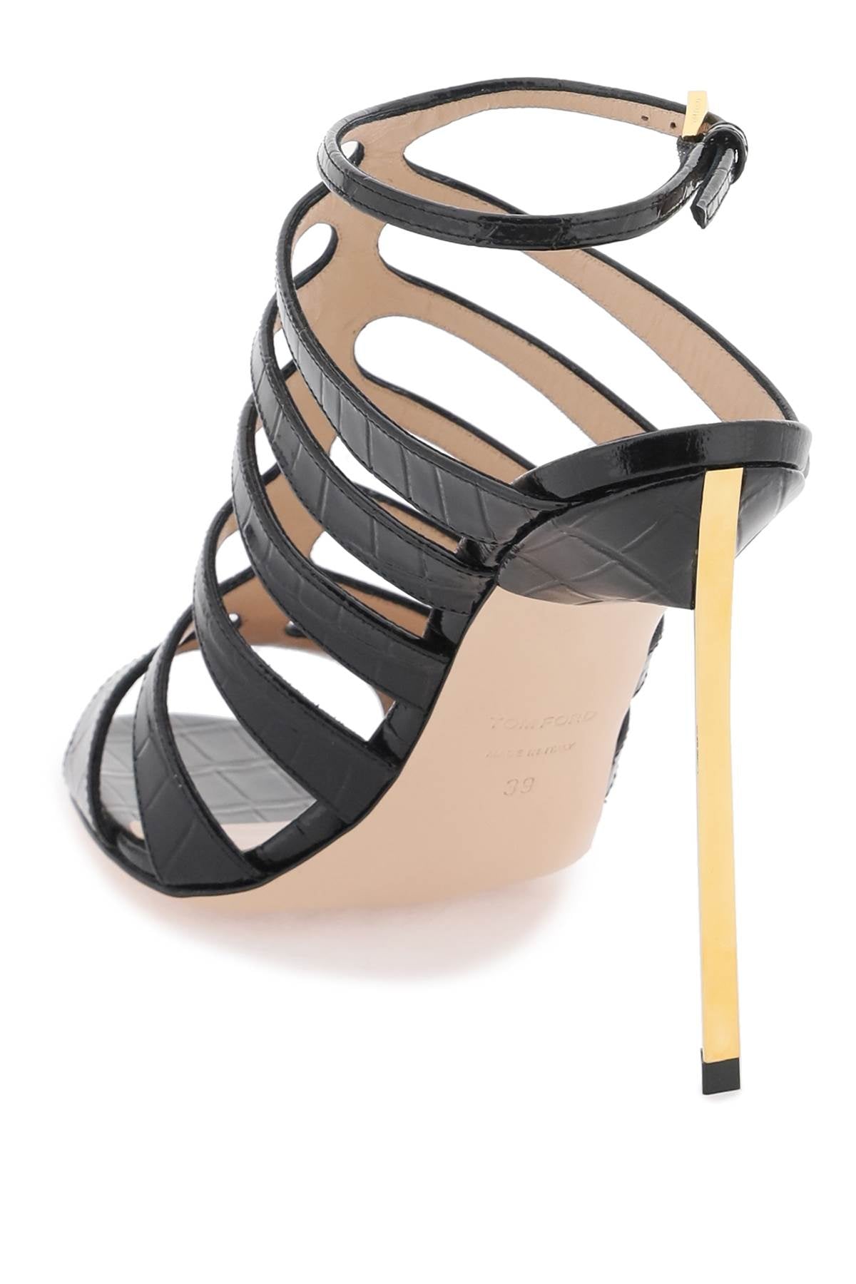 "Stylish and chic, these Tom Ford sandals are crafted in crocodile print leather with a cage structure and an adjustable ankle strap. The golden metal stiletto heel adds a touch of glamour, while the leather insole and sole provide comfort and durability." Size and Fit - Heel Height = 10 cm,