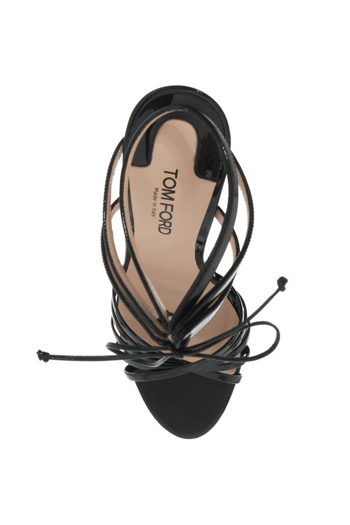 Tom Ford sandals made of patent leather and featuring thin criss-cross straps on the front and three additional ankle straps tied together with a knot. Leather insole, covered stiletto heel, and leather sole. Size and Fit - Heel Height = 11 cm,
