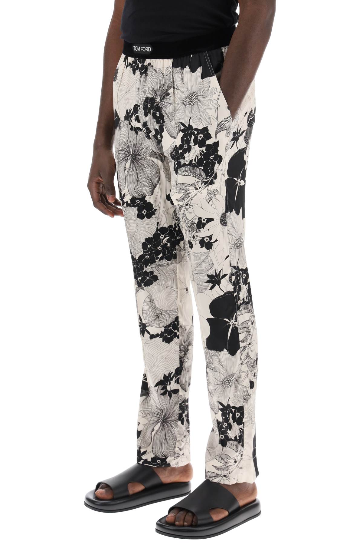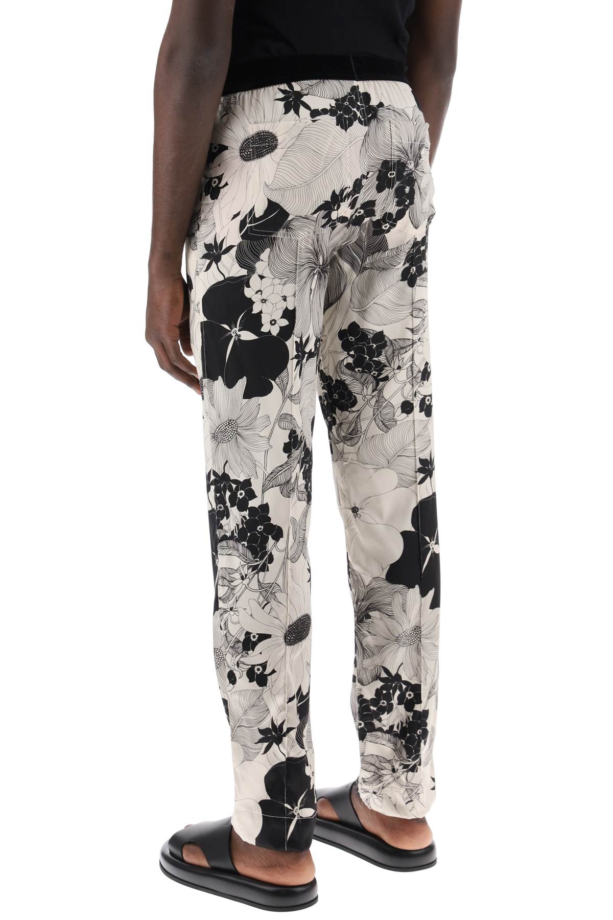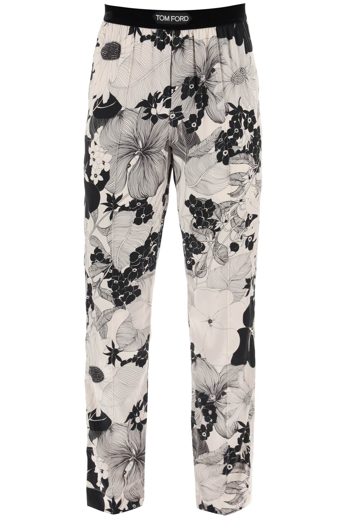 Tom Ford pajama pants crafted in stretch silk satin with floral pattern throughout. They feature logoed velvet elastic band on the waist, button fly, side slash pockets and back patch pockets. Relaxed fit with tapered cut and stitched crease. The model is 187 cm tall and wears size M.