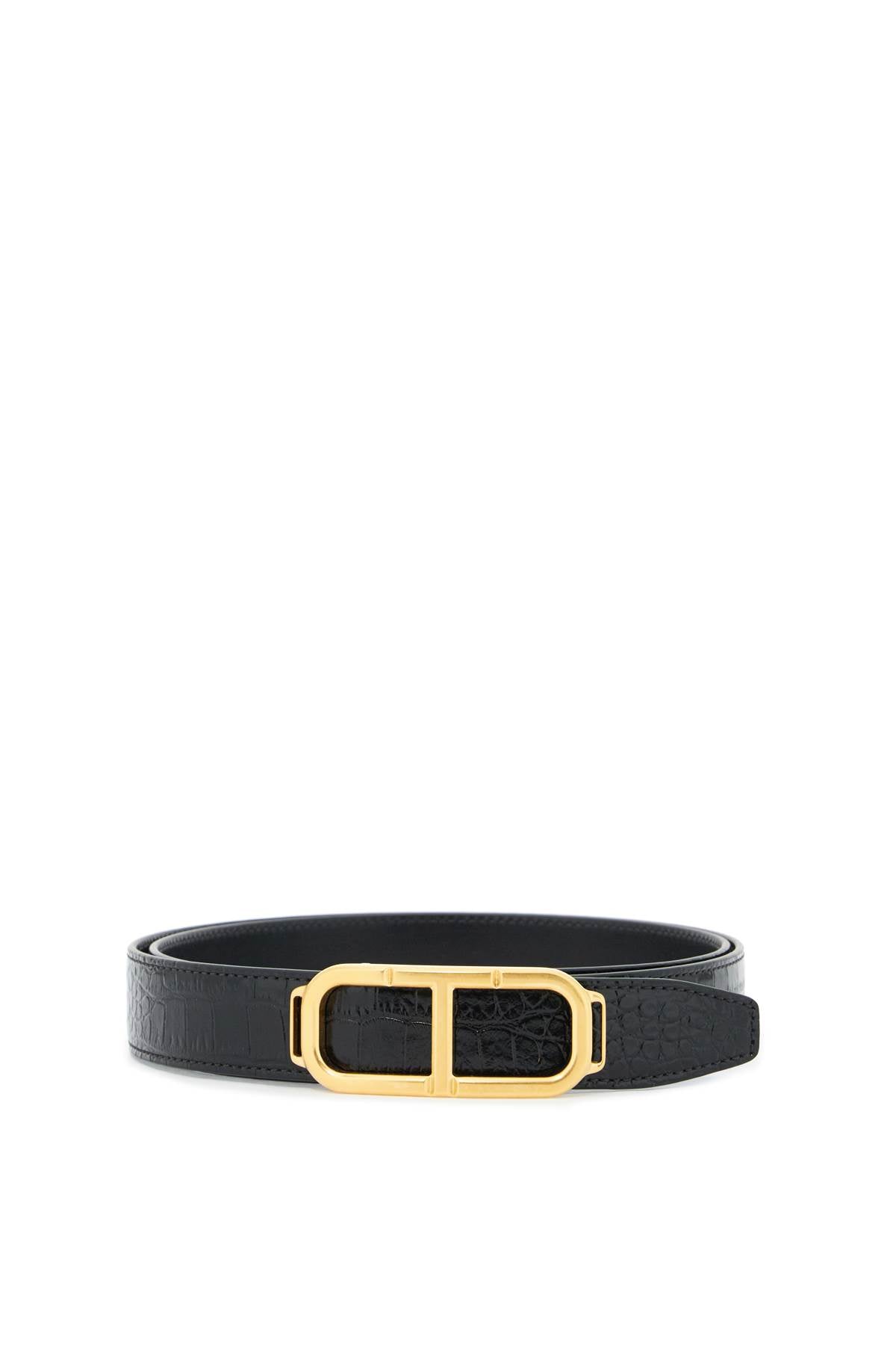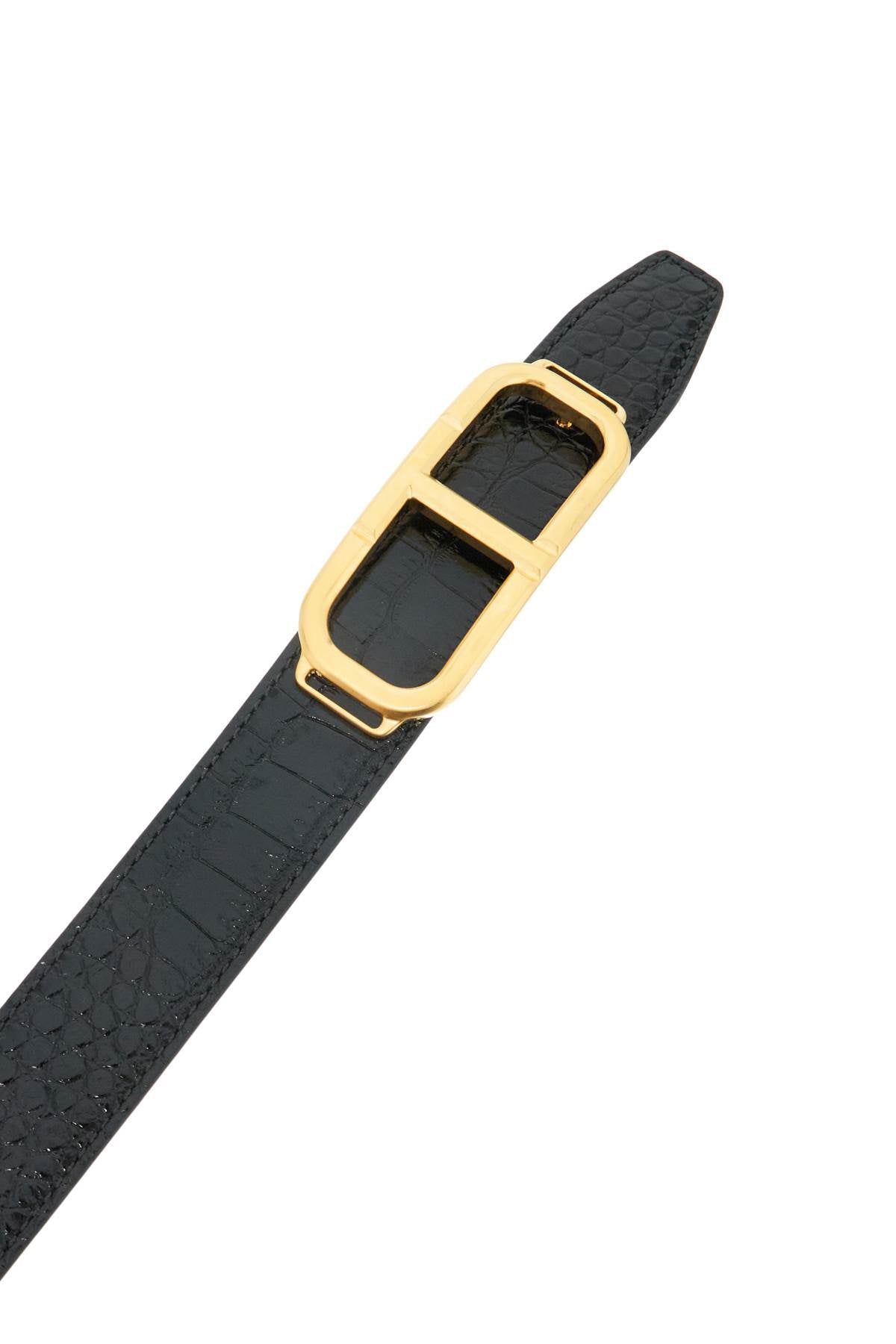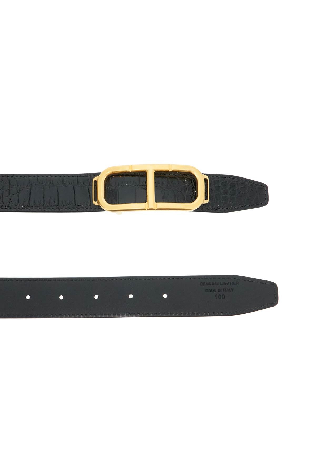 This reversible Tom Ford belt features one side in embossed crocodile leather and the other in a solid color, adorned with a square gold metal buckle stamped with the T logo. The item shown in the photo corresponds to size 100. Size and Fit - Belt Height = 3 cm,