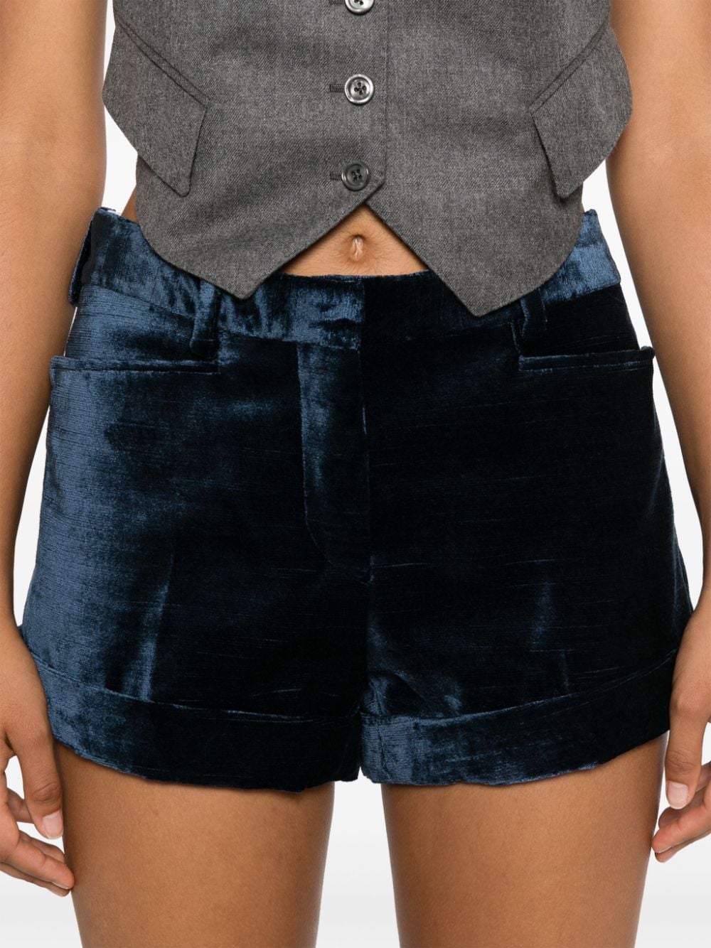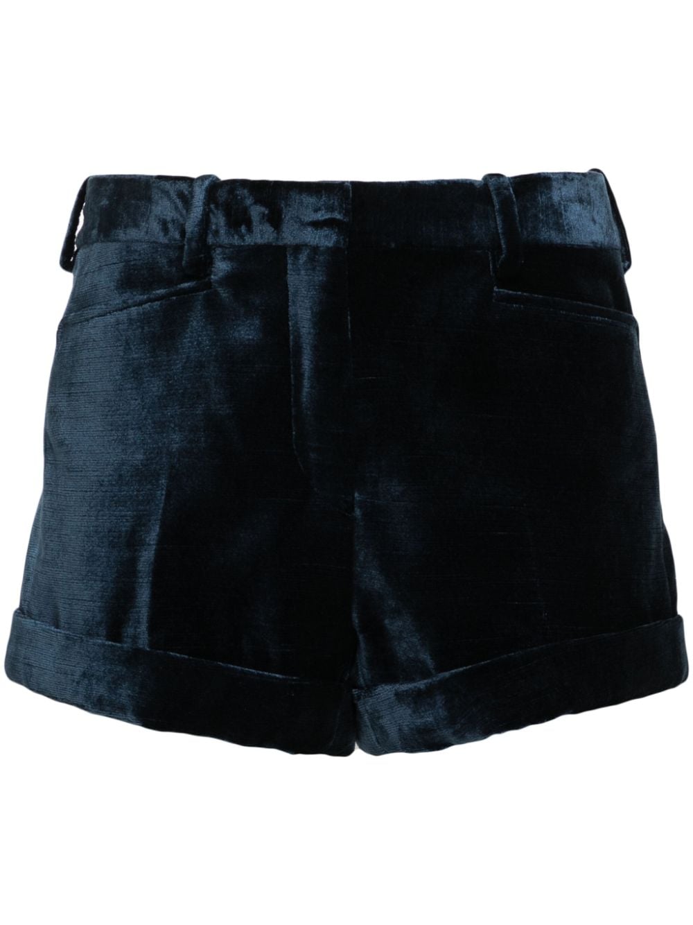 midnight blue crushed velvet concealed front button, hook and zip fastening belt loops two front jetted pockets pressed crease dart detailing faux pocket detail full lining turn-up hem thigh-length Size and Fit - This piece fits true to size. We recommend you get your regular size. Model is 1,75m / 5ft 8in wearing size 40 (IT)