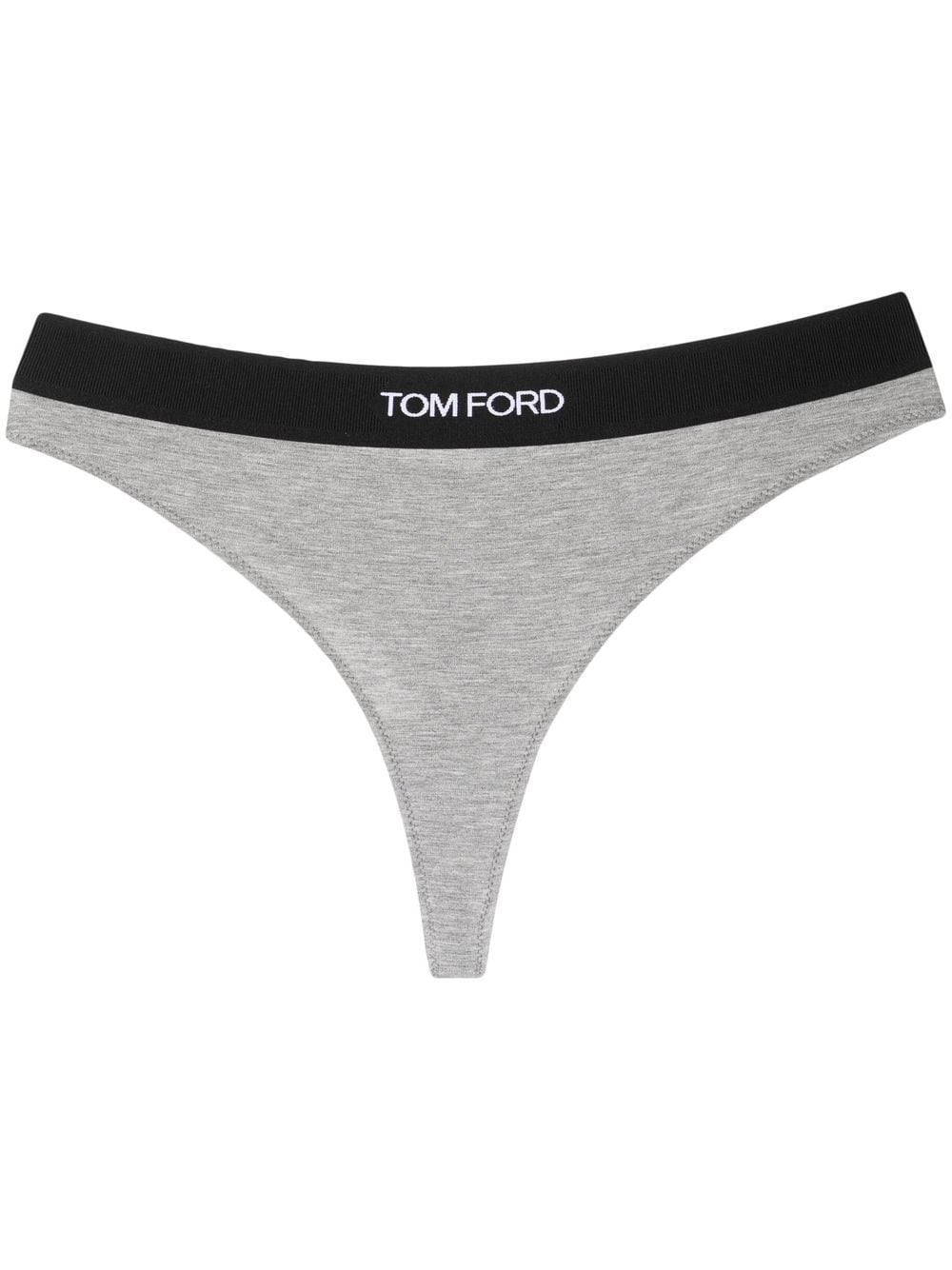 logo-waistband thong from TOM FORD featuring grey, stretch-modal, logo waistband, slip-on style and thong style. Just a reminder that this piece must be tried on over your own garments.. POSITIVELY CONSCIOUS: This Planet Conscious product contains at least 50% eco-materials, which are independently certified as or widely recognised for having a lower environmental impact..