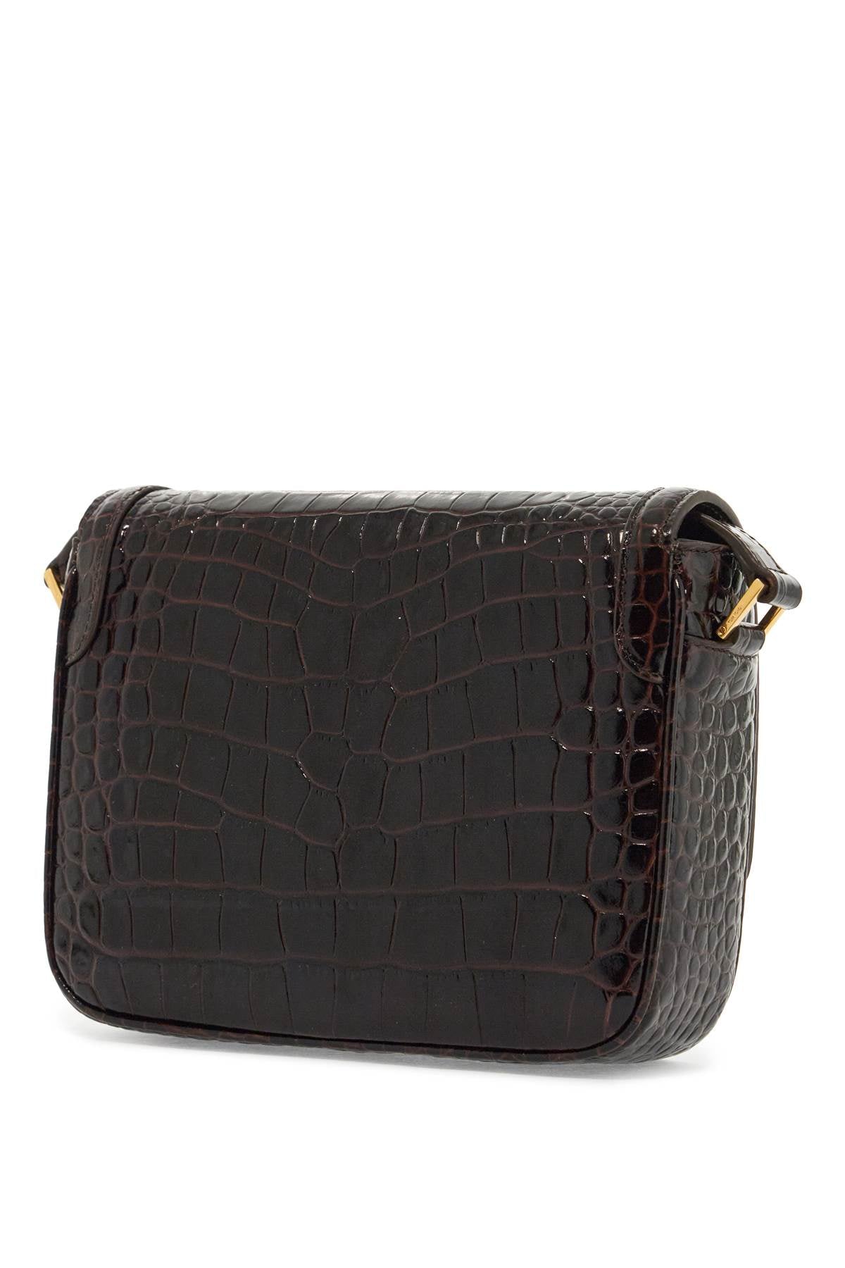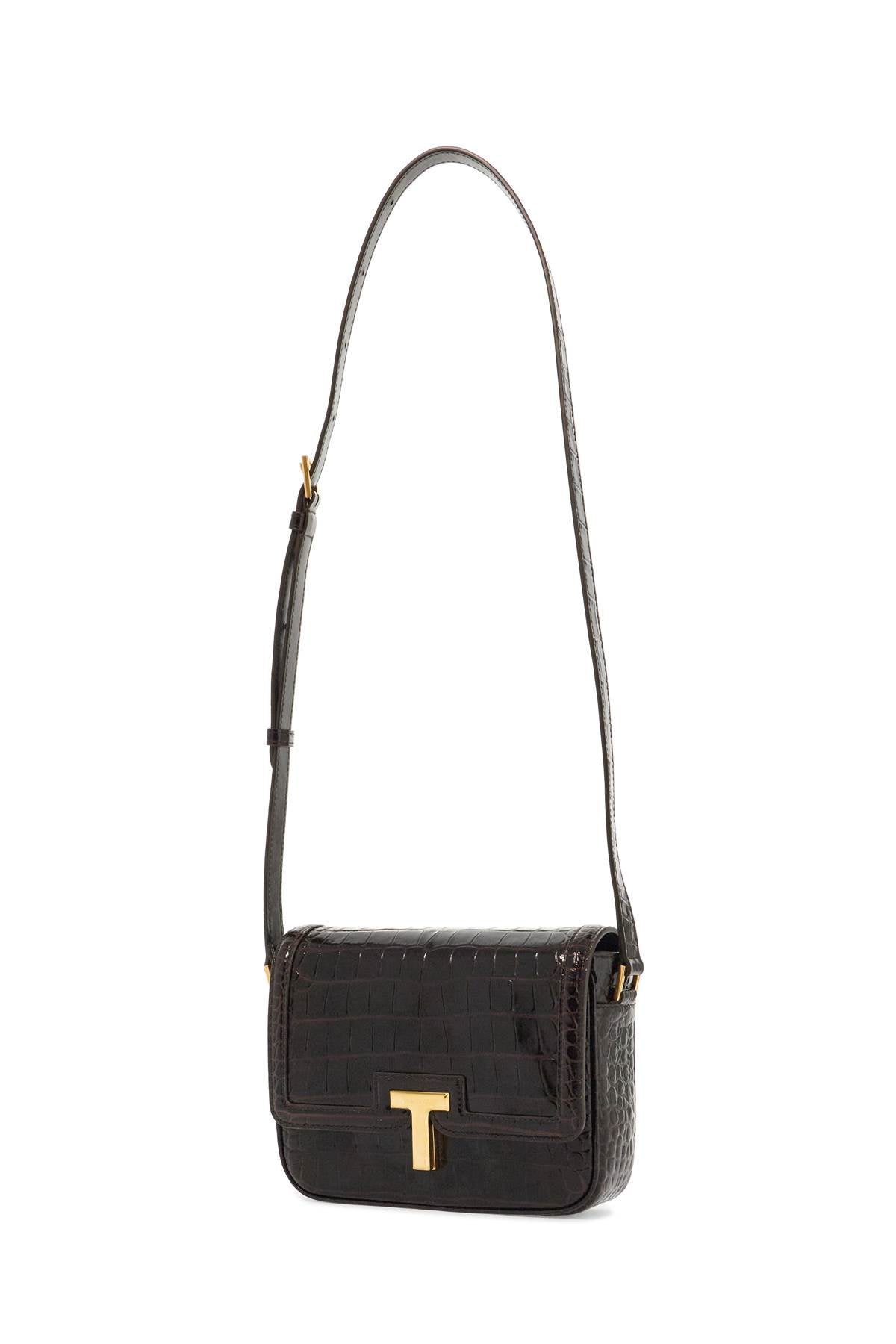 The Wallis shoulder bag by Tom Ford is made of glossy crocodile-printed leather with a golden metal T closure. The interior features smooth leather lining, a zip pocket, and an adjustable shoulder strap. The hardware is also in gold. Size and Fit - Bag Length = 21 cm, Bag Height = 16,5 cm, Bag Weight = 5,5 cm,