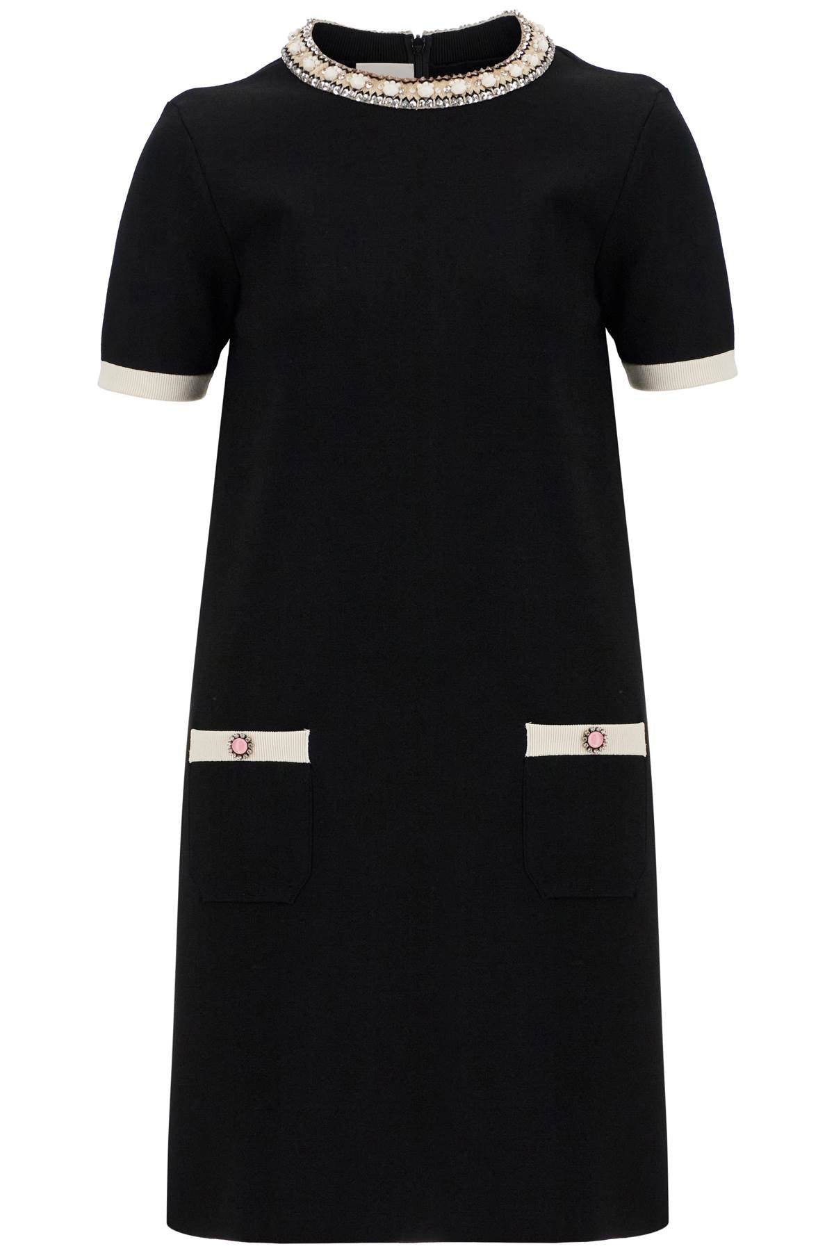The Valentino Garavani knit dress embodies timeless elegance. In polyester and viscose, with a pearl and crystal necklace, it is perfect for spring summer 2025. Sophisticated style for any occasion.