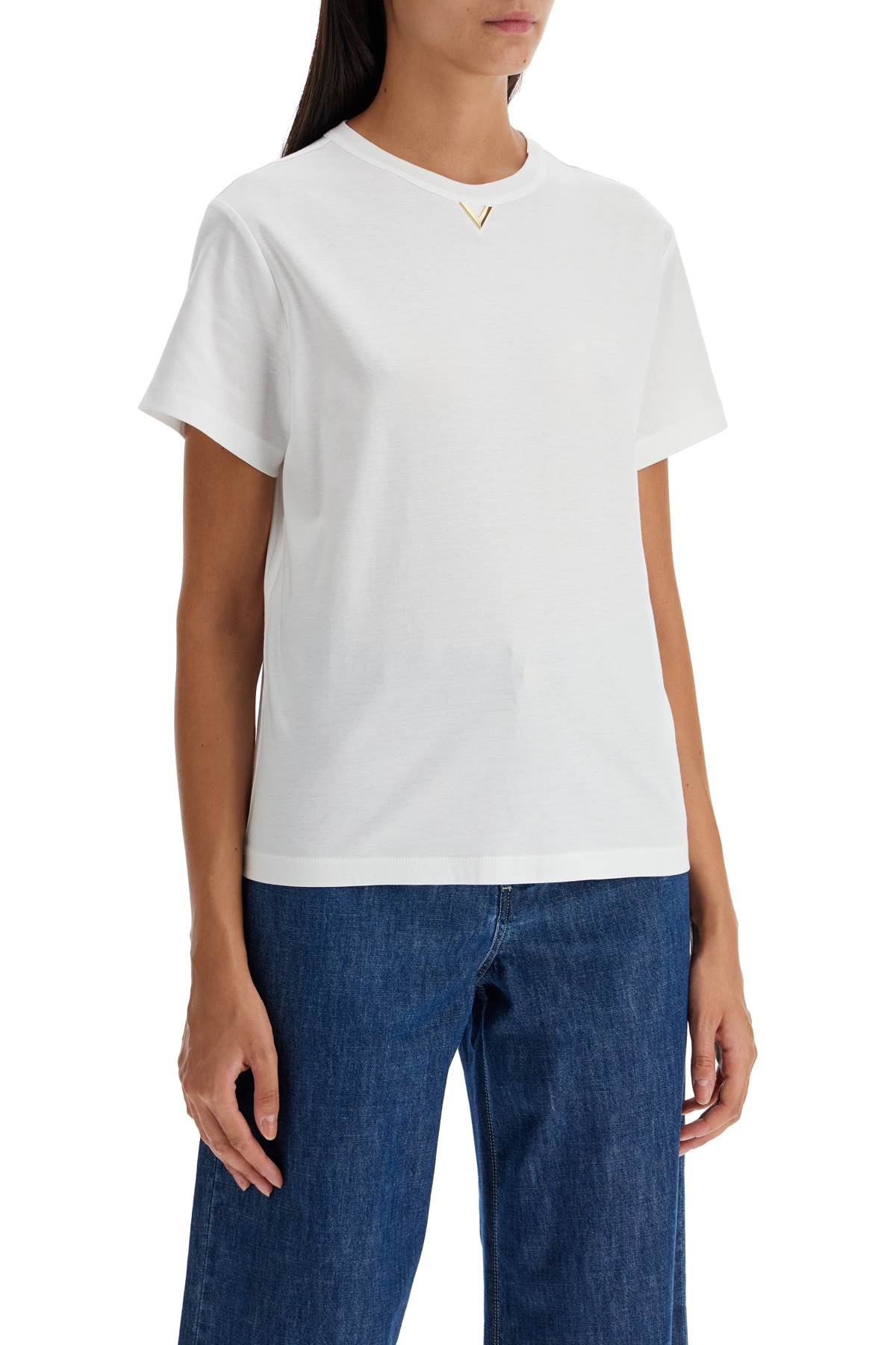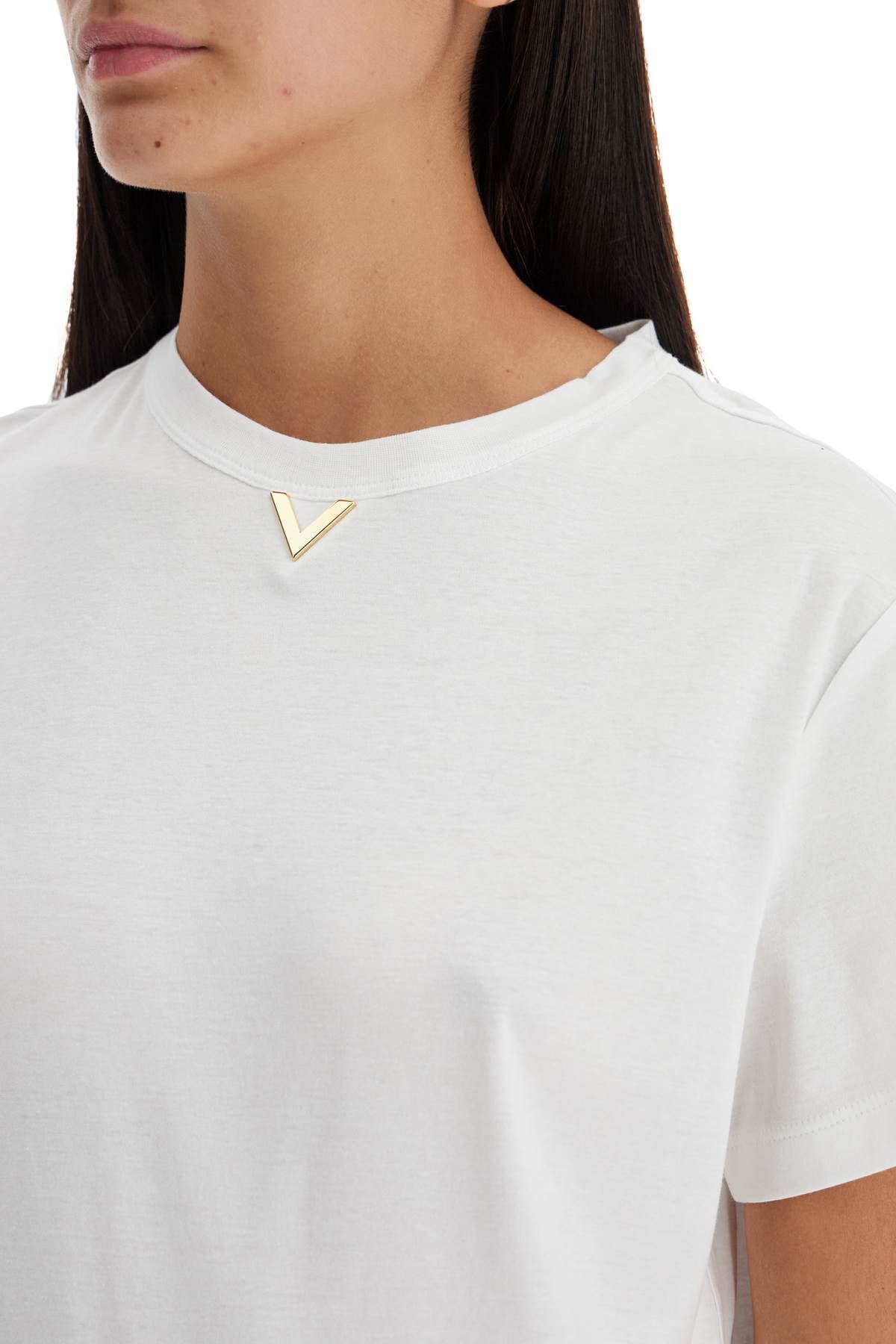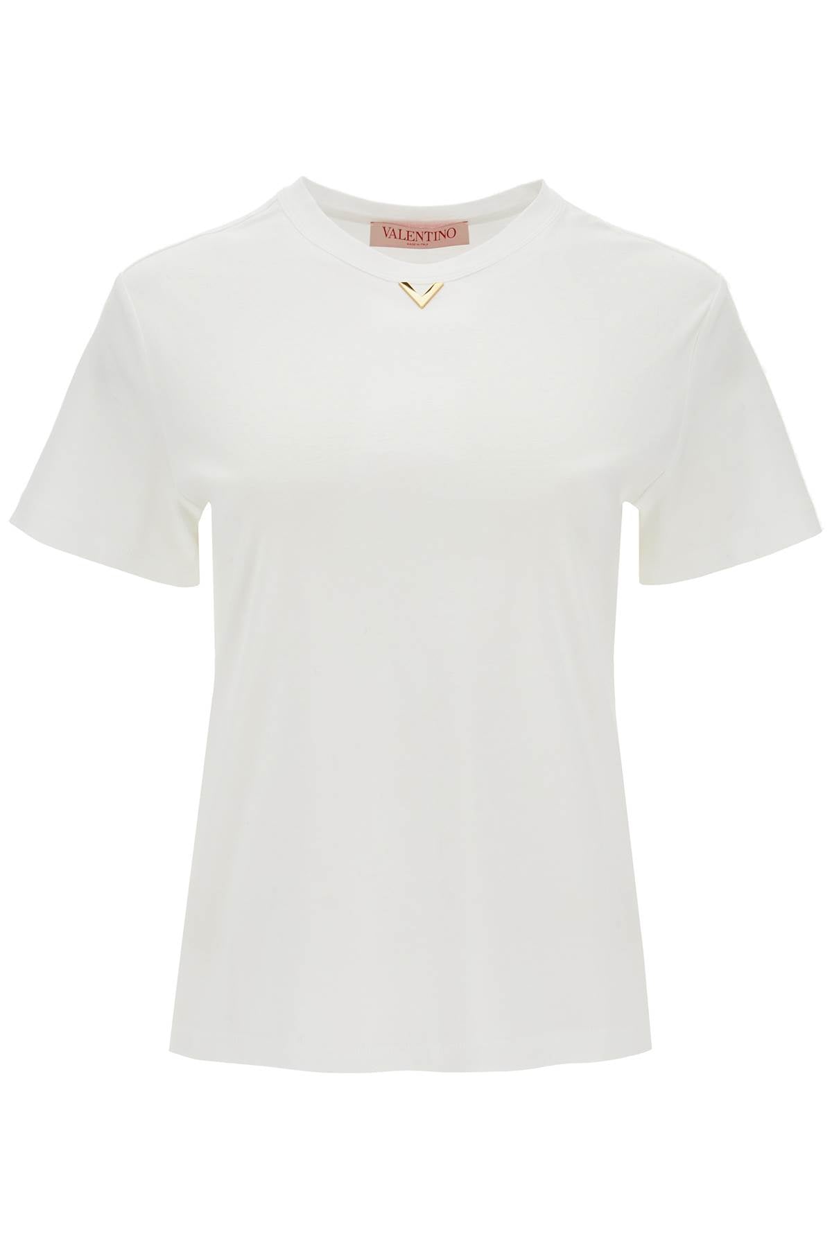 Valentino short-sleeved t-shirt in soft cotton jersey with a round neckline embellished by the V Gold detail. Comfortable fit. The model is 177 cm tall and wears size S.